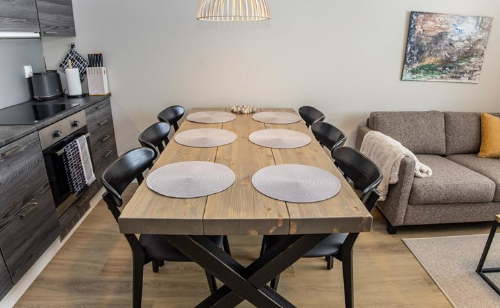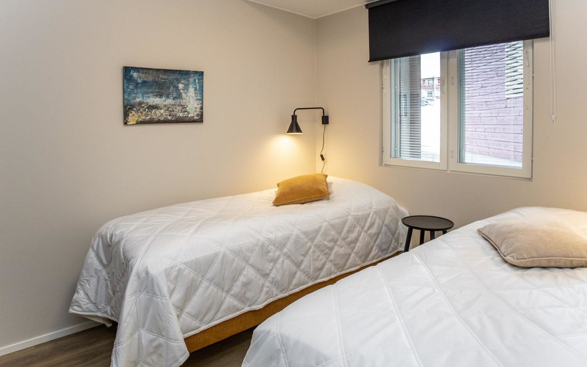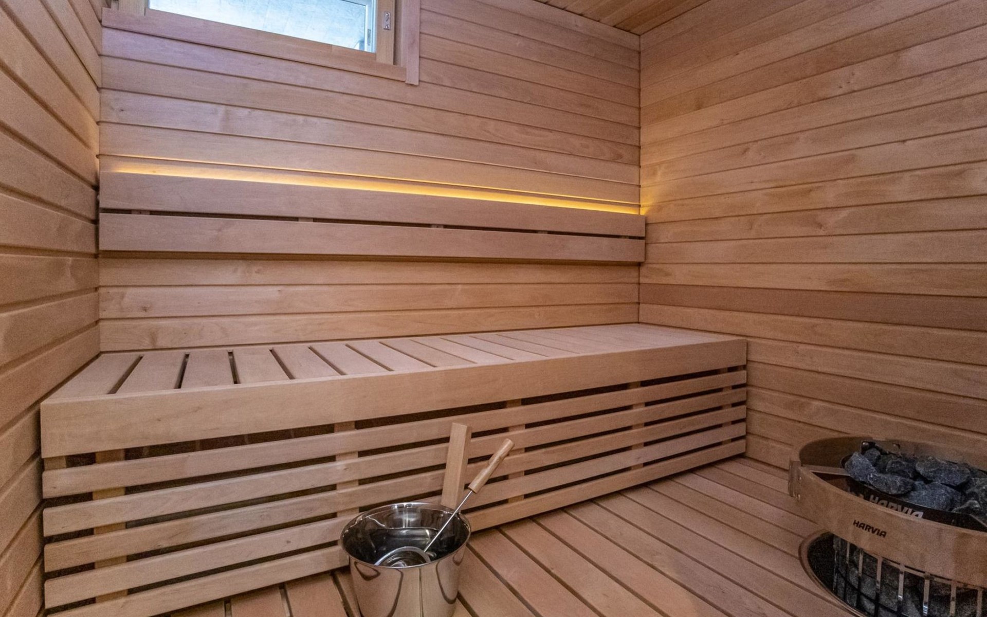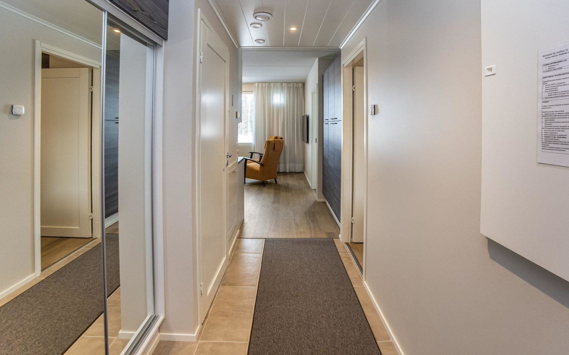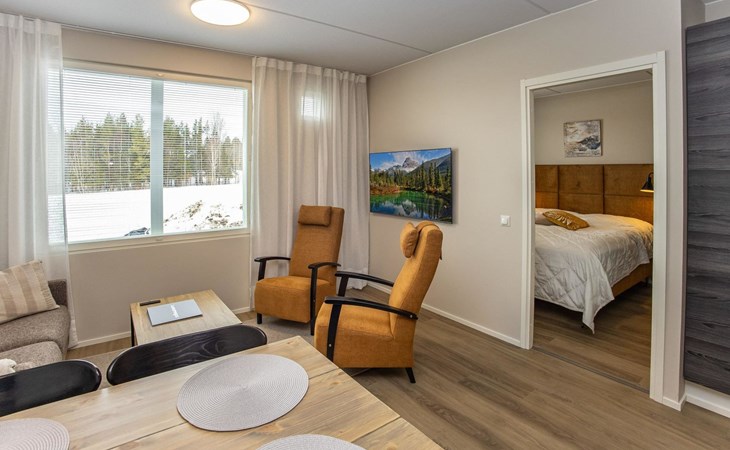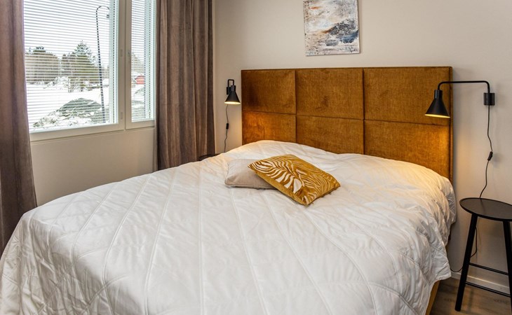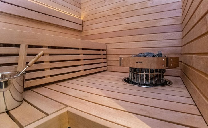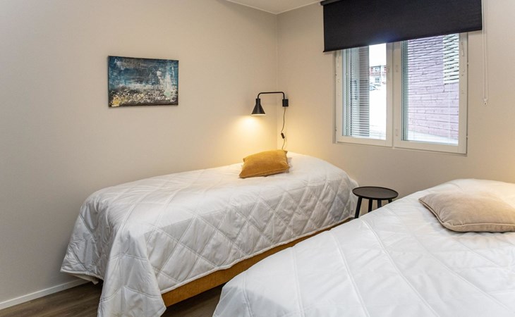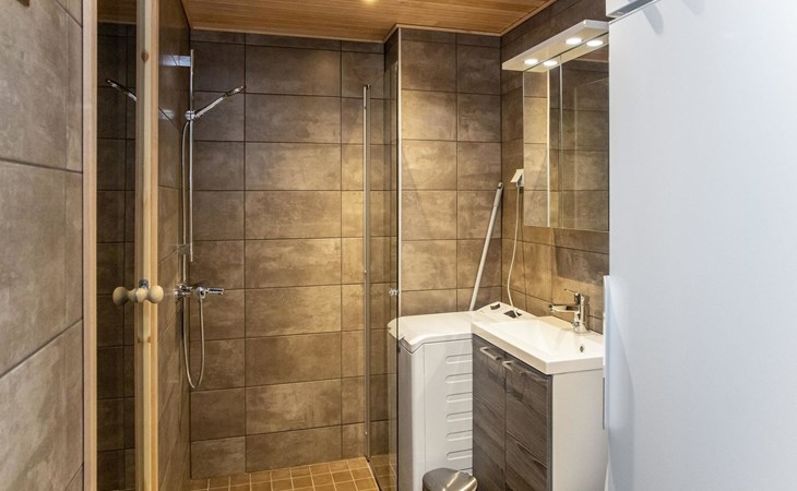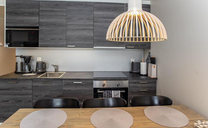 The apartment is equipped with three spacious bedrooms, one with a double bed and the other two with separate 90 cm wide beds, a spacious kitchen, and a living area. Additionally, there is a private sauna, a bathroom, and a separate WC.