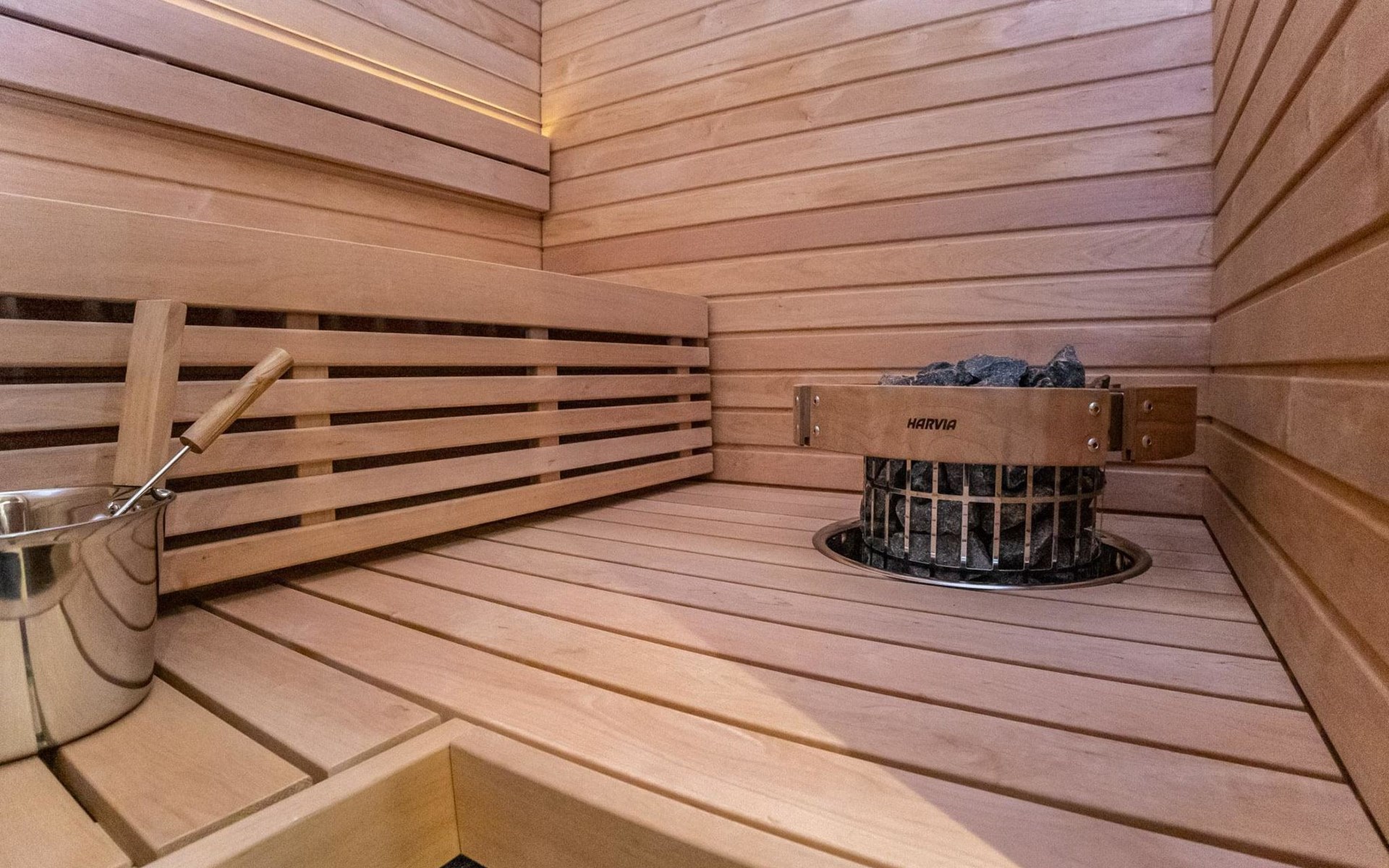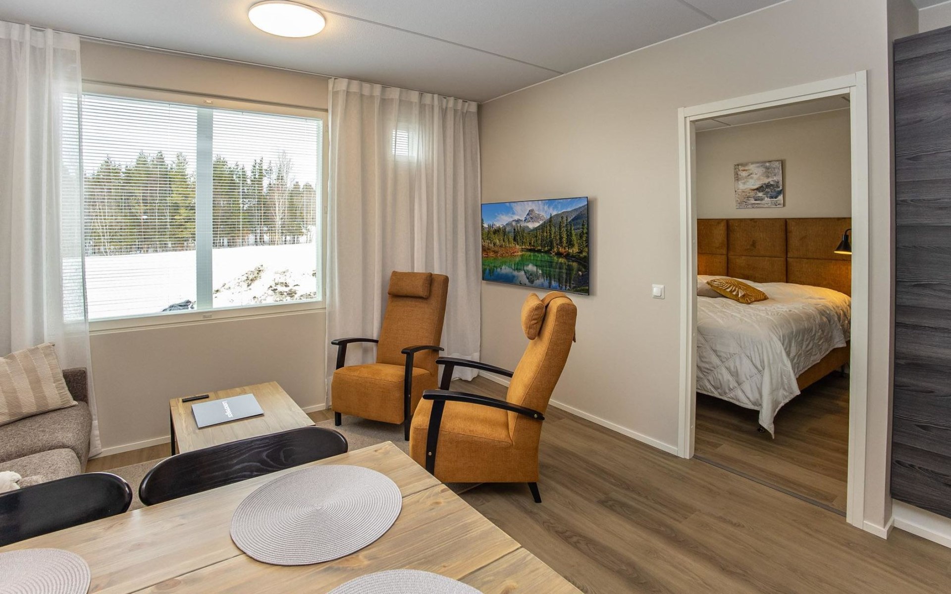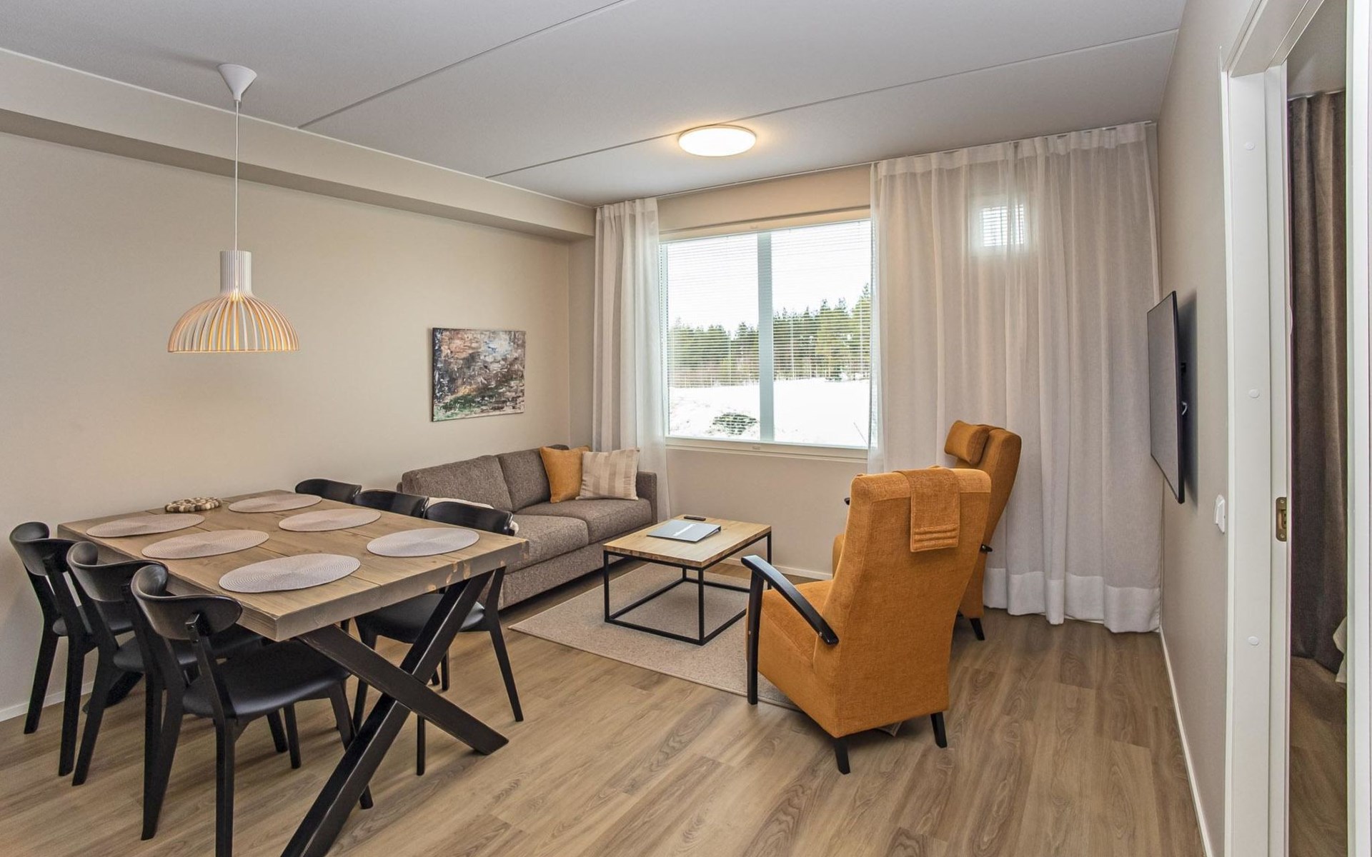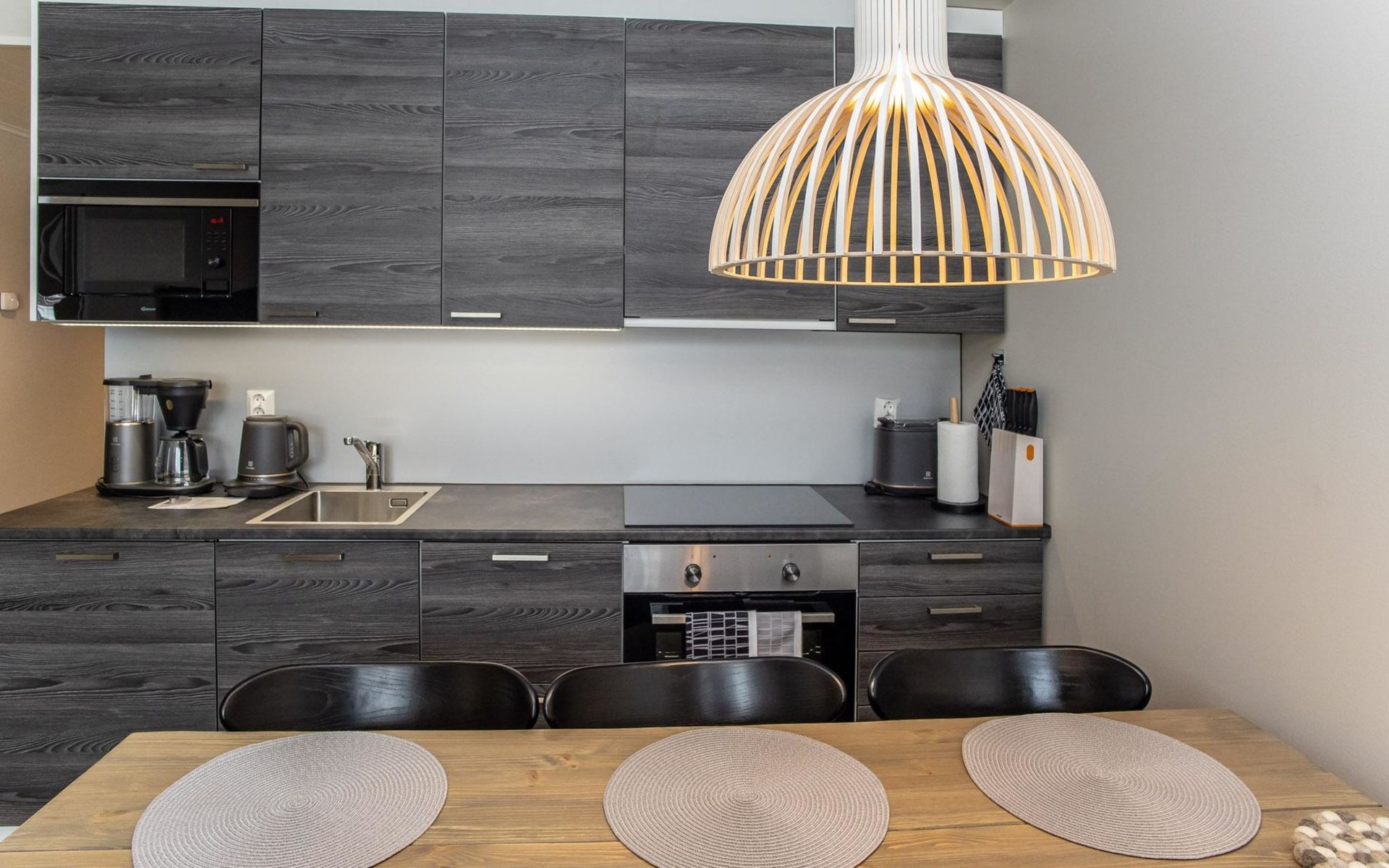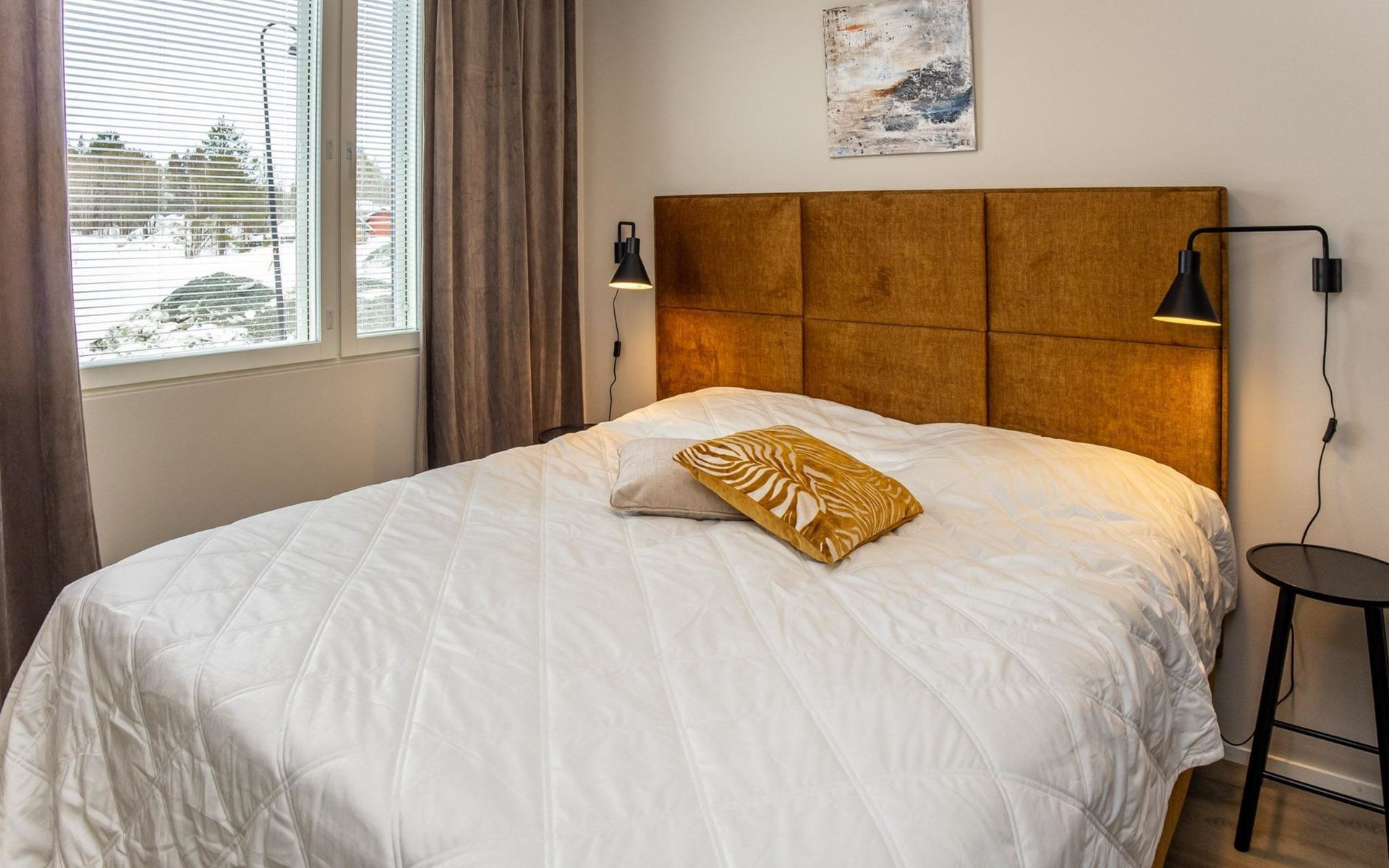 The apartment is equipped with three spacious bedrooms, one with a double bed and the other two with separate 90 cm wide beds, a spacious kitchen, and a living area. Additionally, there is a private sauna, a bathroom, and a separate WC.
