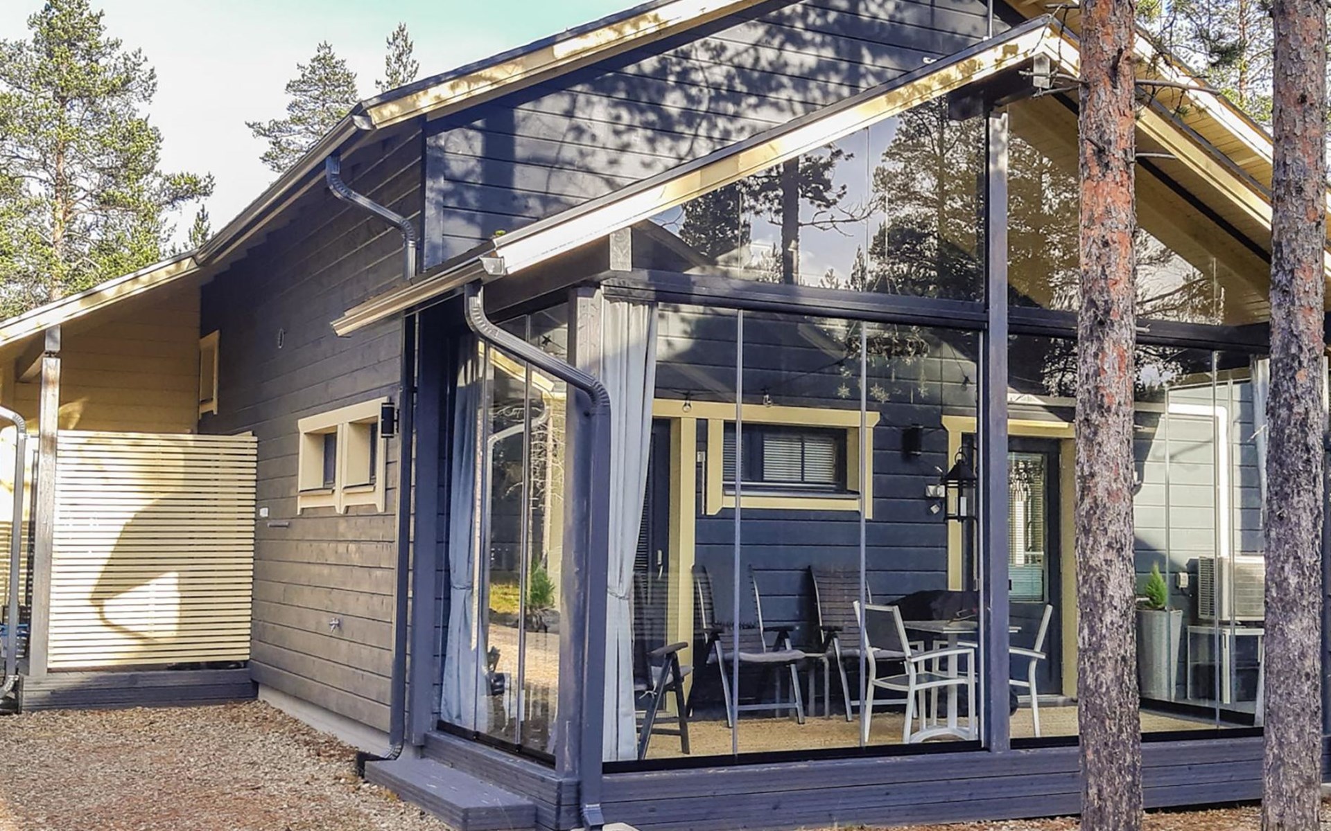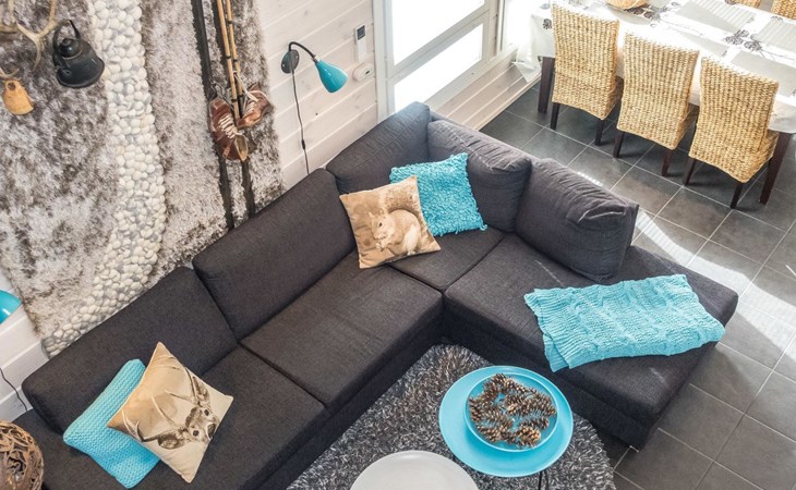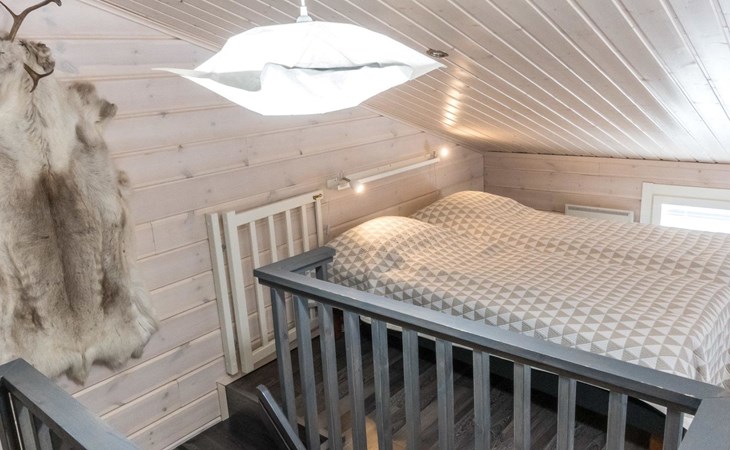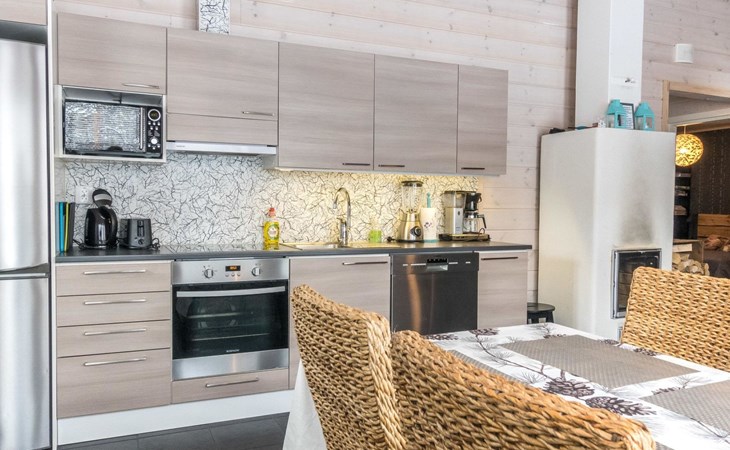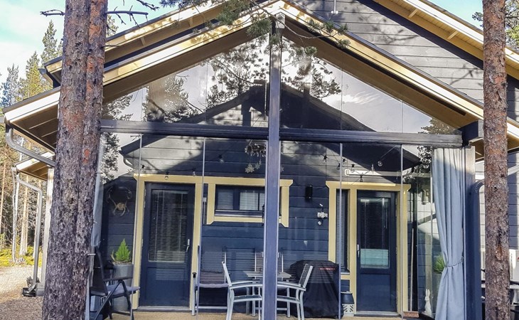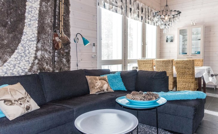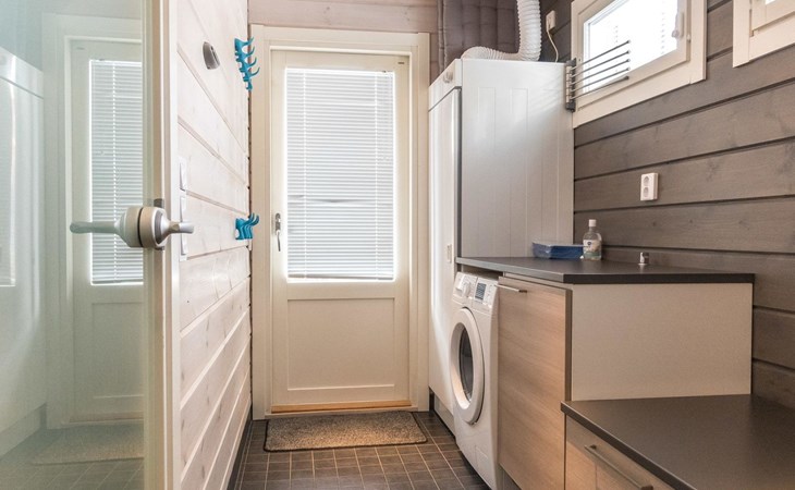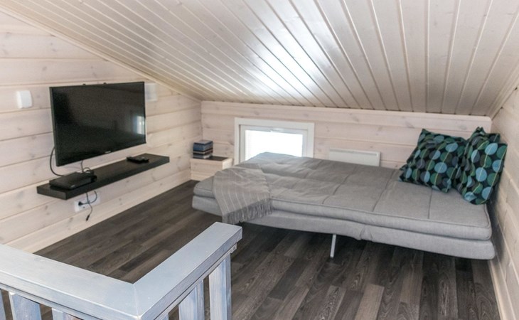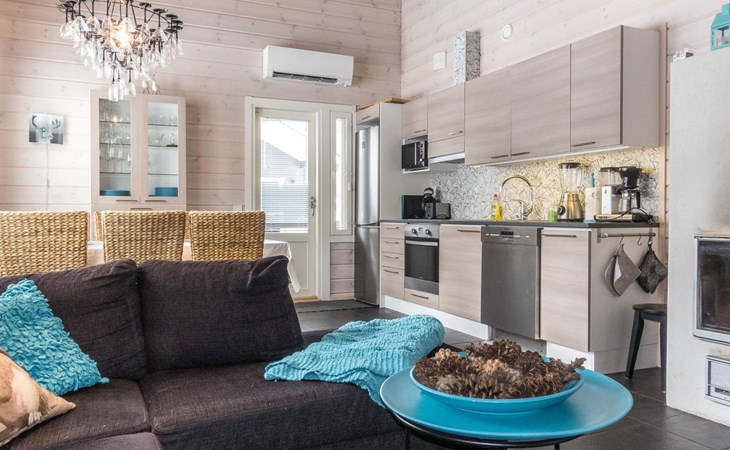 Semi-detached house (log paneled), built in 2014. Kitchen-living room, 2 bedrooms, each with 2 single beds (which are made as double beds), loft 2 single beds, sauna (electric stove), bathroom (2 showers), utility room / dressing room.