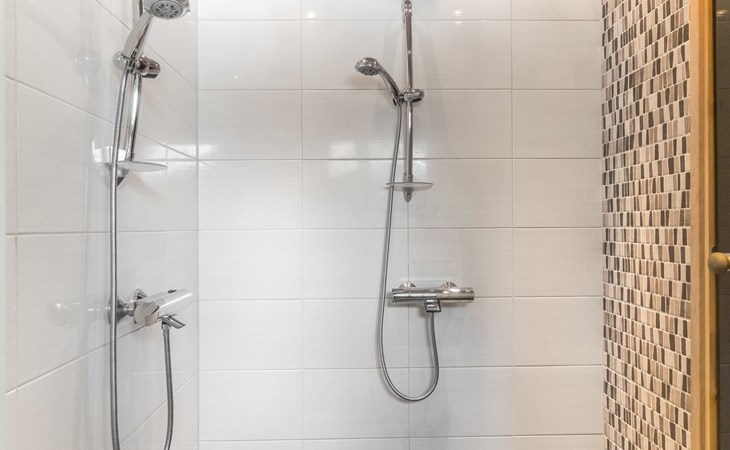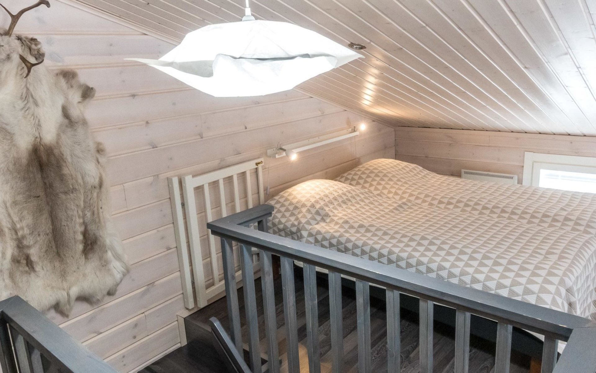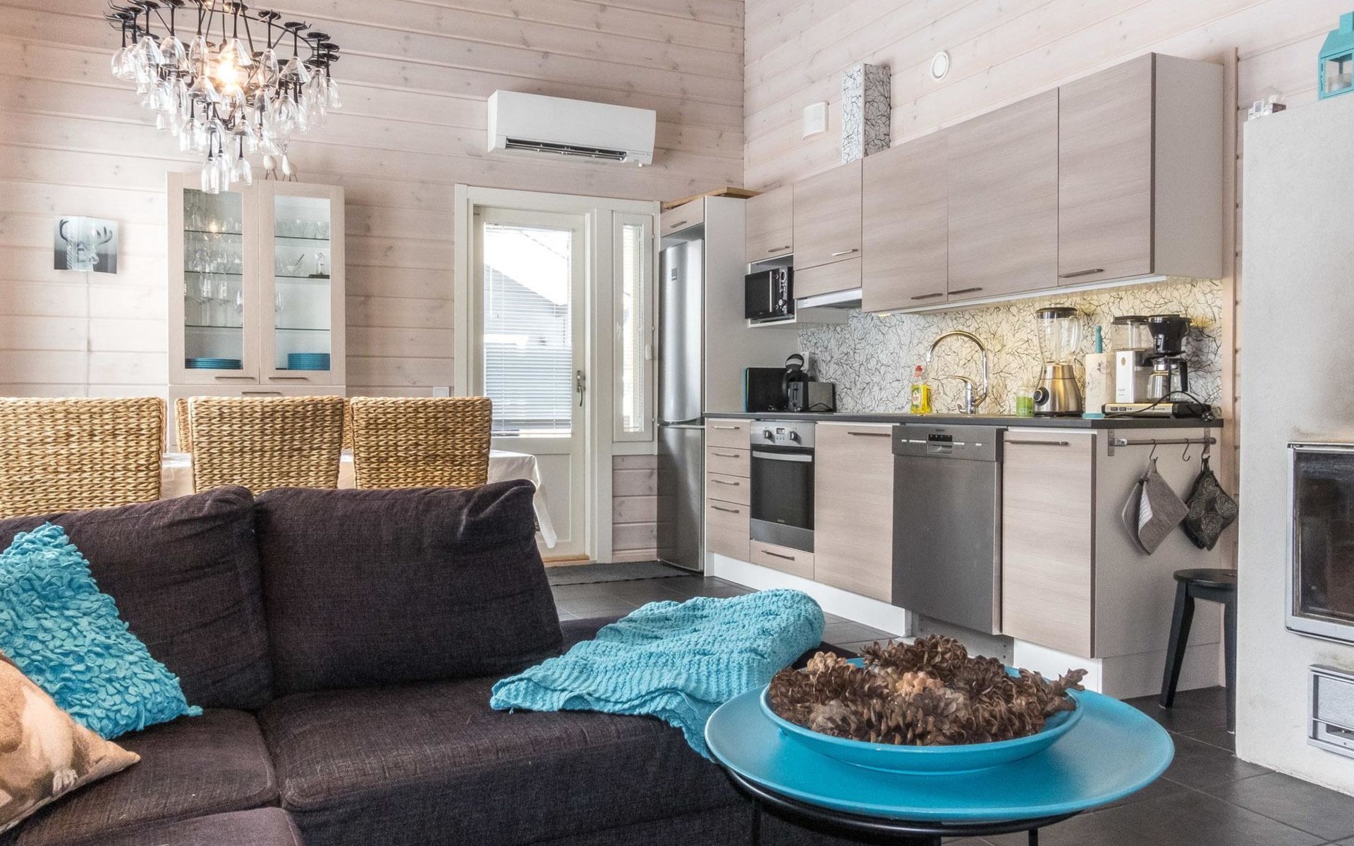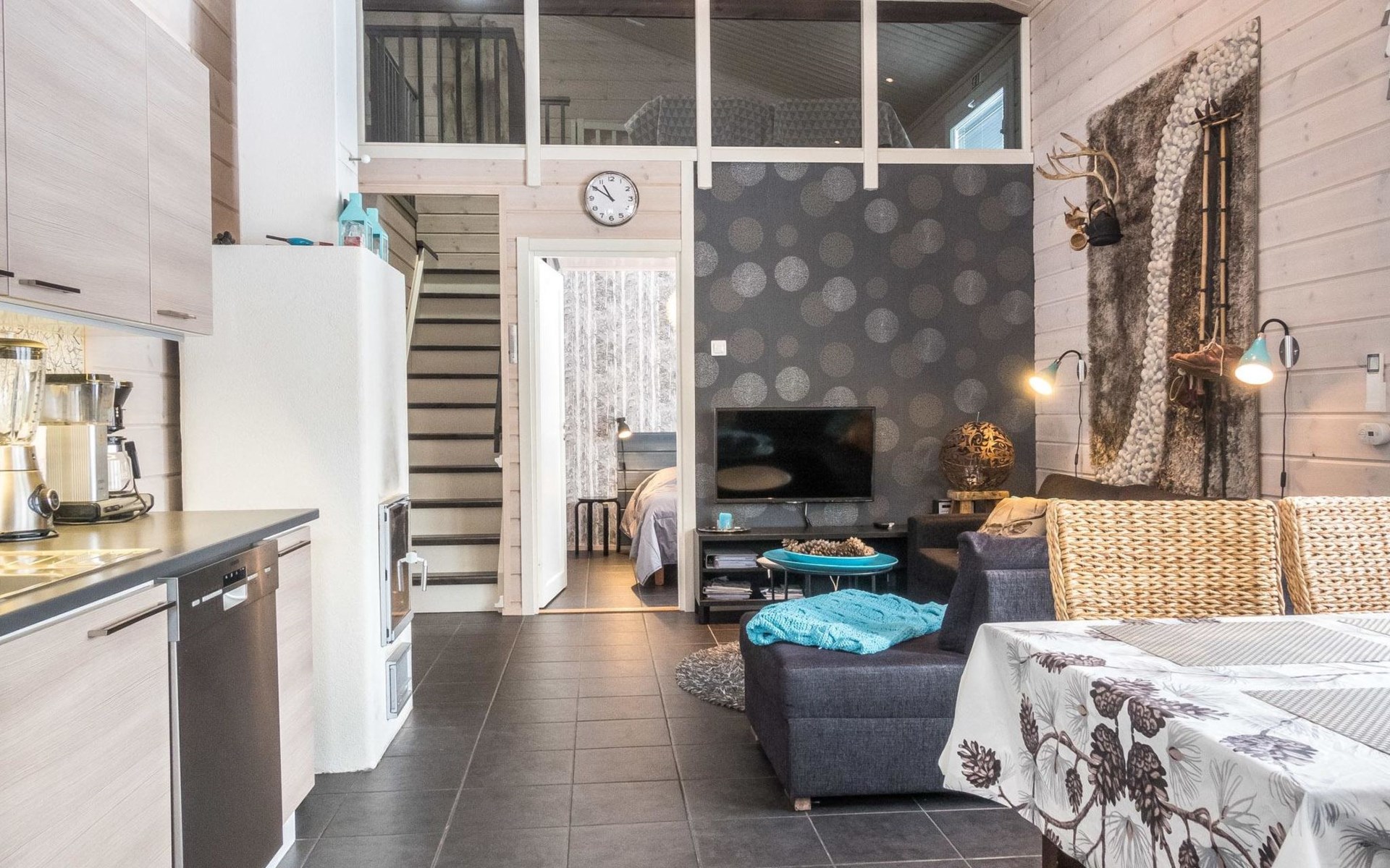 Semi-detached house (log paneled), built in 2014. Kitchen-living room, 2 bedrooms, each with 2 single beds (which are made as double beds), loft 2 single beds, sauna (electric stove), bathroom (2 showers), utility room / dressing room.