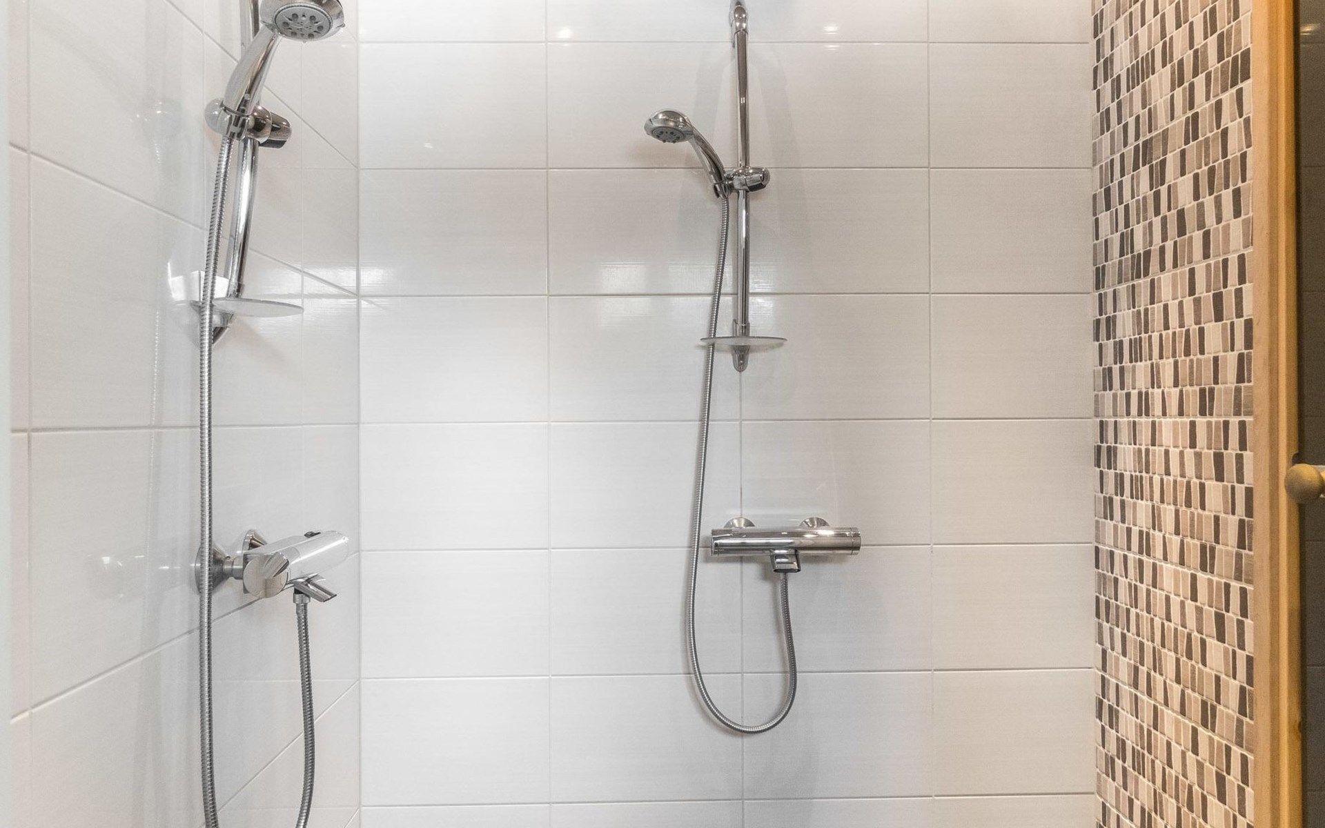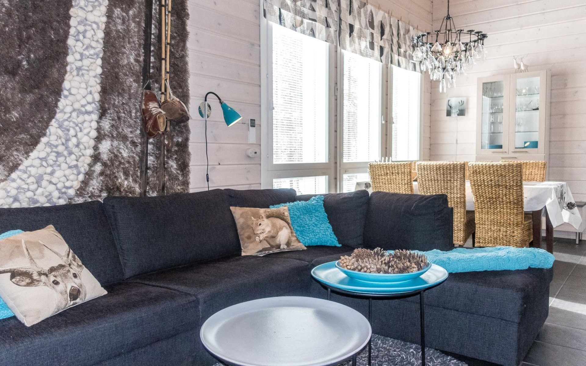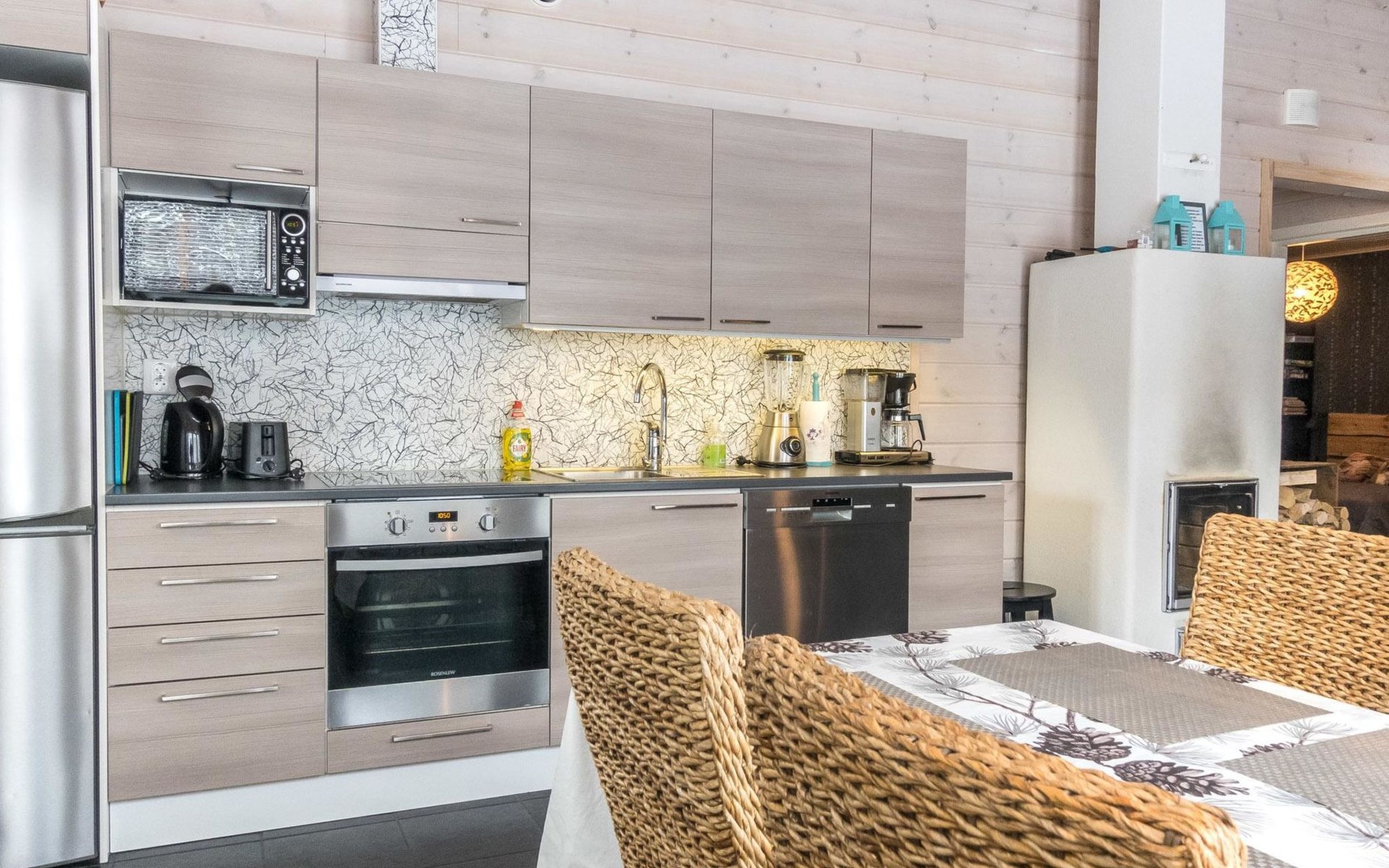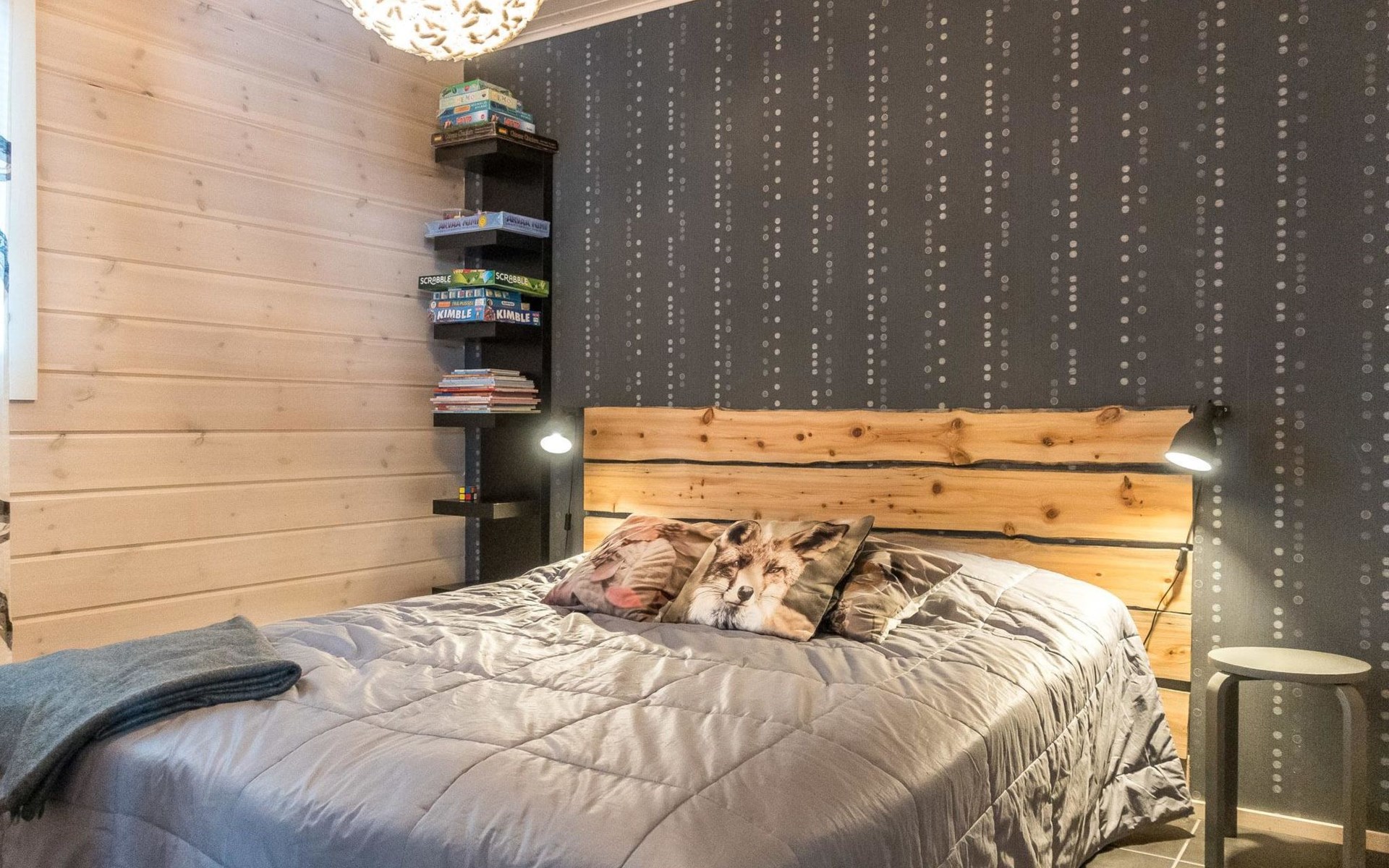 Semi-detached house (log paneled), built in 2014. Kitchen-living room, 2 bedrooms, each with 2 single beds (which are made as double beds), loft 2 single beds, sauna (electric stove), bathroom (2 showers), utility room / dressing room.