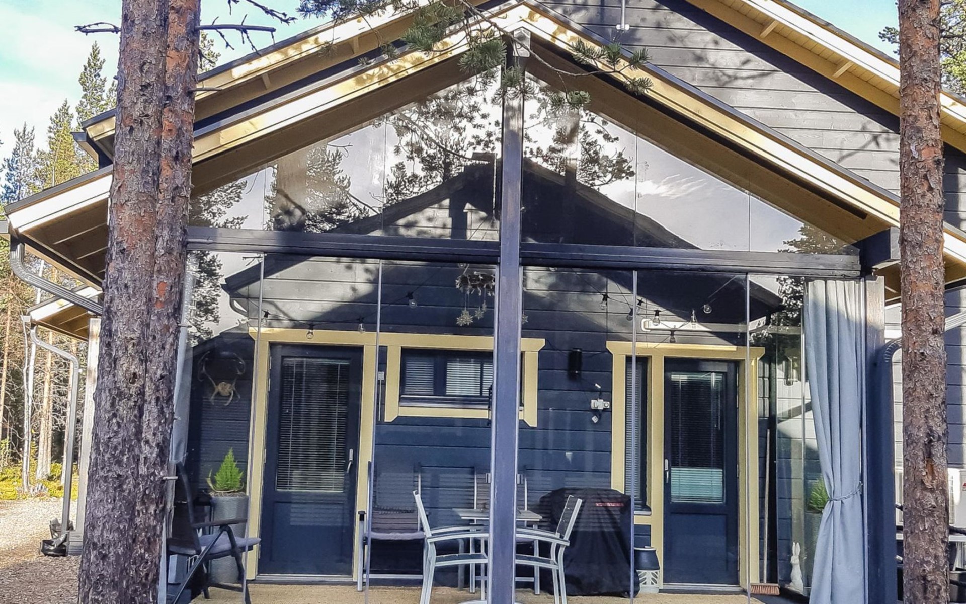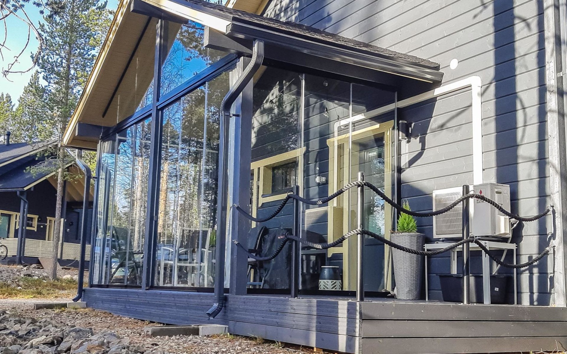 Toboggan and kicksledge. Gas powered Muurikka Summer Kitchen on the terrace, in use in May-September.