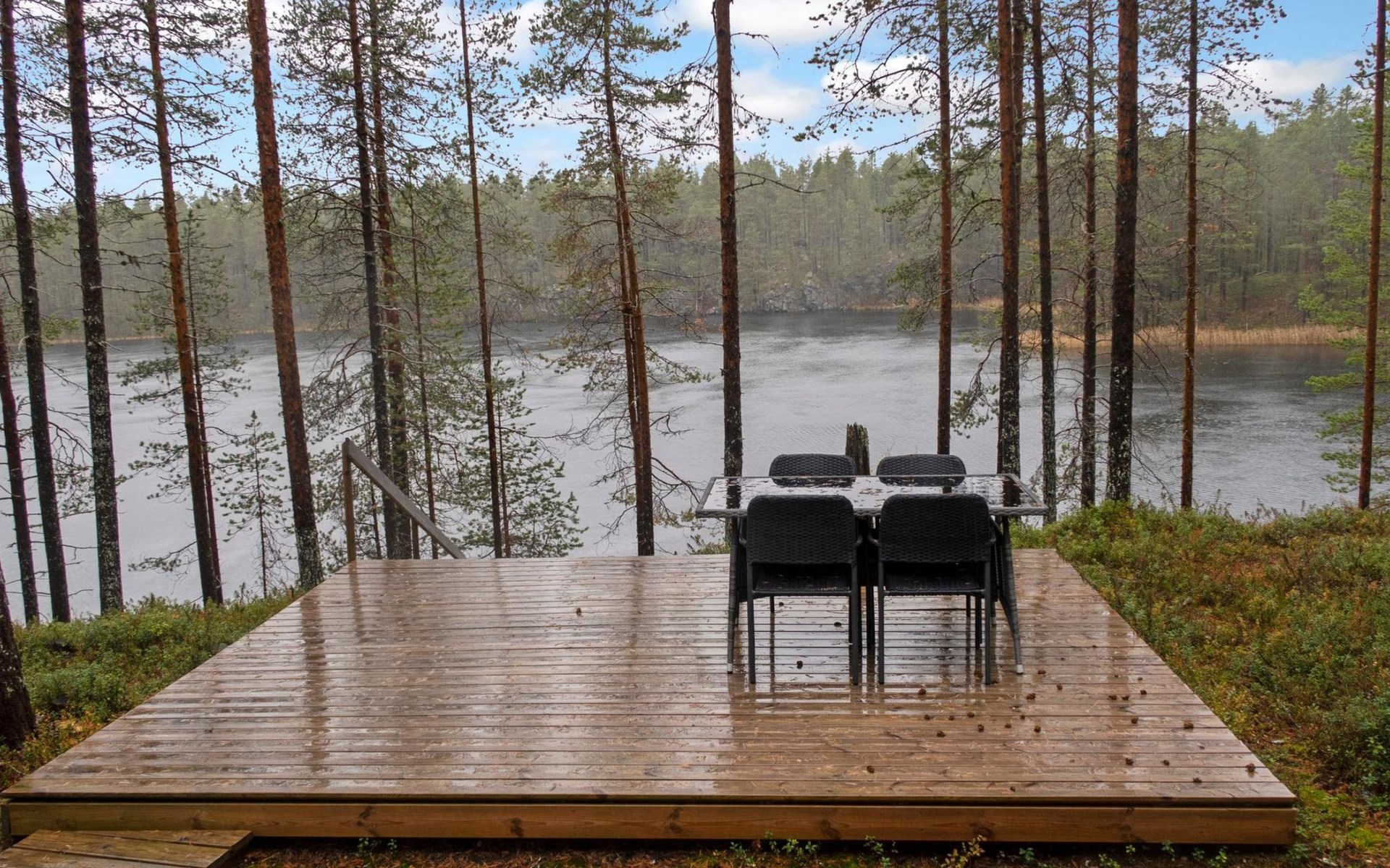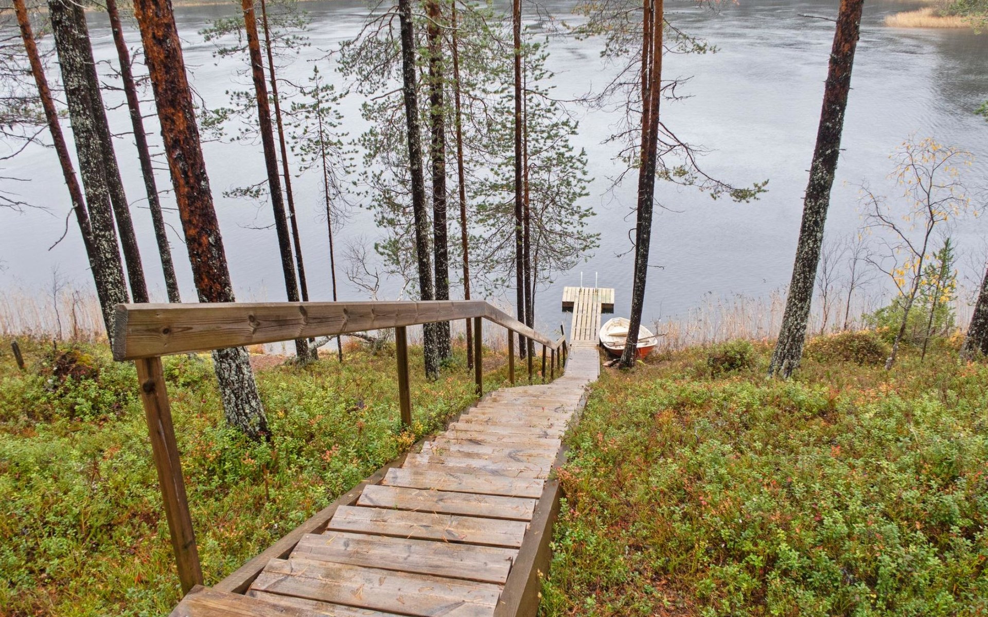 In the yard, there is a patio with furniture and covered cooking area. Steep hill with stairs to the beach. Pier and rowing boat on the beach.