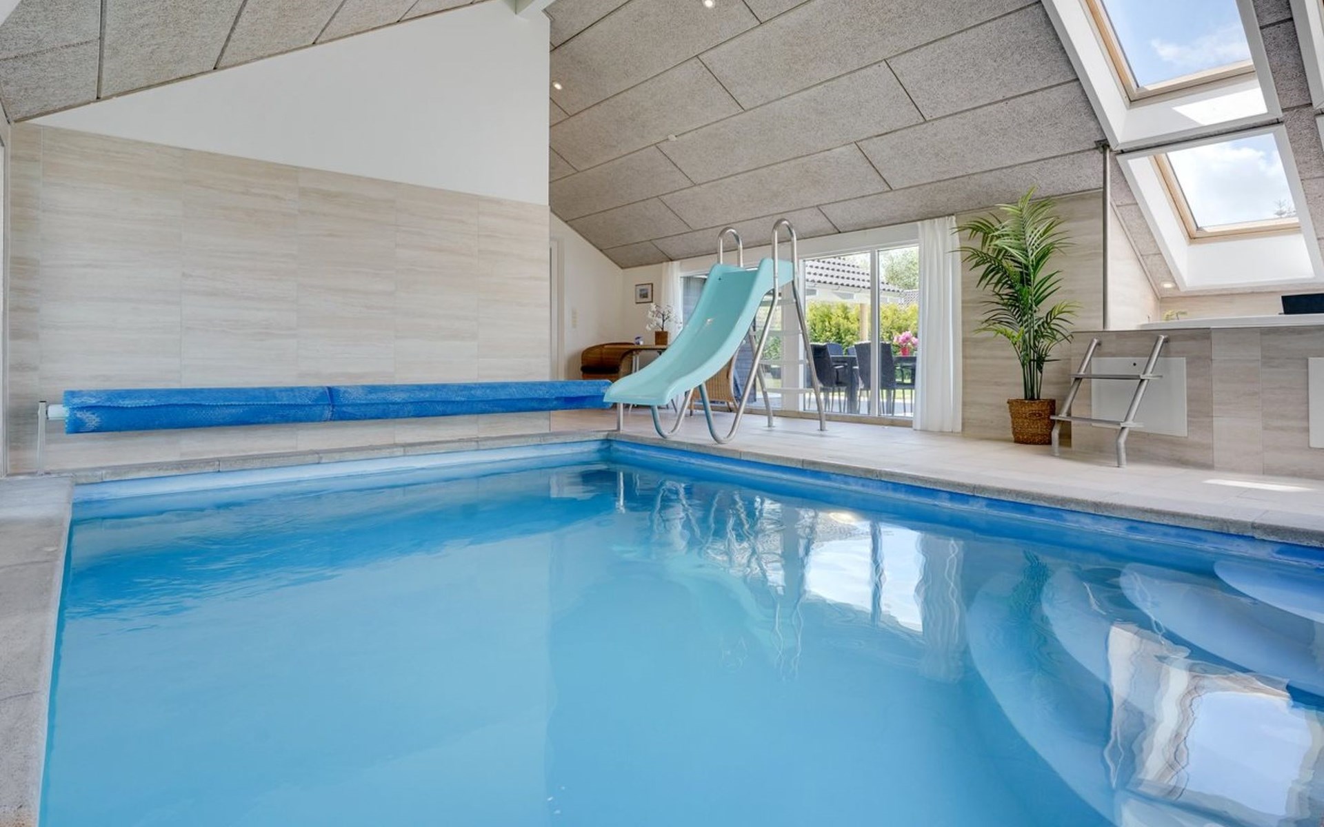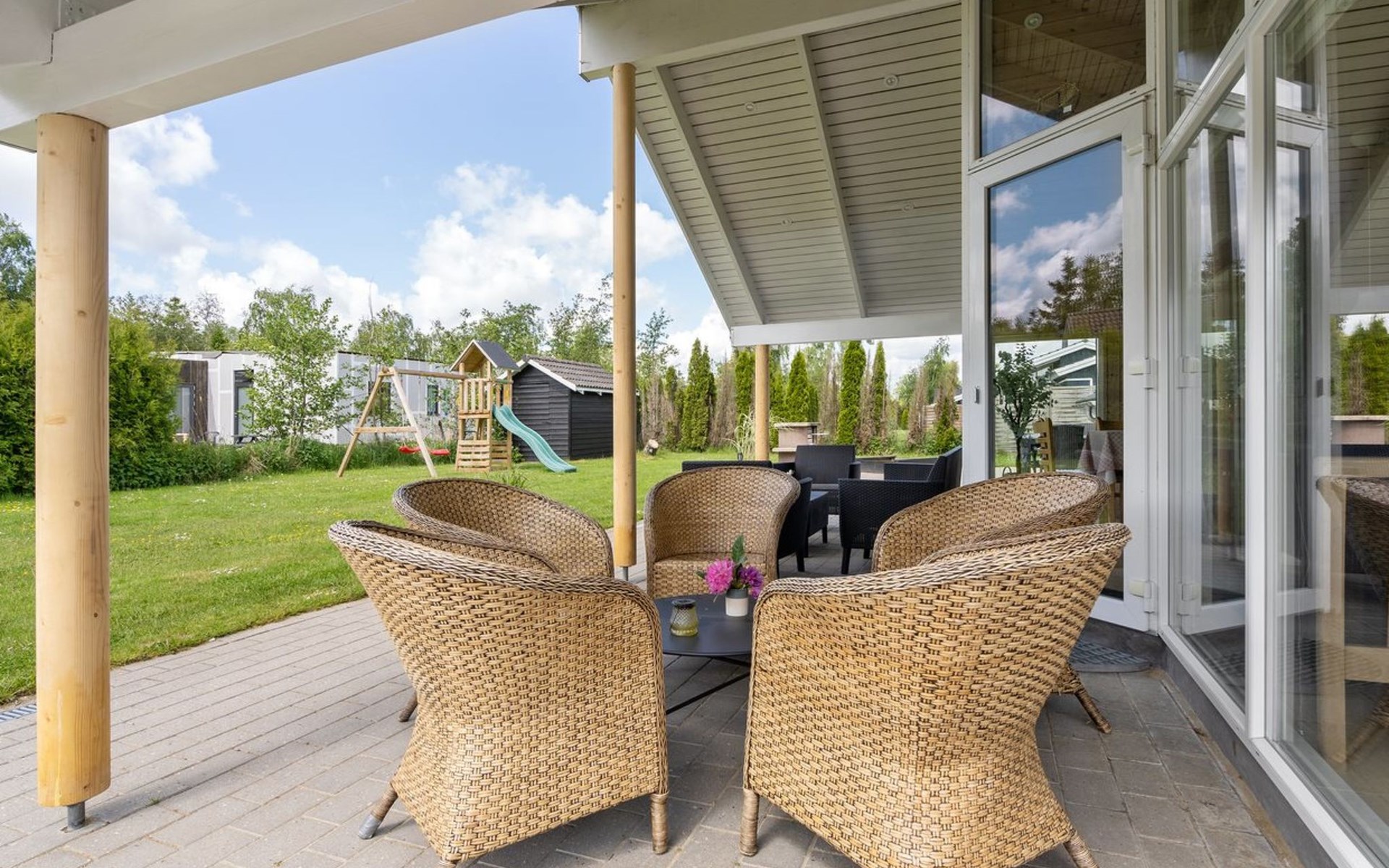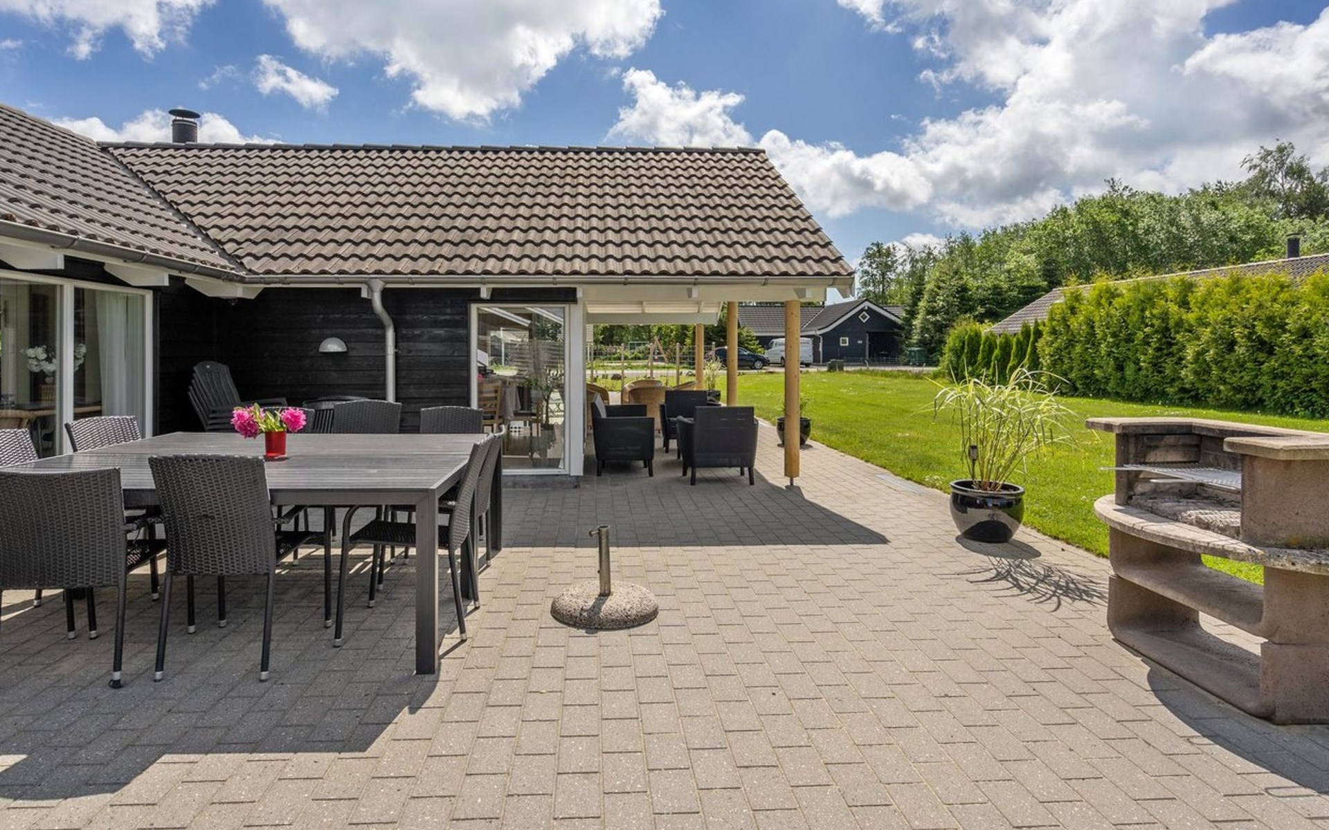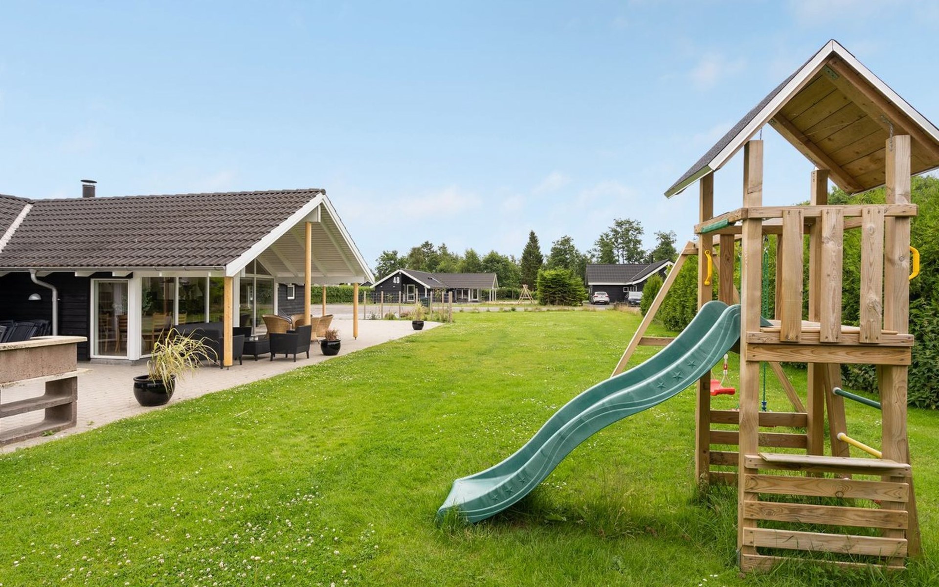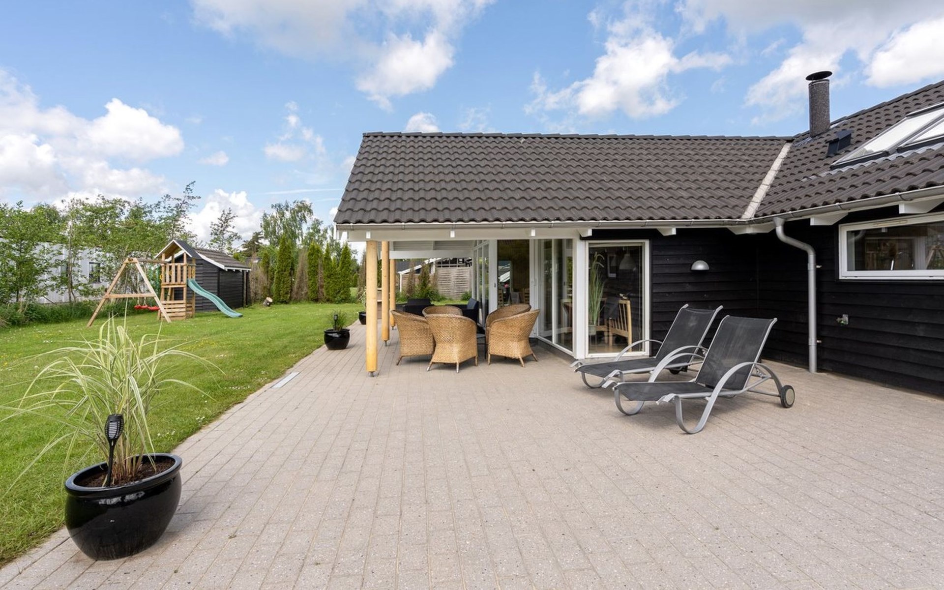 Eengezinswoning, bouwjaar 2006. 800 m van zee. Voor alleengebruik: terrein 1.200 m2, verzorgde tuin, overdekt zwembad. Terras (80 m2), kinderspeelplaats (schommel). In het huis: sauna, tafelvoetbal, wasmachine, droger. Parkeerplaats bij het huis. Levensmiddelenwinkel 300 m. Golfterrein 1.5 km. De eigenaar accepteert geen jeugdgroepen.