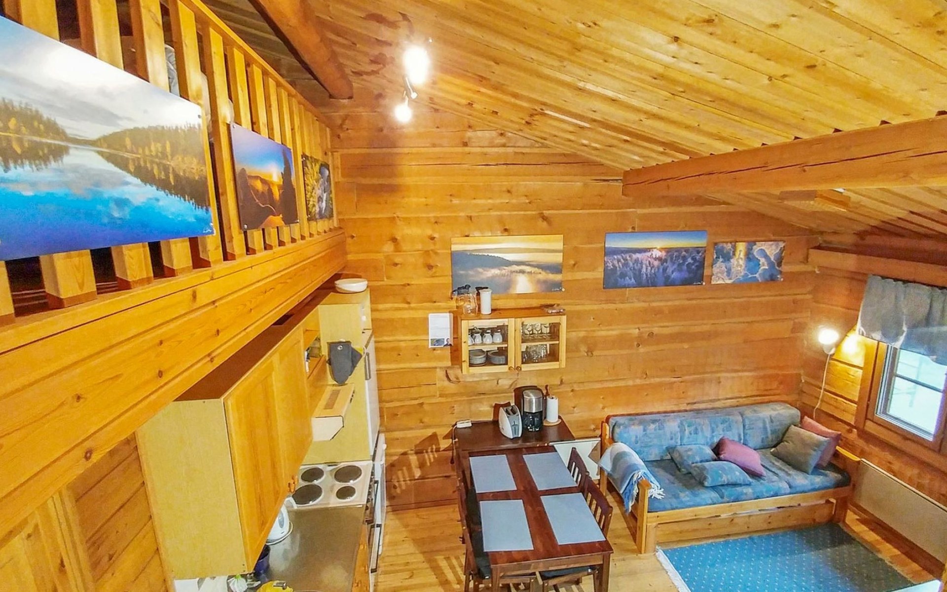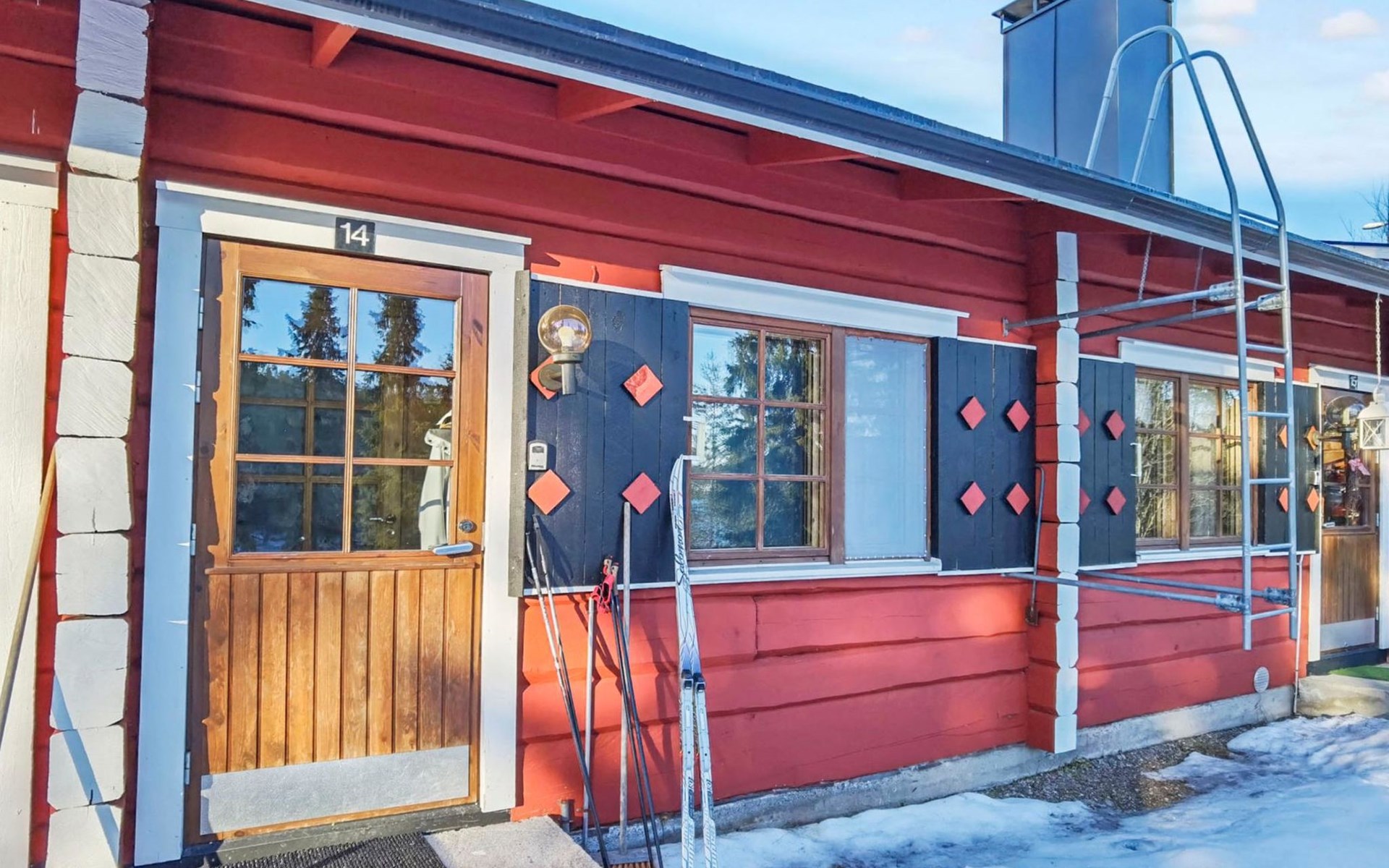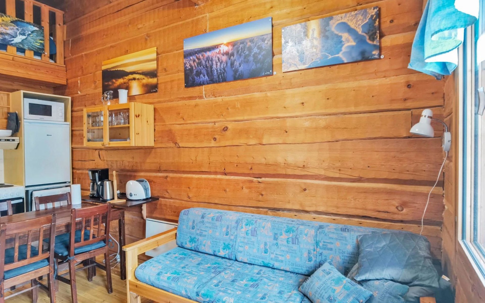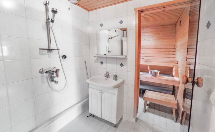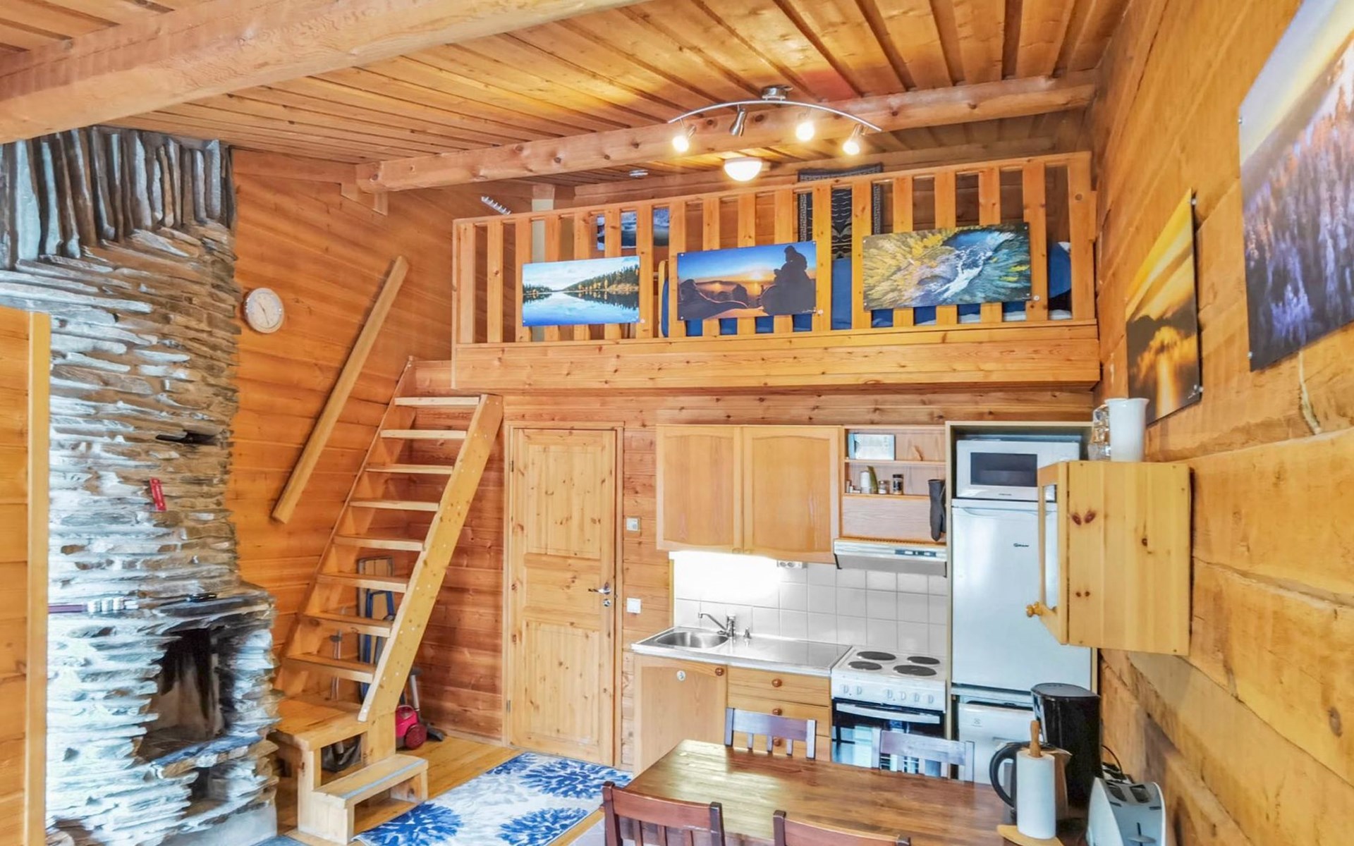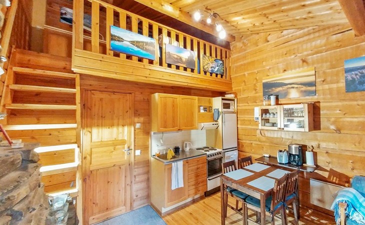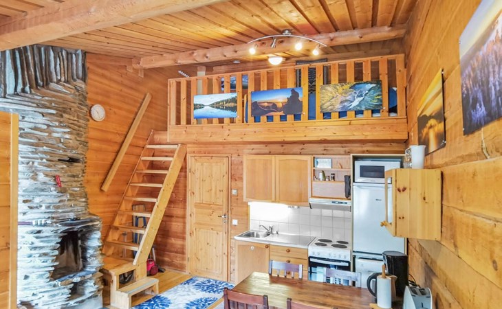 Apartment in log-built row house, built in 1986, living room: convertible sofa for 2, loft (low, sloping ceiling): 2 beds, combined kitchen/living room, electric sauna.