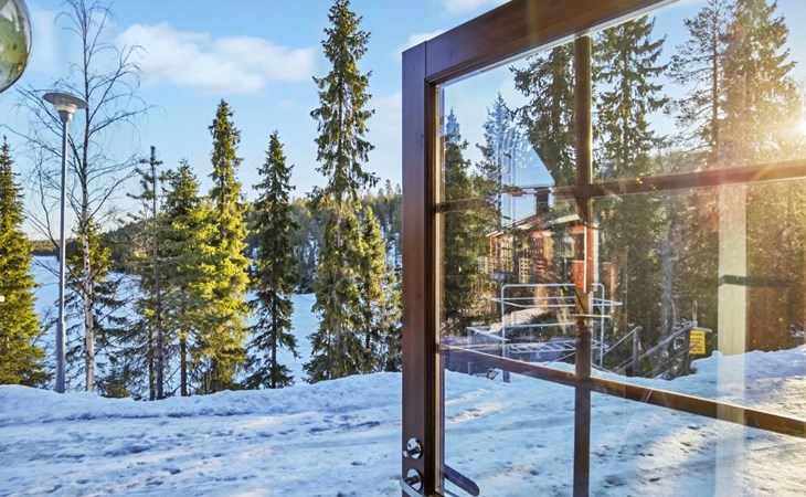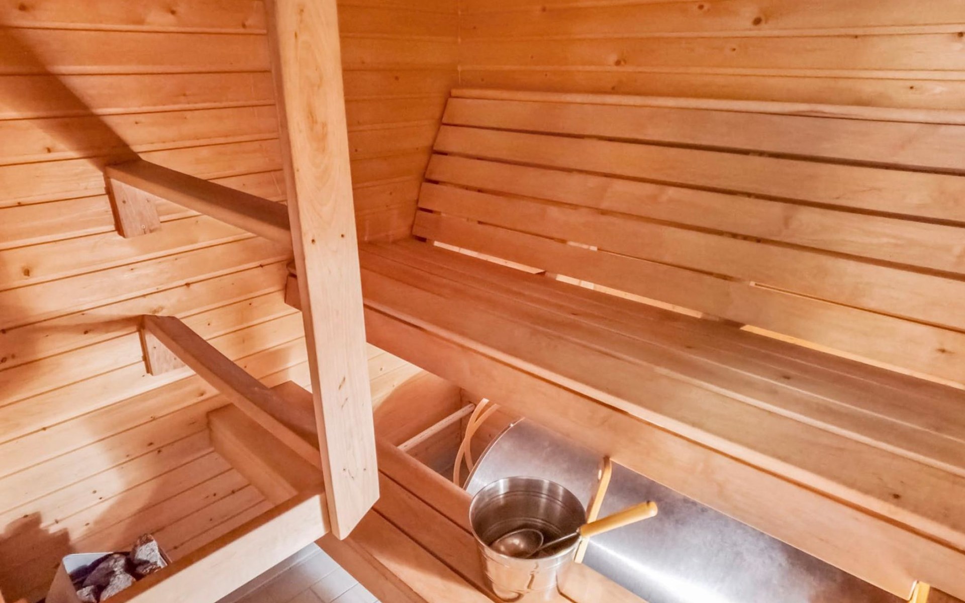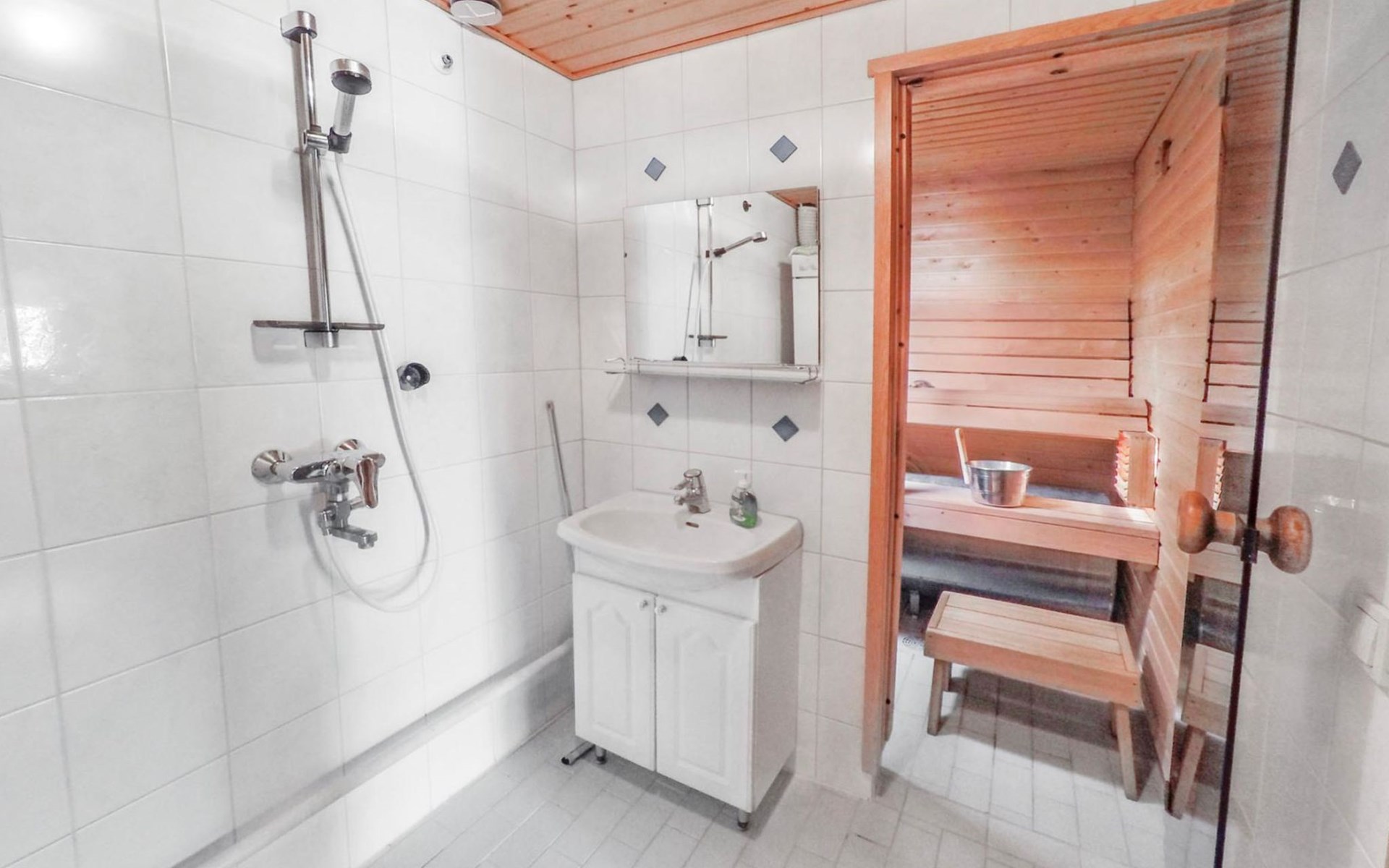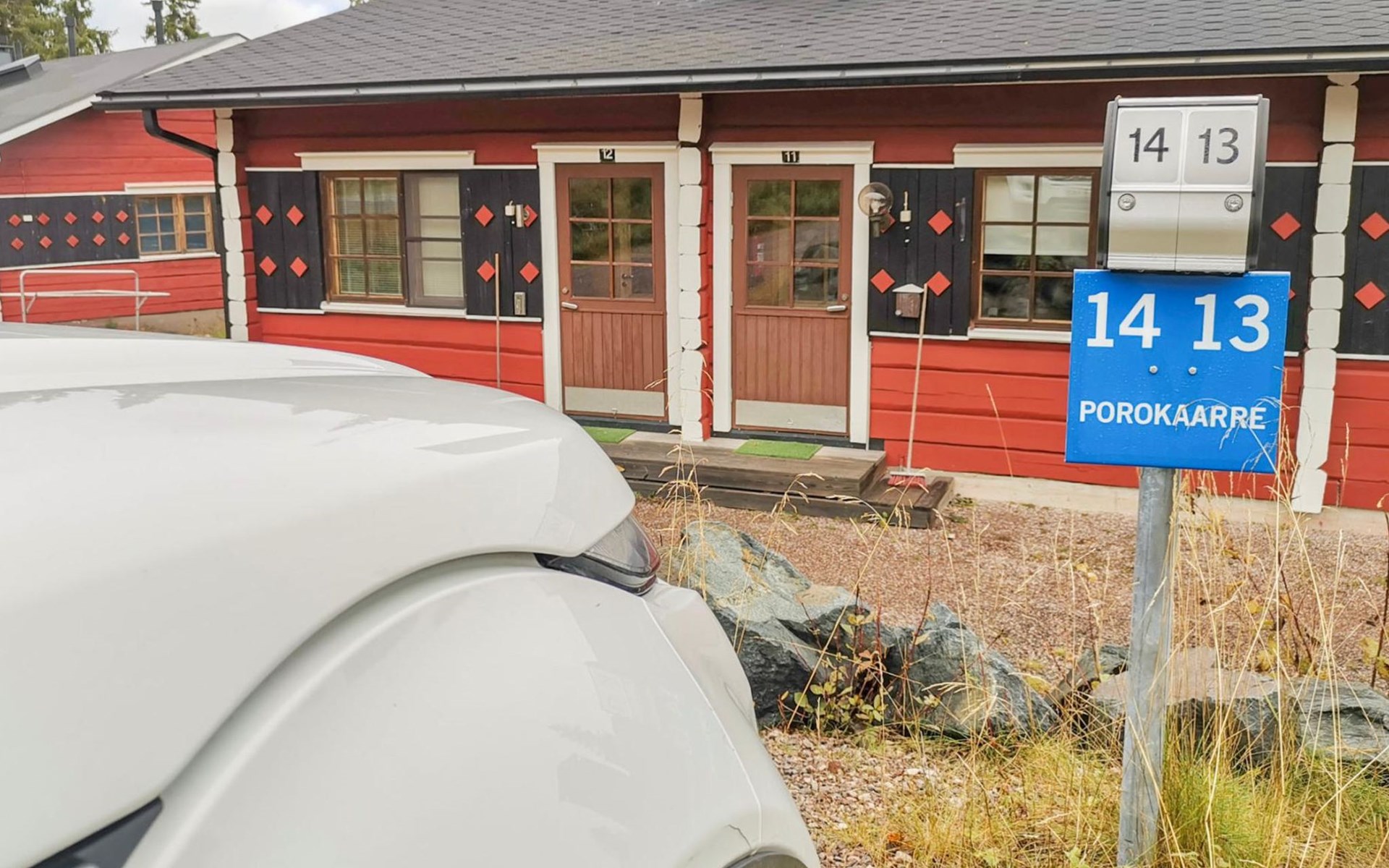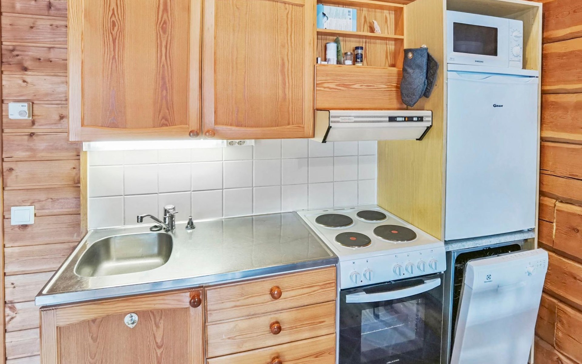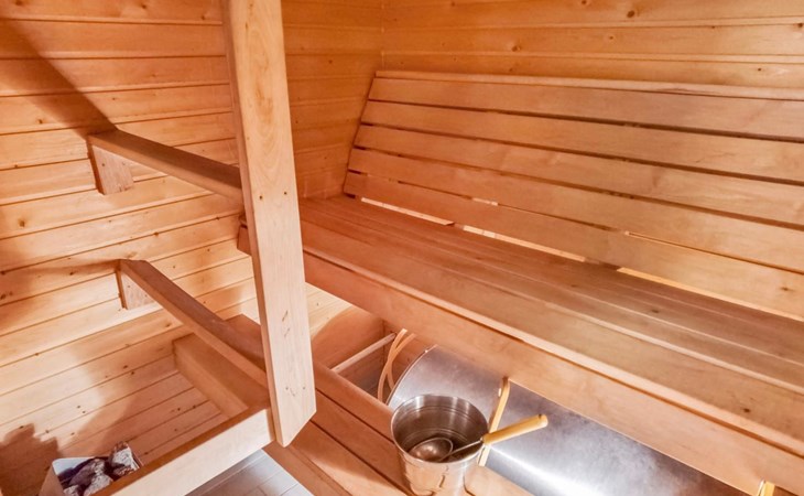 Apartment in log-built row house, built in 1986, living room: convertible sofa for 2, loft (low, sloping ceiling): 2 beds, combined kitchen/living room, electric sauna.