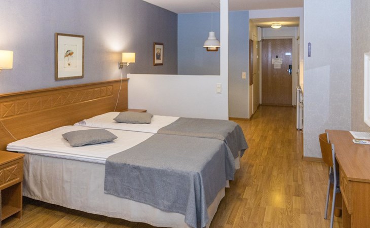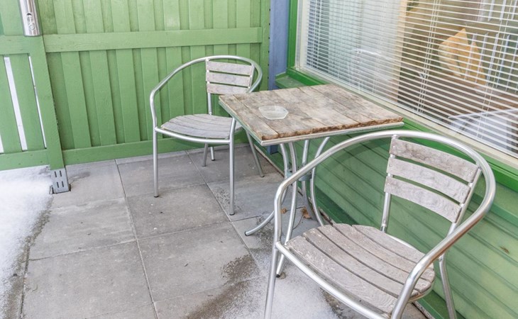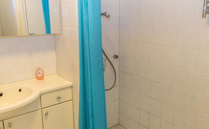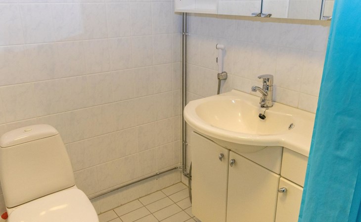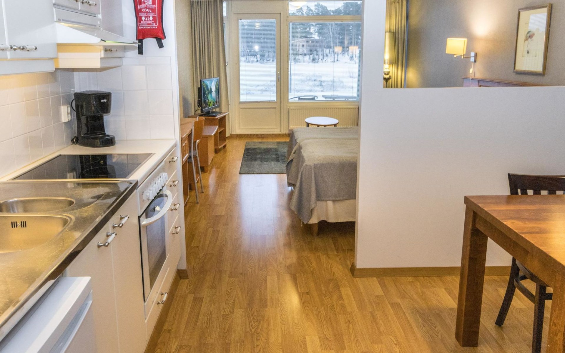 This apartment includes one room with a kitchen, a separate dining area, two beds, and a bathroom with a WC and shower.