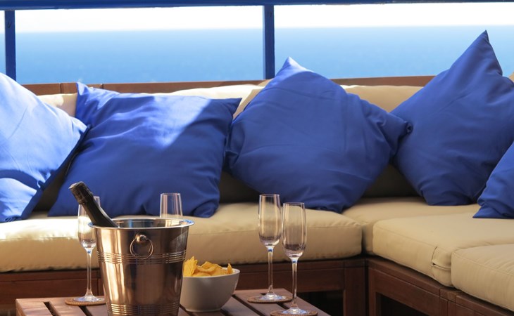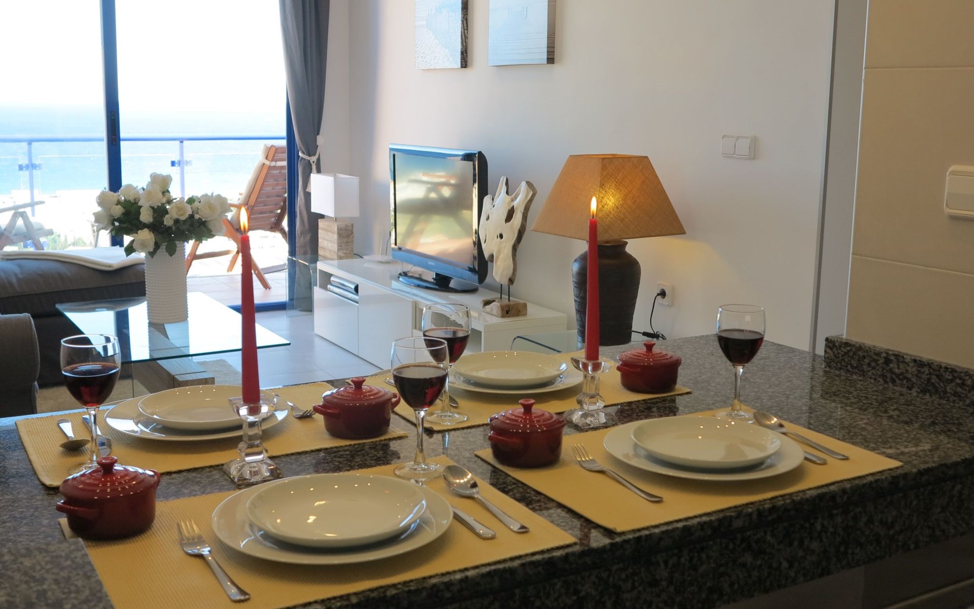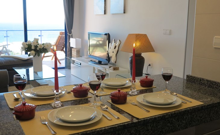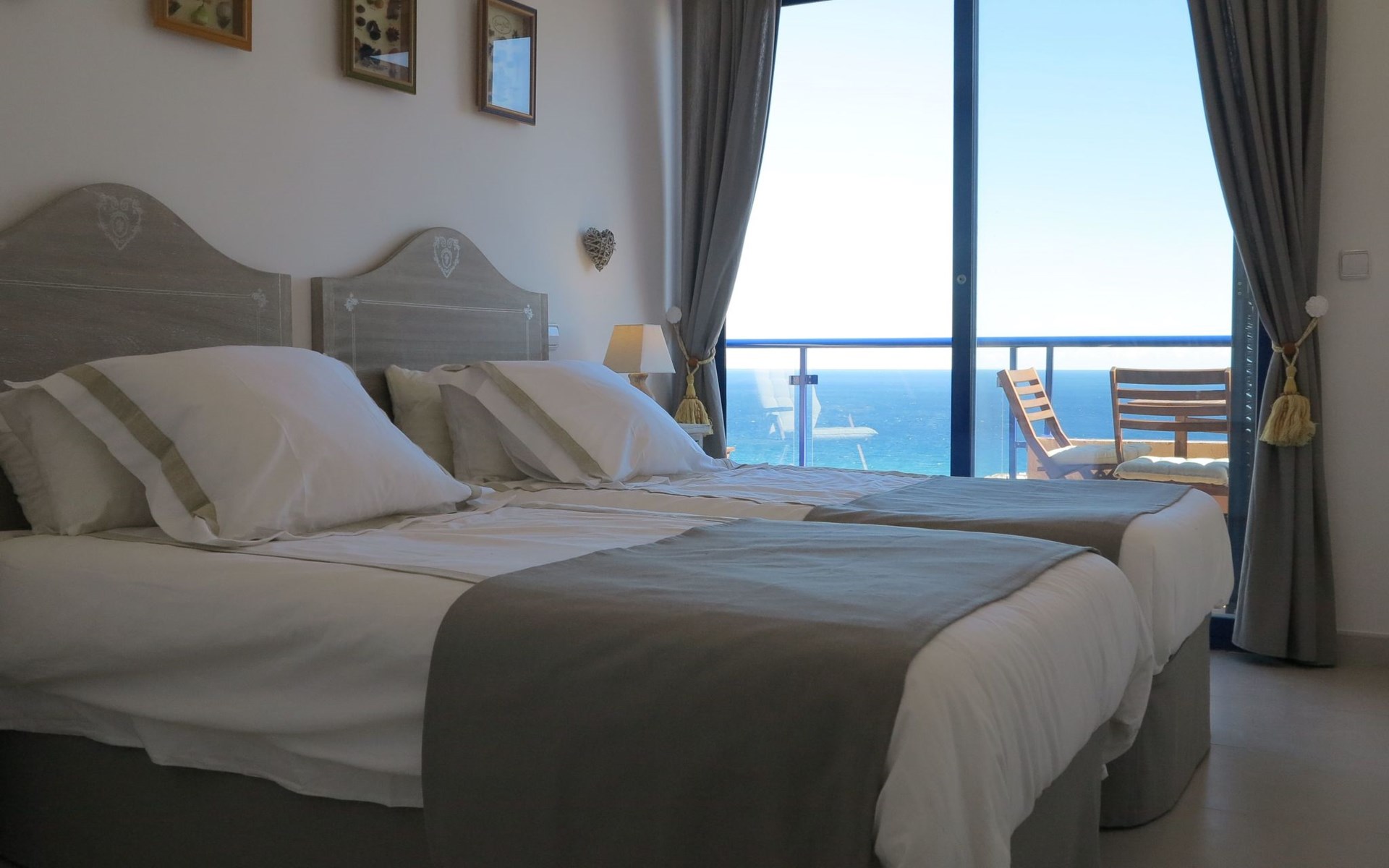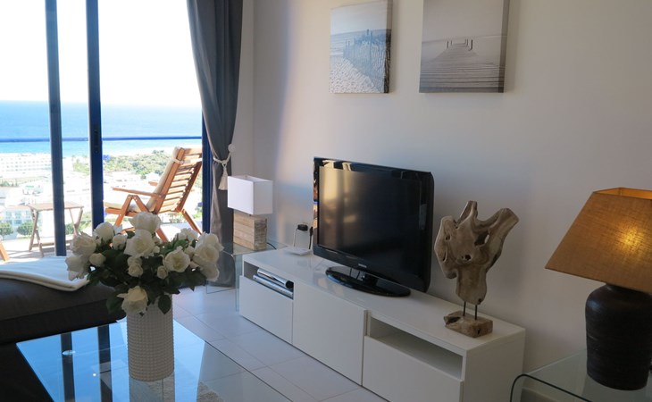 Vanop het ruime terras geniet je van de adembenemende 180° panoramische zichten op zee, bergen en golf. Moderne ingerichte keuken: vaatwasser, wasmachine, microgolf, oven, koel/vriescombi en inductiekookplaat. Zowel woonkamer als de 2 grote slaapkamers geven toegang tot het ruime ingerichte terras. Eén badkamer is ensuite met de master-bedroom, airco (koud en warm) in alle kamers. Smart flatscreen TV, bluetooth muziekketen, CD speler en gratis Wifi zorgen voor een aangename sfeer. Ingebouwde kluis! Een persoonlijke autostaanplaats in de afgesloten garage en parkeerplaats juist vóór de deur zijn voorzien. Het appartement is toegankelijk via 2 panoramische liften.