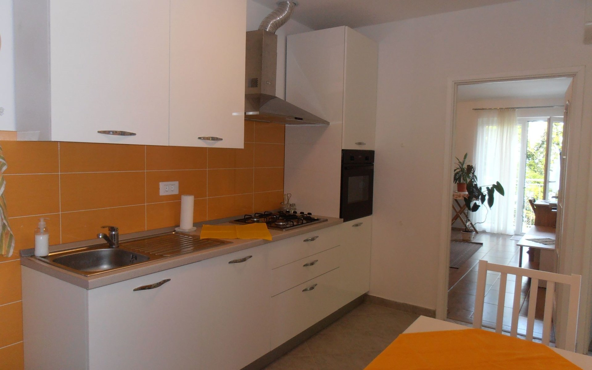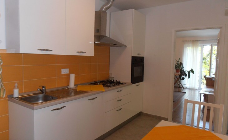 The holiday apartments are located only a 5 minute walk to the seashores. There is a walking promenade (lungomare) wich is connecting all the beaches.The living room has access to the sea-facing balcony. Private parking is at ground level. There are only 3 stairs to the entrance. The neighboring houses are not very close. There is plenty of greenery.This apartment is the larger of the two. It is on the side facing the sea. The two holiday apartments are both on the second floor, the rest of the house is used privately.