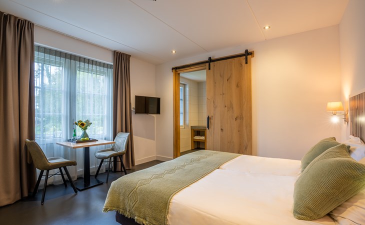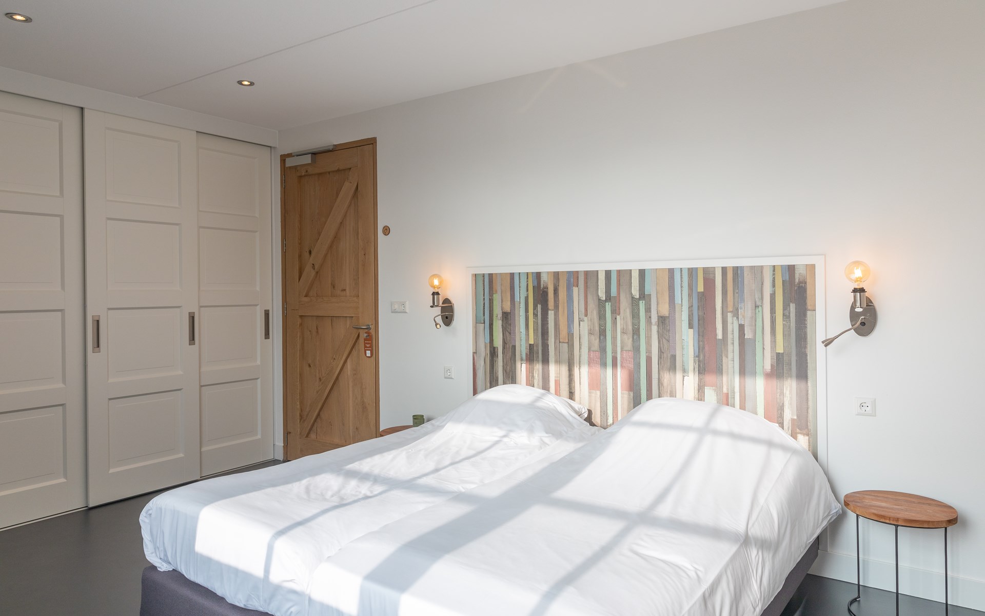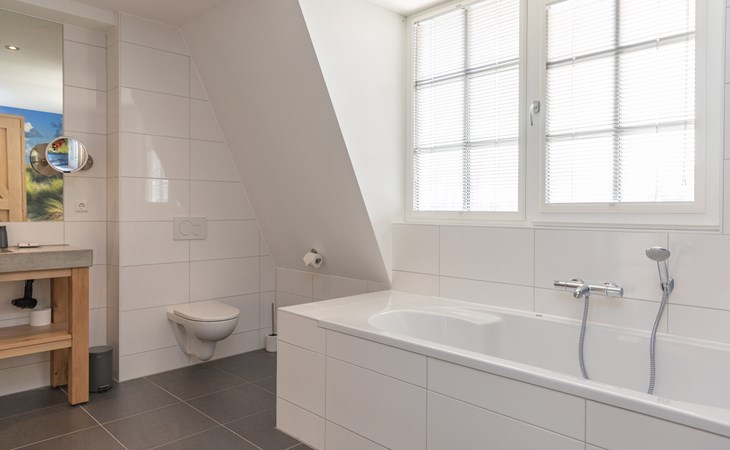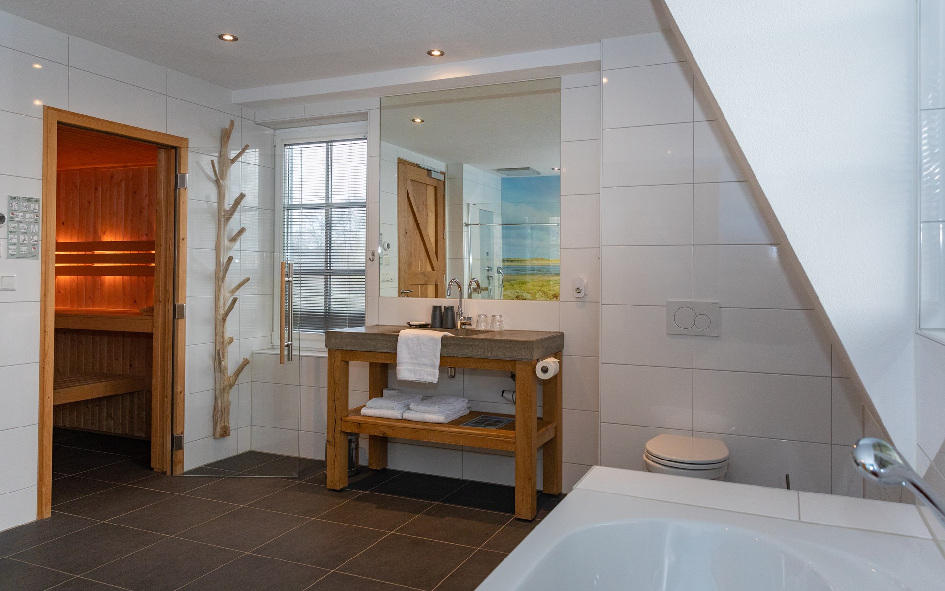 Op de eerste verdieping liggen 6 slaapkamers, elk voorzien van twee eenpersoons bedden, een TV en een badkamer met een douche, wastafel en toilet. Er zijn twee wellnessbadkamers die als extra voorzien zijn van een finse sauna (4-6 personen) en een whirlpool. De laatste vier slaapkamers liggen op de tweede verdieping, onder een schuin dak en zijn tevens voorzien van een eigen badkamer met douche, wastafel en toilet.