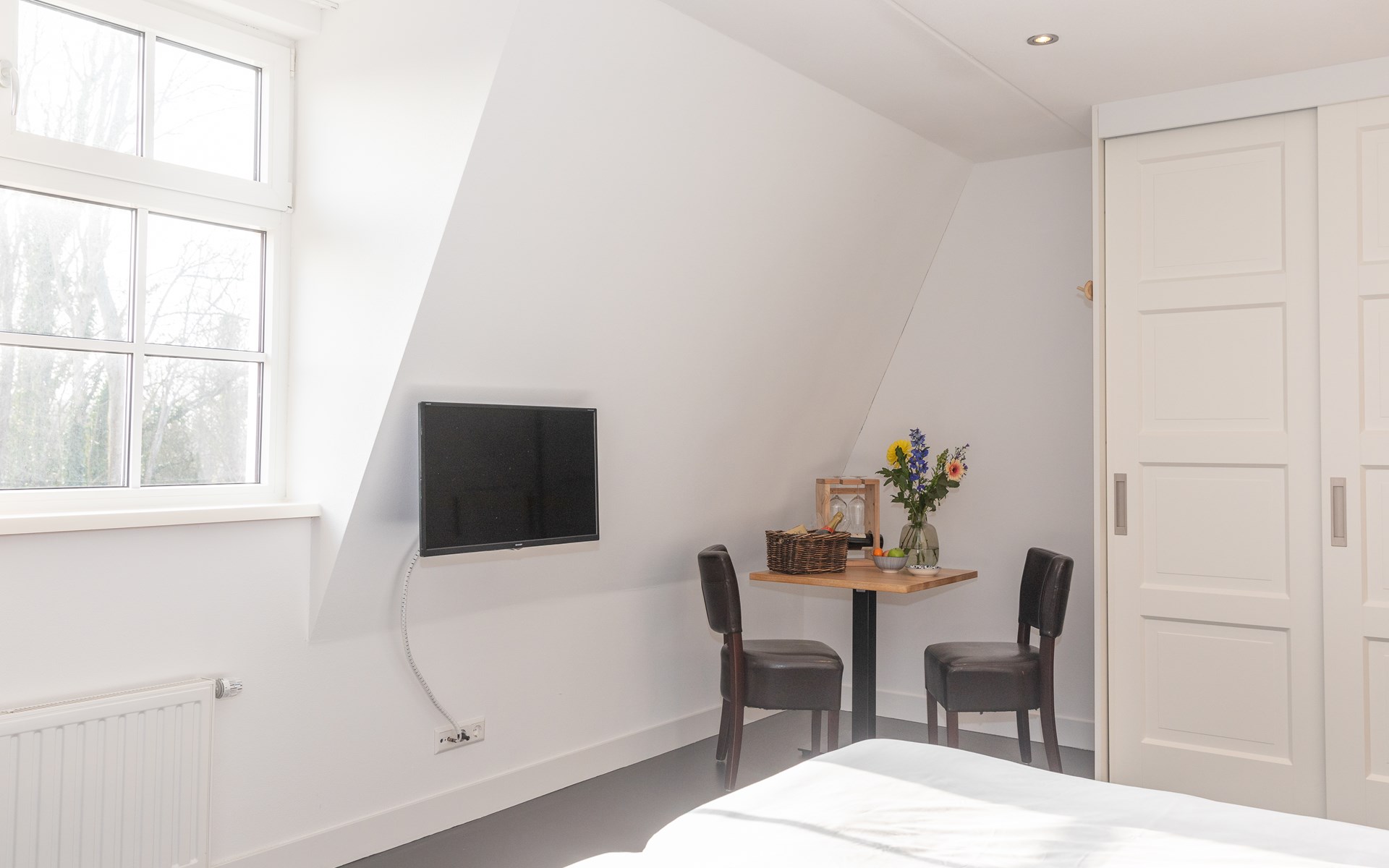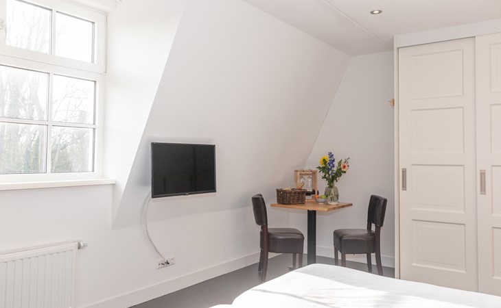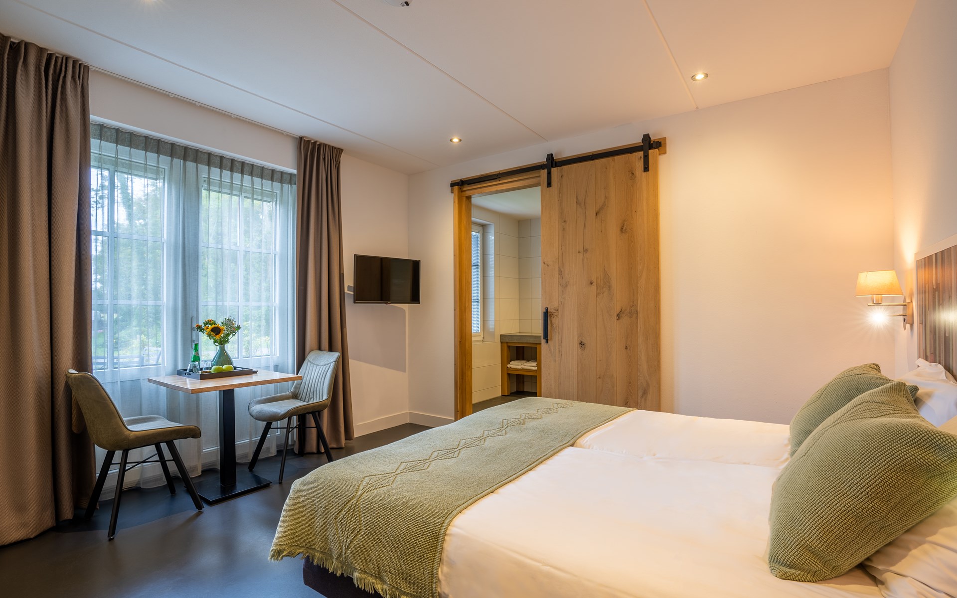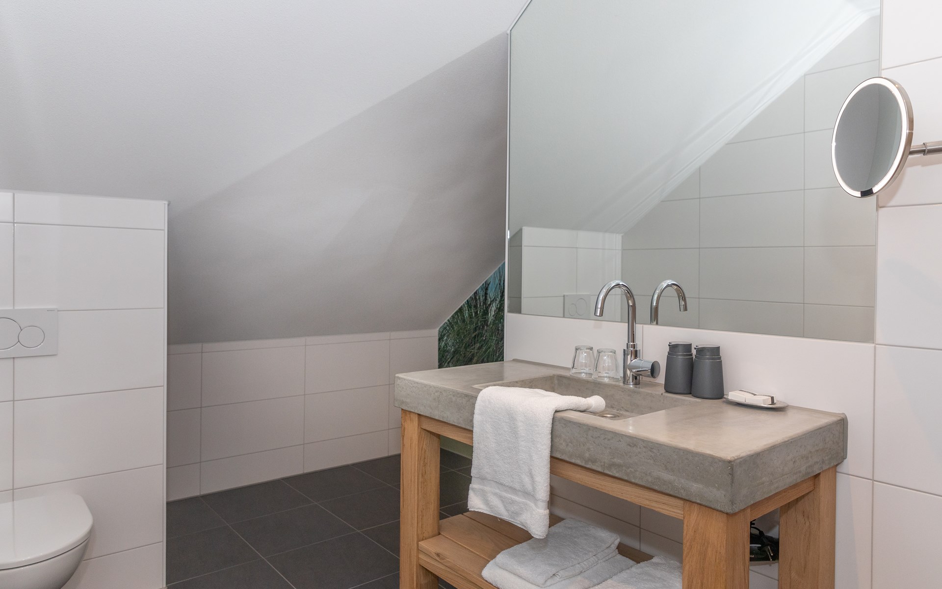 Op de eerste verdieping liggen 6 slaapkamers, elk voorzien van twee eenpersoons bedden, een TV en een badkamer met een douche, wastafel en toilet. Er zijn twee wellnessbadkamers die als extra voorzien zijn van een finse sauna (4-6 personen) en een whirlpool. De laatste vier slaapkamers liggen op de tweede verdieping, onder een schuin dak en zijn tevens voorzien van een eigen badkamer met douche, wastafel en toilet.