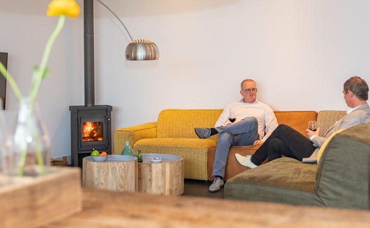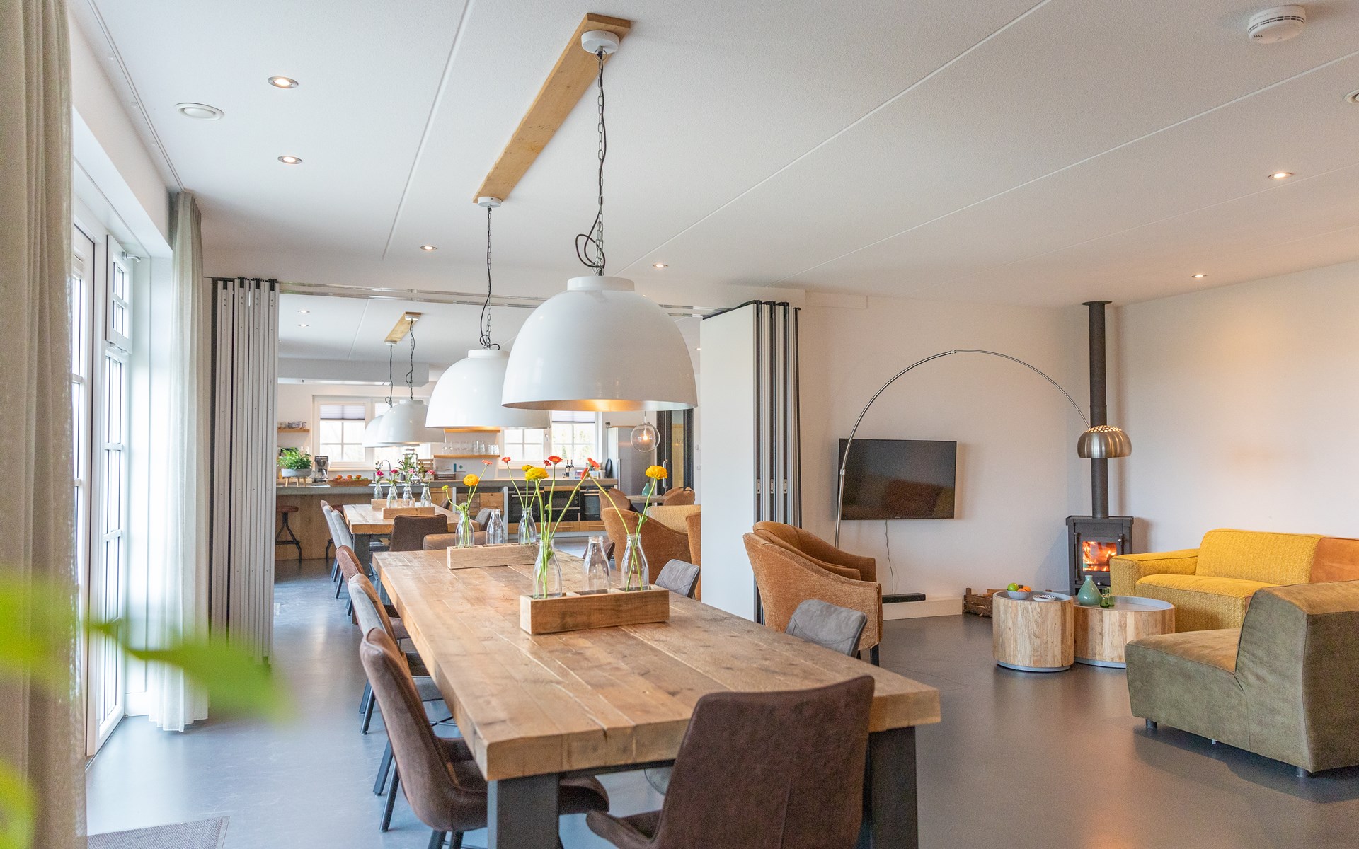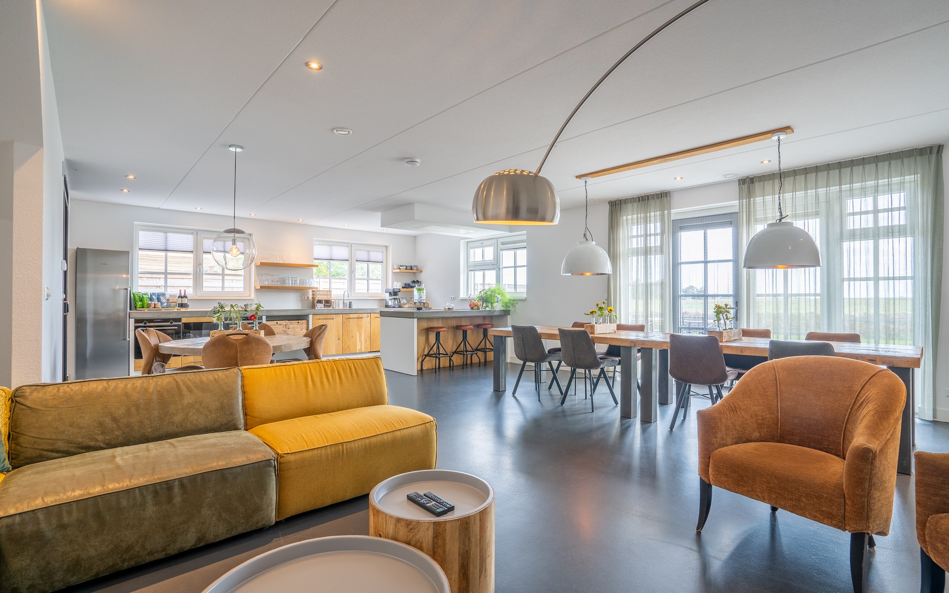 Op de begane grond bevindt zich de gezellige grote living met een comfortabele zithoek en een houtkachel. Er is een grote open keuken die van alle gemakken is voorzien, aan de grote eettafel kan het hele gezelschap tafelen en er staat een aparte 'spelletjestafel' in de living. Via de openslaande deuren stap je zo naar buiten het riante terras met een geweldig uitzicht op.