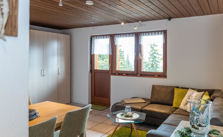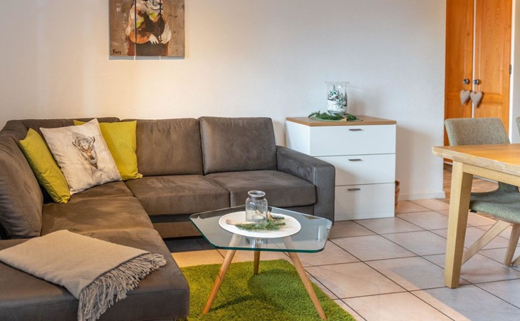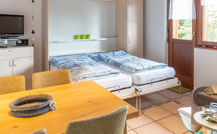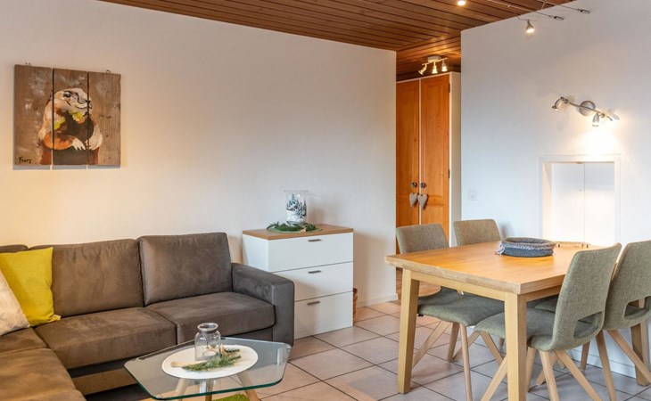 The apartments in the Sportina house are cozy and modernly equipped. All units have a south-facing balcony with views of the Walliser four-thousanders. The 2½-room apartments accommodate 1 to 4 people in 38 m² of living space. The amenities include a separate bedroom with a double bed, as well as a living area with a dining table and two fold-away beds. The kitchen is equipped with a Nespresso coffee machine. The bathroom features a shower and toilet. Other amenities include underfloor heating, TV, free Wi-Fi, and a shared laundry room in the basement. A lift is available in the building, as well as a ski storage room with a boot dryer.