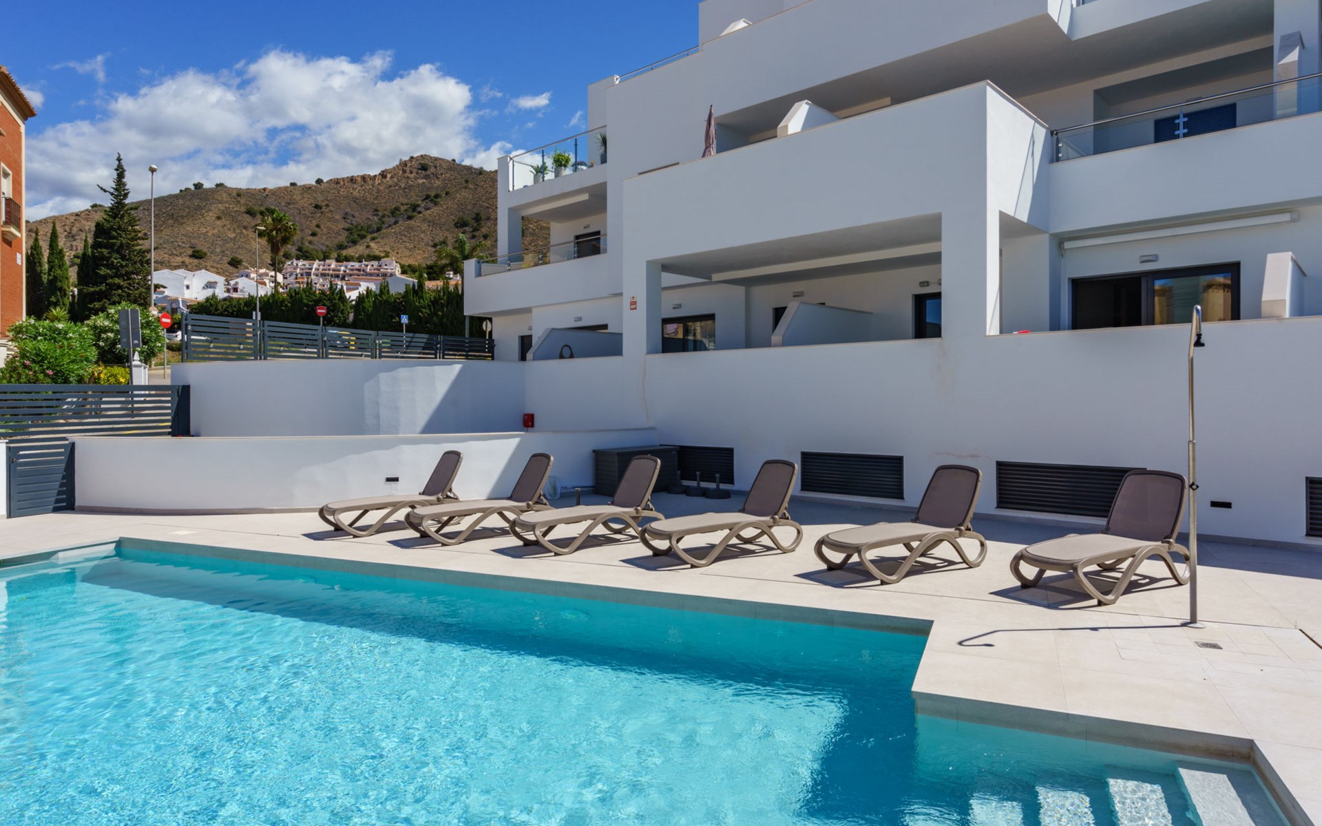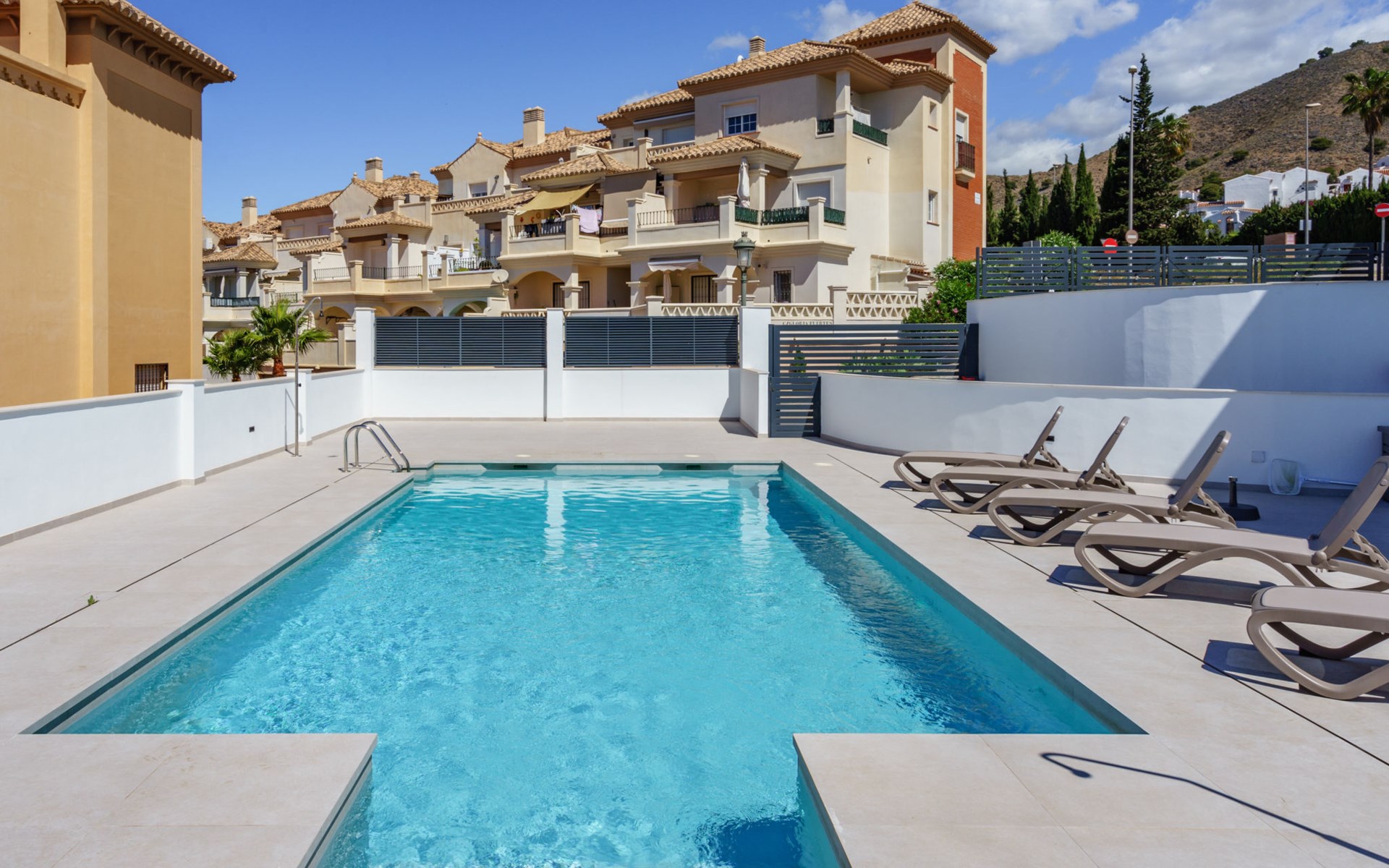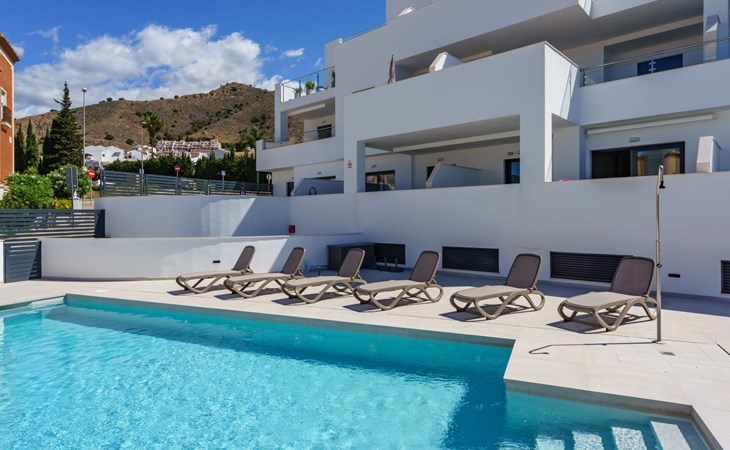 Capistrano 2 km van centro de Nerja: Gezellig, zeer comfortabel flatgebouw "Mirador Alto", bouwjaar 2023. 8 appartementen in de woning. Voor medegebruik: tuin met gazon, openluchtzwembad hoekig (5 x 10 m, 50 m2, seizoensgebonden beschikbaarheid: 01.Jan. - 31.Dec.). Buitendouche, tuinmeubelen. Voor alleengebruik: terras (20 m2), barbecue, overdekte parkeerplaats. Levensmiddelenwinkel 300 m, supermarkt 1 km, winkelcentrum 22 km, restaurant 50 m, voetgangersgebied 10 m, centrum te voet bereikbaar in 20 minuten, bushalte "Capistrano" 50 m, zandstrand "la torrecilla" 2.5 km. Golfterrein (18 holes) 14 km, kinderspeelplaats 100 m, Vismogelijkheden 3 km. Bekende skigebieden kunnen gemakkelijk worden bereikt: Sierra Nevada 95 km. Bekende meren kunnen gemakkelijk worden bereikt: Burriana 1.8 km, Balcon de Europa 2.5 km, Laa Cuevas de Nerja 3 km. Wandelgebied Acebuchal 5 km, Rio Seco 1 km. De eigenaar accepteert geen jeugdgroepen. Laden en lossen van de baggage is mogelijk bij het huis.