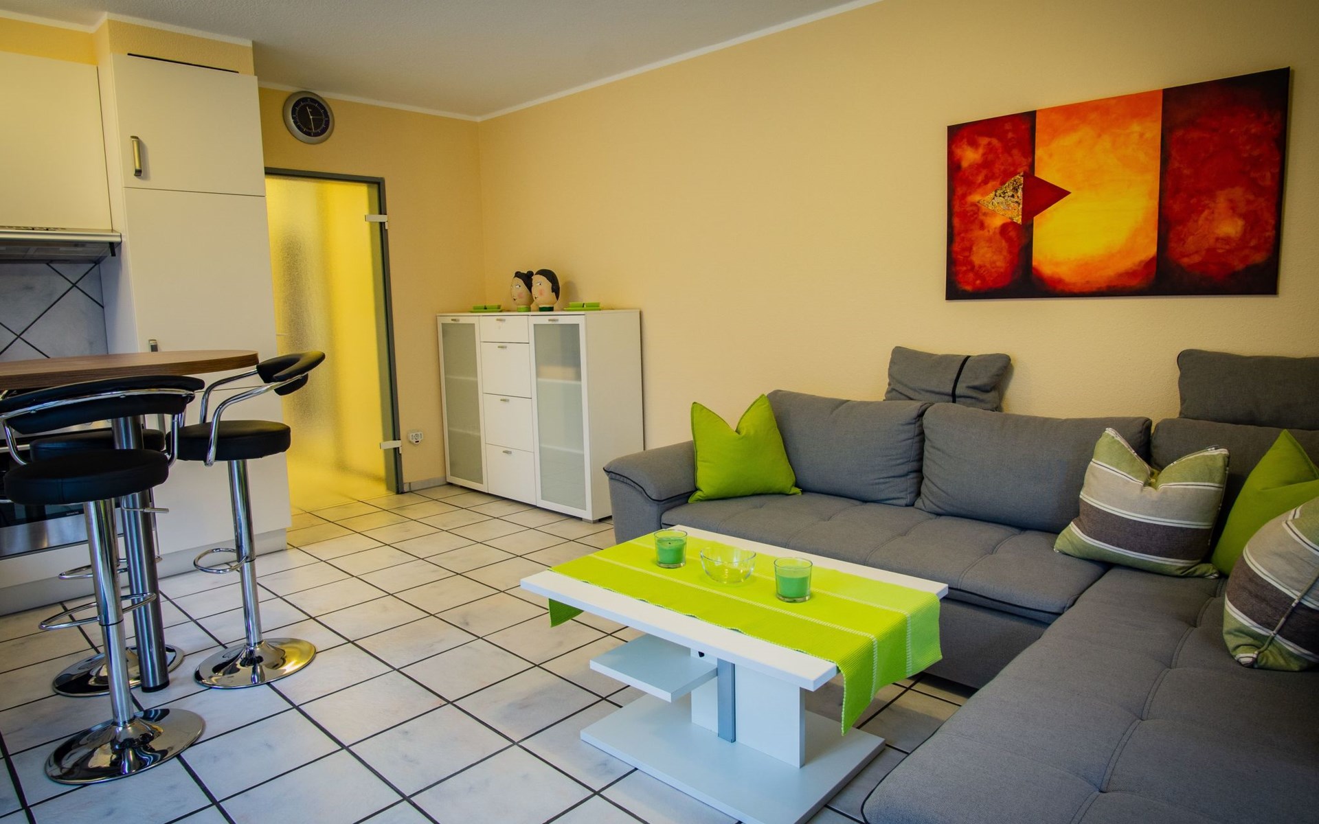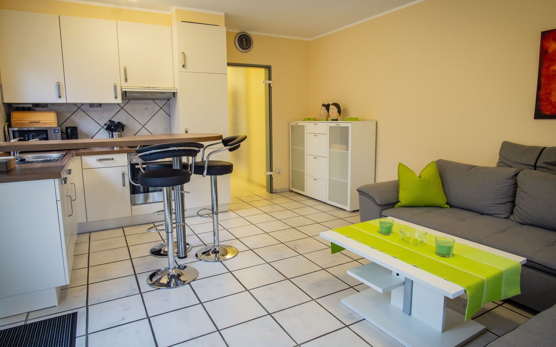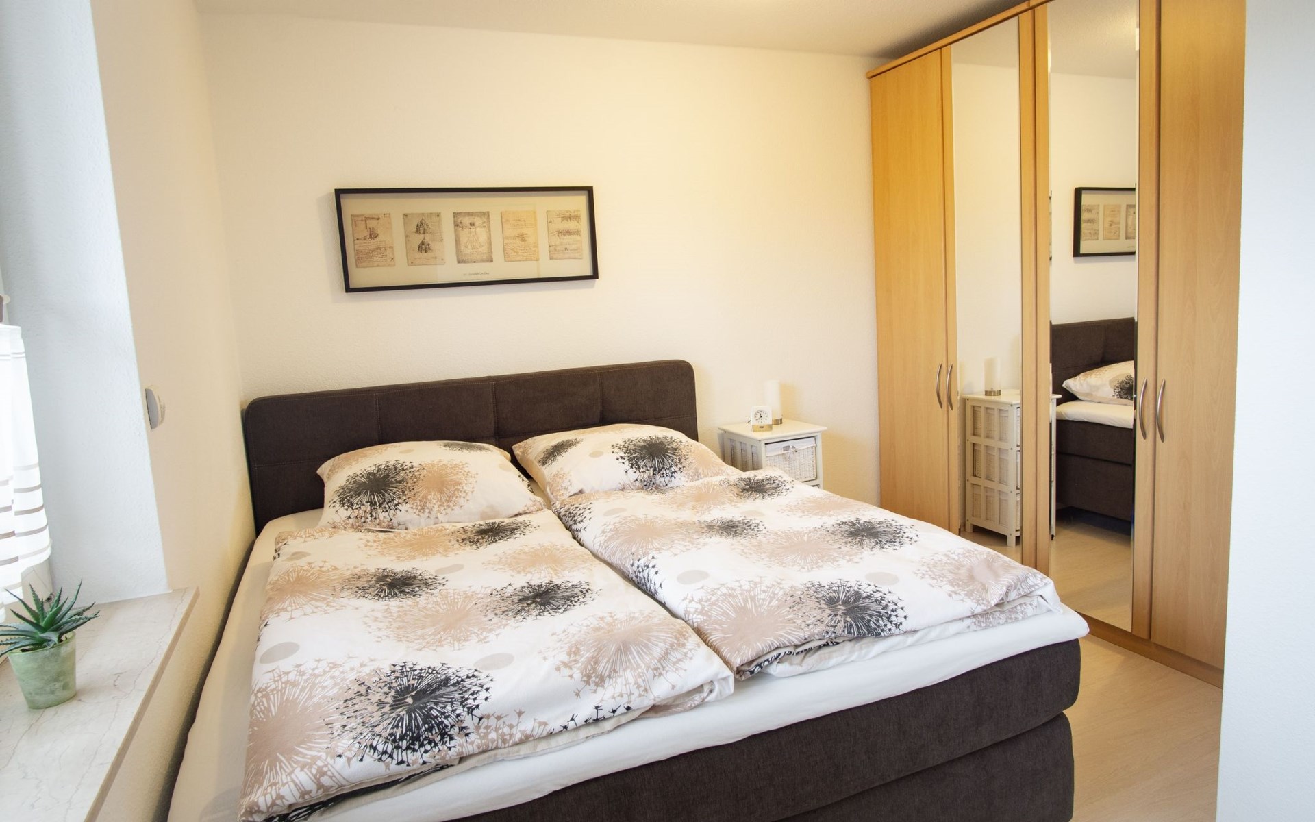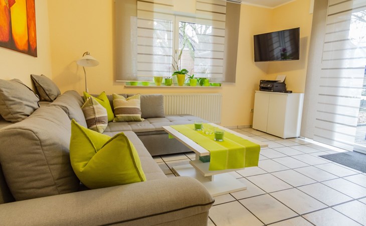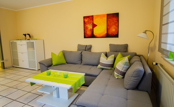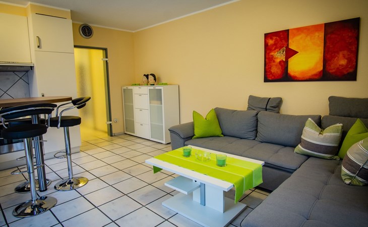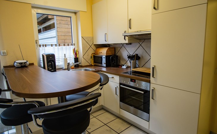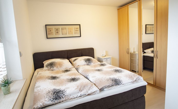 The bedroom is furnished with a high-quality box spring bed (180 x 200cm) and a spacious wardrobe. The beds are freshly made on arrival. There is also a sprung sofa in the living room that can be used as a bed measuring 140 x 230 cm, along with a smart TV including Prime Video, Maxdome and Netflix app. A Blu-ray player and wireless printer are available, as well as Wi-Fi free of charge. The kitchen is fully-equipped, including a ceramic hob, oven, dishwasher, microwave and coffee machine. The bathroom has a shower and WC. A hairdryer and fresh towels are provided.The centre with restaurants, supermarkets, pharmacies etc. is about 1200 metres away.The apartment can accommodate three adults or two adults and two children comfortably. The owners can provide a travel cot and highchair on request.