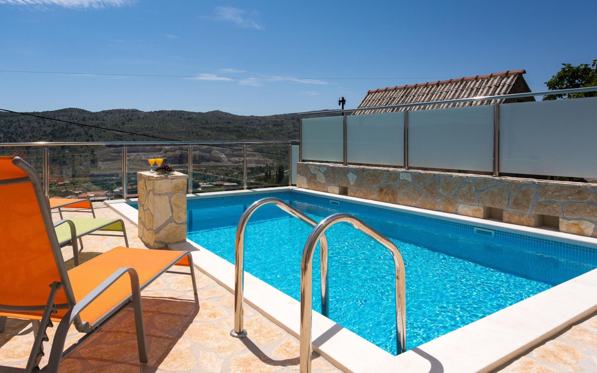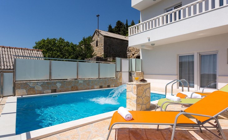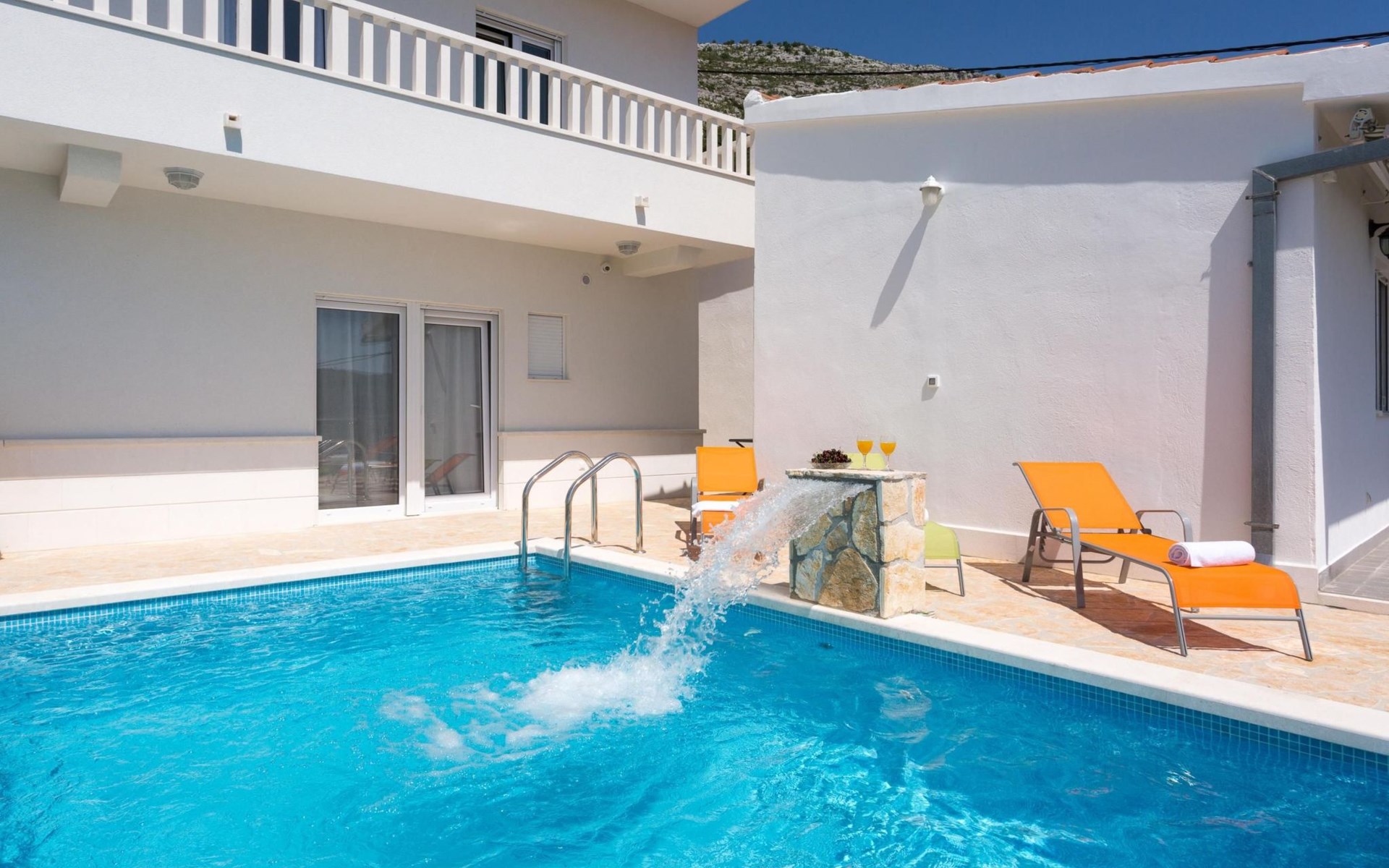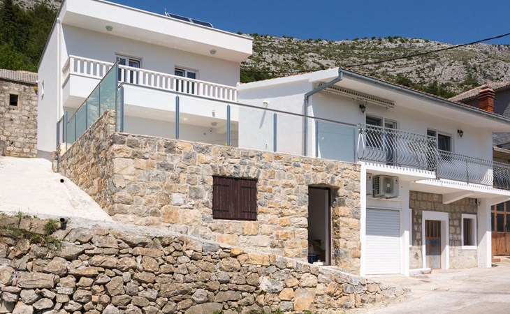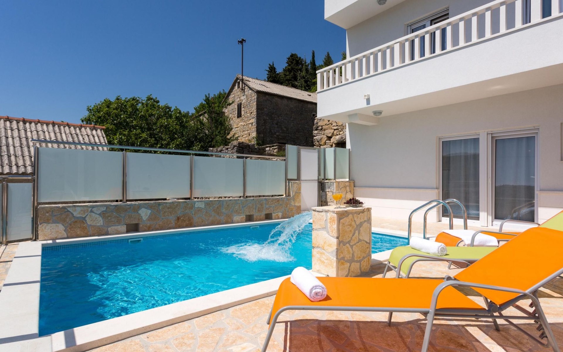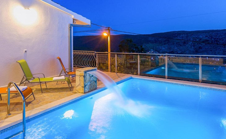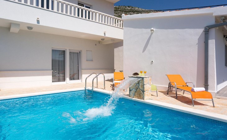 This modern and luxuriously furnished holiday villa is nestled into a green natural landscape at the foot of the mountain Mosor, just outside Srinjine along the sunny south coast of Croatia. It is an ideal place to leave hectic hustle and bustle far behind and to relax without a care in the world.Holiday home consisting of two separate residential units with panoramic views over the green hills from the private pool with outdoor shower and traditional BBQ grillIn the enclosed outdoor area a private pool awaits you with a metal ladder to facilitate entry and an outdoor shower. There is a sun deck next to it with sun loungers for relaxing, affording a view over the sun-blessed valley, the meadows and fields of the village Srinjine. A large parasol provides pleasant shade during the midday hours. You can spend your holiday evenings around the traditional stone grill. If you arrive by car, you can use the parking space in the private garage and there are three further parking spaces right in front of the villa.The spacious 180m² holiday villa consisting of two separate buildings was newly built in 2016 and is generously equipped for a comfortable stay, including air conditioning and wireless Internet access in all rooms. It is spread over two floors and comprises two open living and dining rooms each with a very modern kitchen, four bedrooms and three daylight bathrooms. The living rooms, one on the lower floor and one on the upper floor, each provides comfortable sofas, a wide flatscreen TV with satellite channels and a USB port, and a dining table with chairs. The white and glossy built-in kitchens are equipped with the latest appliances: dishwasher, ceramic hob with a stainless steel cooker hood, oven, microwave, fridge with freezer compartment, kettle, toaster and coffee machine. The four bedrooms are each furnished with a double bed (180 x 200cm), bedside tables with reading lamps and cupboards with ample storage space. The sofas in the living rooms can be pulled out as beds for two further people. All three bathrooms are fitted with a large shower cubicle with a rain showerhead, a washbasin with a cupboard underneath and a wall mirror, a hairdryer and a toilet. Two bathrooms also provide washing machines for your convenience. The lower living room has a safe for storing your valuables securely. All the windows and balcony doors are fitted with fly screens and blinds. A child’s bed and a highchair can be provided on request and plenty of bed linen and towels are included in the rental price.The village centre is about 2km away, just five minutes by car. Here you can find shops, three supermarkets, a bakery, colourful street markets, a post office and a good range of cafés and restaurants. It is about 14km to Omiš and about 16km to Split with its famous Diocletian Palace. In Omiš there is a very well-maintained and clean sandy beach with two little cafés, a jet-ski rental and also rafting, canyoning, kayaking, diving, zipline, banana boat ride, parasailing, boat trips to the islands etc. The nearest bus stop is about 2km away by the main road, with regular connections to Omiš and Split.
