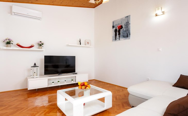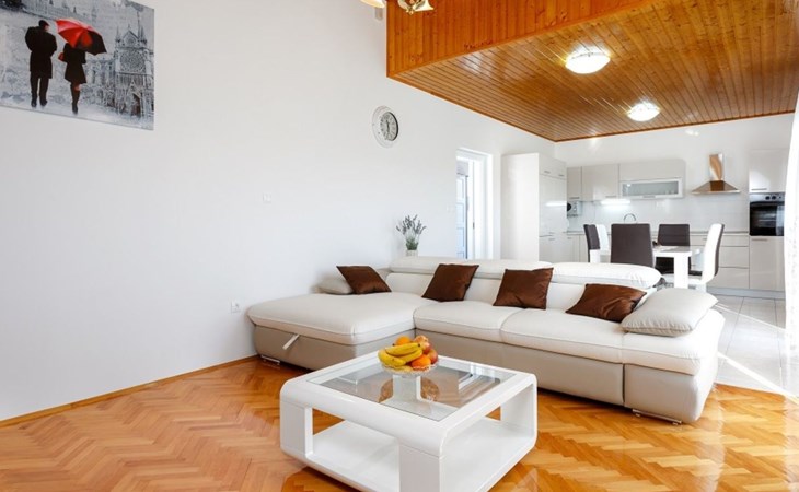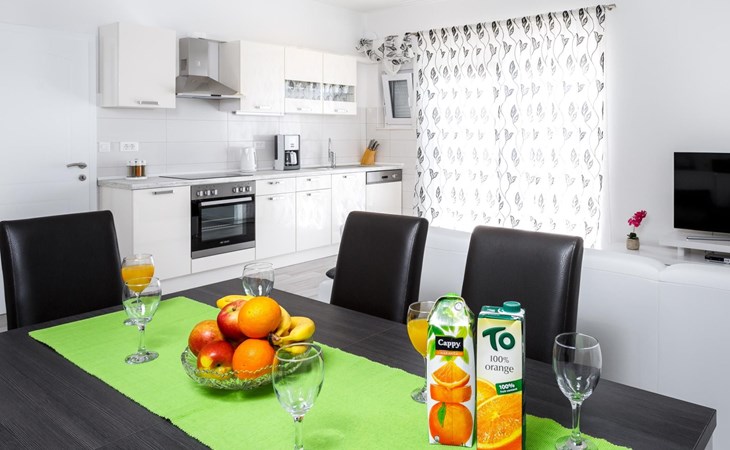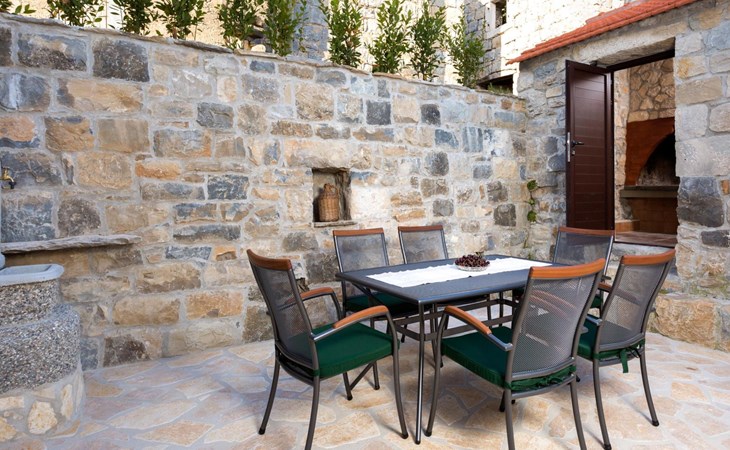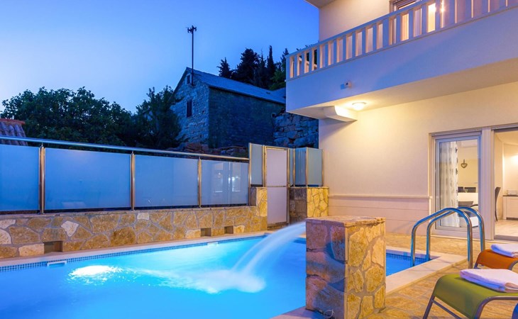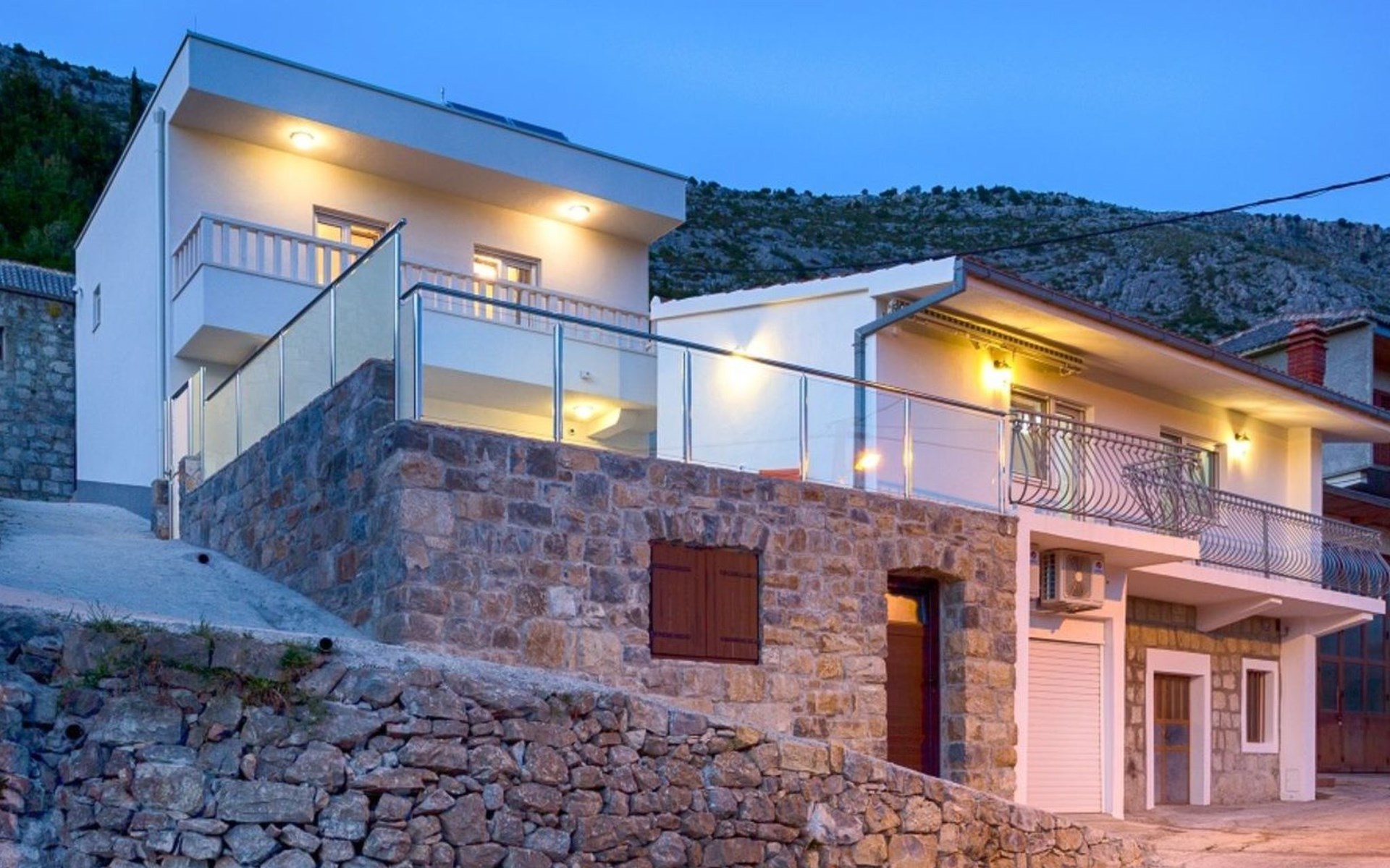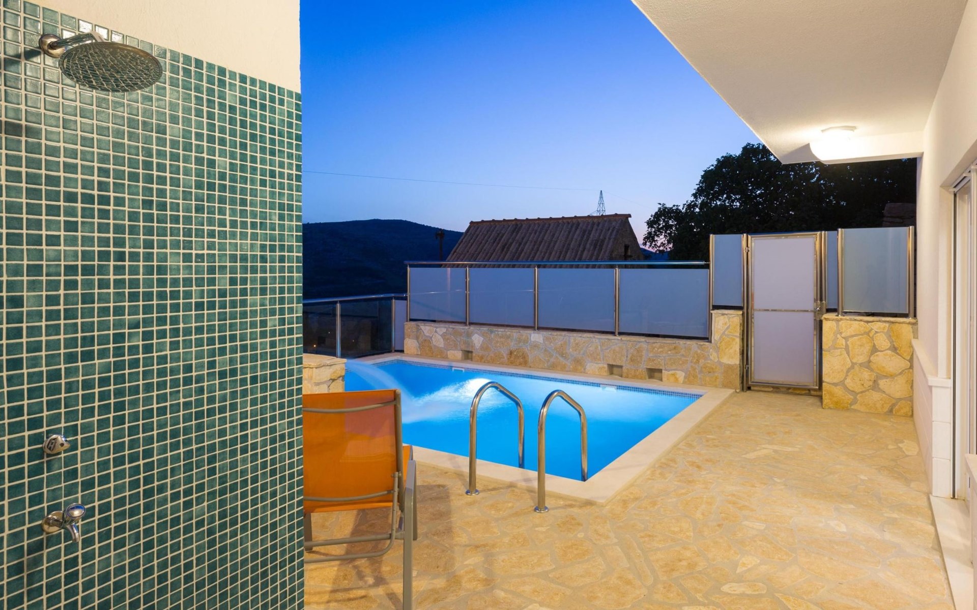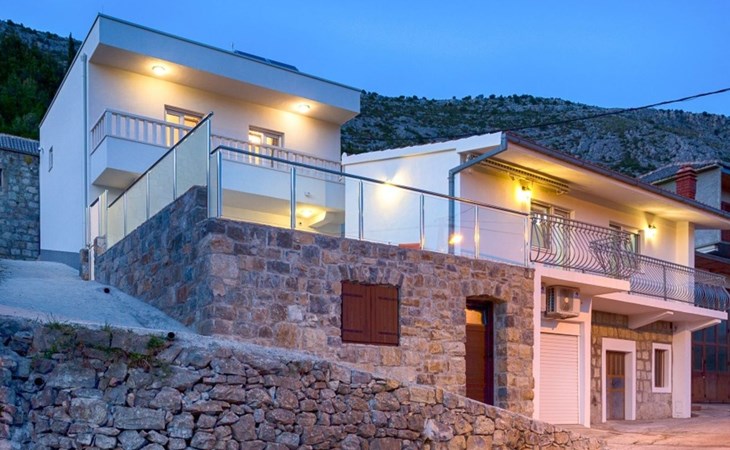 This modern and luxuriously furnished holiday villa is nestled into a green natural landscape at the foot of the mountain Mosor, just outside Srinjine along the sunny south coast of Croatia. It is an ideal place to leave hectic hustle and bustle far behind and to relax without a care in the world.Holiday home consisting of two separate residential units with panoramic views over the green hills from the private pool with outdoor shower and traditional BBQ grillIn the enclosed outdoor area a private pool awaits you with a metal ladder to facilitate entry and an outdoor shower. There is a sun deck next to it with sun loungers for relaxing, affording a view over the sun-blessed valley, the meadows and fields of the village Srinjine. A large parasol provides pleasant shade during the midday hours. You can spend your holiday evenings around the traditional stone grill. If you arrive by car, you can use the parking space in the private garage and there are three further parking spaces right in front of the villa.The spacious 180m² holiday villa consisting of two separate buildings was newly built in 2016 and is generously equipped for a comfortable stay, including air conditioning and wireless Internet access in all rooms. It is spread over two floors and comprises two open living and dining rooms each with a very modern kitchen, four bedrooms and three daylight bathrooms. The living rooms, one on the lower floor and one on the upper floor, each provides comfortable sofas, a wide flatscreen TV with satellite channels and a USB port, and a dining table with chairs. The white and glossy built-in kitchens are equipped with the latest appliances: dishwasher, ceramic hob with a stainless steel cooker hood, oven, microwave, fridge with freezer compartment, kettle, toaster and coffee machine. The four bedrooms are each furnished with a double bed (180 x 200cm), bedside tables with reading lamps and cupboards with ample storage space. The sofas in the living rooms can be pulled out as beds for two further people. All three bathrooms are fitted with a large shower cubicle with a rain showerhead, a washbasin with a cupboard underneath and a wall mirror, a hairdryer and a toilet. Two bathrooms also provide washing machines for your convenience. The lower living room has a safe for storing your valuables securely. All the windows and balcony doors are fitted with fly screens and blinds. A child’s bed and a highchair can be provided on request and plenty of bed linen and towels are included in the rental price.The village centre is about 2km away, just five minutes by car. Here you can find shops, three supermarkets, a bakery, colourful street markets, a post office and a good range of cafés and restaurants. It is about 14km to Omiš and about 16km to Split with its famous Diocletian Palace. In Omiš there is a very well-maintained and clean sandy beach with two little cafés, a jet-ski rental and also rafting, canyoning, kayaking, diving, zipline, banana boat ride, parasailing, boat trips to the islands etc. The nearest bus stop is about 2km away by the main road, with regular connections to Omiš and Split.