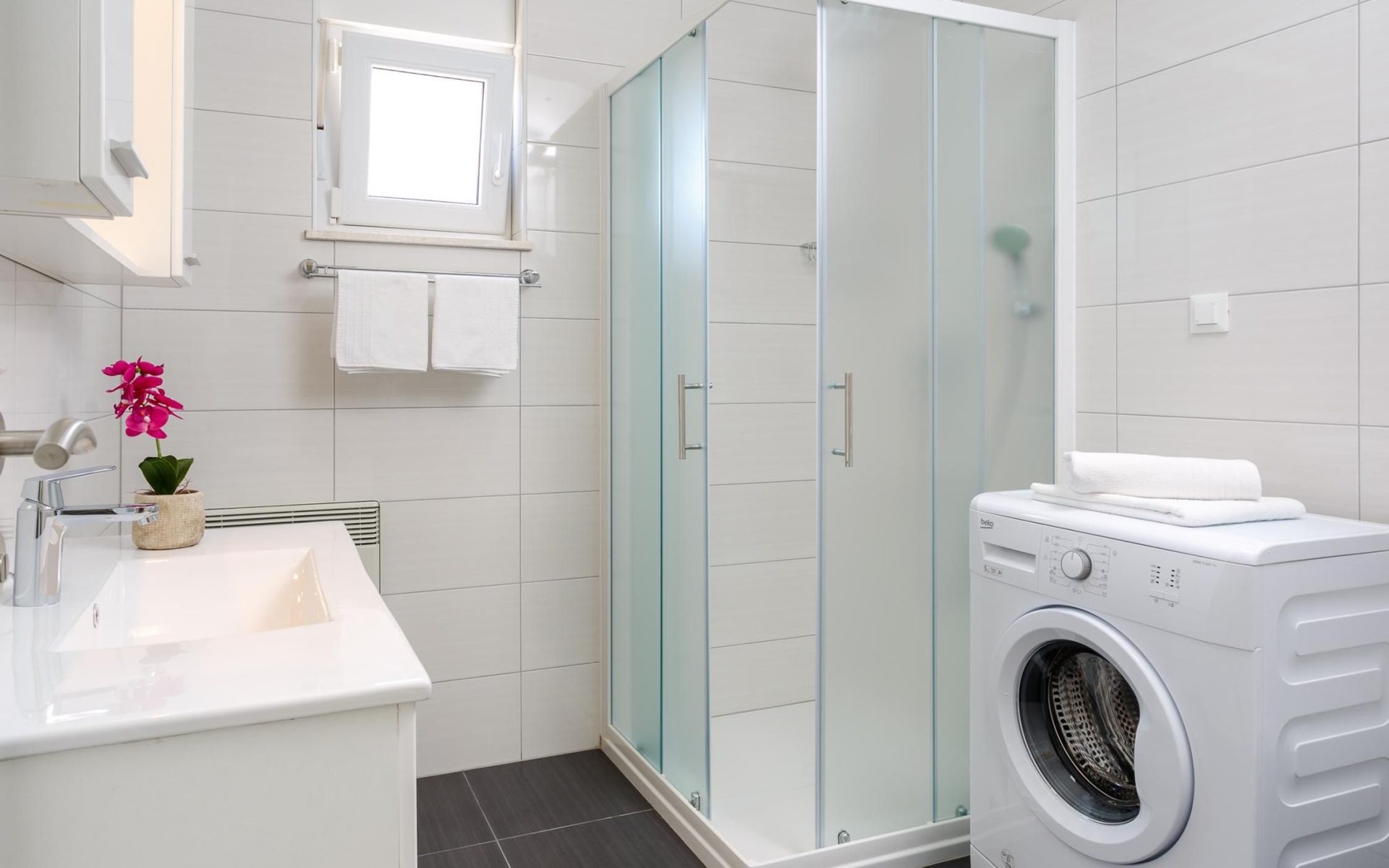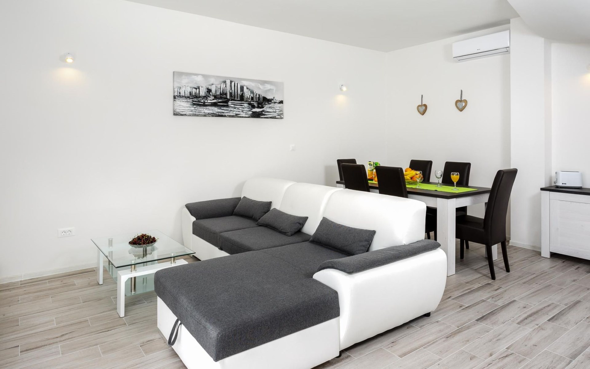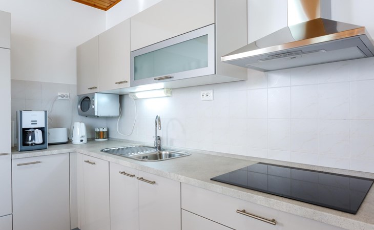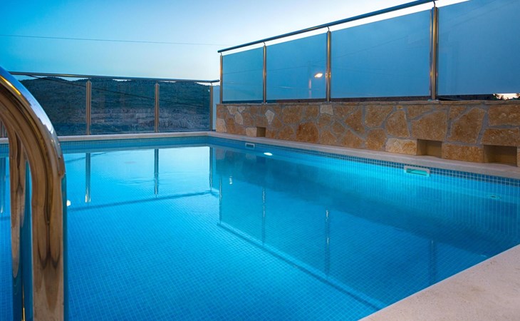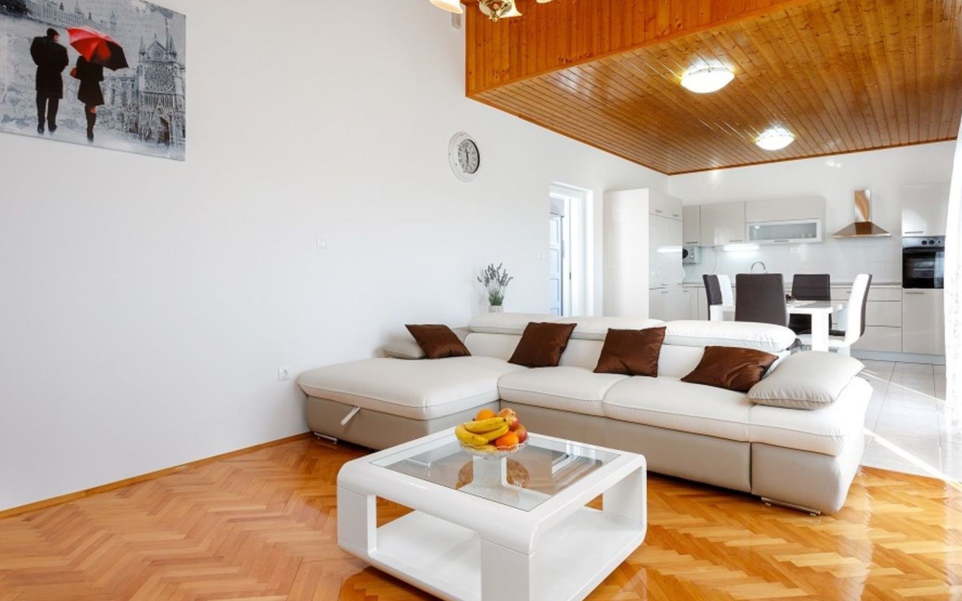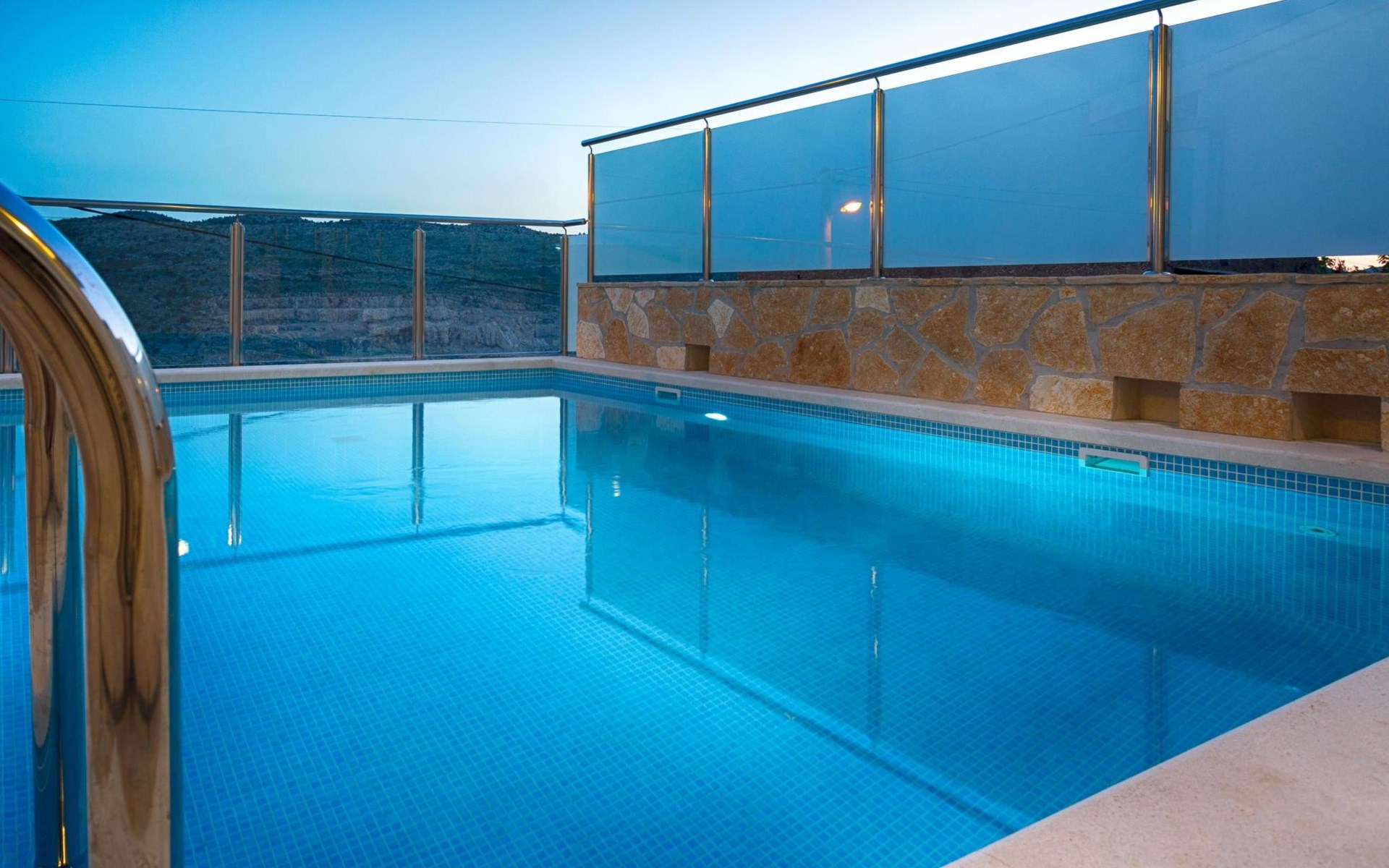 This modern and luxuriously furnished holiday villa is nestled into a green natural landscape at the foot of the mountain Mosor, just outside Srinjine along the sunny south coast of Croatia. It is an ideal place to leave hectic hustle and bustle far behind and to relax without a care in the world.Holiday home consisting of two separate residential units with panoramic views over the green hills from the private pool with outdoor shower and traditional BBQ grillIn the enclosed outdoor area a private pool awaits you with a metal ladder to facilitate entry and an outdoor shower. There is a sun deck next to it with sun loungers for relaxing, affording a view over the sun-blessed valley, the meadows and fields of the village Srinjine. A large parasol provides pleasant shade during the midday hours. You can spend your holiday evenings around the traditional stone grill. If you arrive by car, you can use the parking space in the private garage and there are three further parking spaces right in front of the villa.The spacious 180m² holiday villa consisting of two separate buildings was newly built in 2016 and is generously equipped for a comfortable stay, including air conditioning and wireless Internet access in all rooms. It is spread over two floors and comprises two open living and dining rooms each with a very modern kitchen, four bedrooms and three daylight bathrooms. The living rooms, one on the lower floor and one on the upper floor, each provides comfortable sofas, a wide flatscreen TV with satellite channels and a USB port, and a dining table with chairs. The white and glossy built-in kitchens are equipped with the latest appliances: dishwasher, ceramic hob with a stainless steel cooker hood, oven, microwave, fridge with freezer compartment, kettle, toaster and coffee machine. The four bedrooms are each furnished with a double bed (180 x 200cm), bedside tables with reading lamps and cupboards with ample storage space. The sofas in the living rooms can be pulled out as beds for two further people. All three bathrooms are fitted with a large shower cubicle with a rain showerhead, a washbasin with a cupboard underneath and a wall mirror, a hairdryer and a toilet. Two bathrooms also provide washing machines for your convenience. The lower living room has a safe for storing your valuables securely. All the windows and balcony doors are fitted with fly screens and blinds. A child’s bed and a highchair can be provided on request and plenty of bed linen and towels are included in the rental price.The village centre is about 2km away, just five minutes by car. Here you can find shops, three supermarkets, a bakery, colourful street markets, a post office and a good range of cafés and restaurants. It is about 14km to Omiš and about 16km to Split with its famous Diocletian Palace. In Omiš there is a very well-maintained and clean sandy beach with two little cafés, a jet-ski rental and also rafting, canyoning, kayaking, diving, zipline, banana boat ride, parasailing, boat trips to the islands etc. The nearest bus stop is about 2km away by the main road, with regular connections to Omiš and Split.