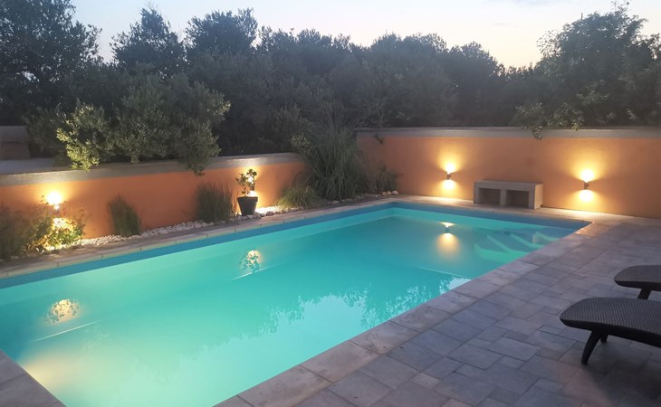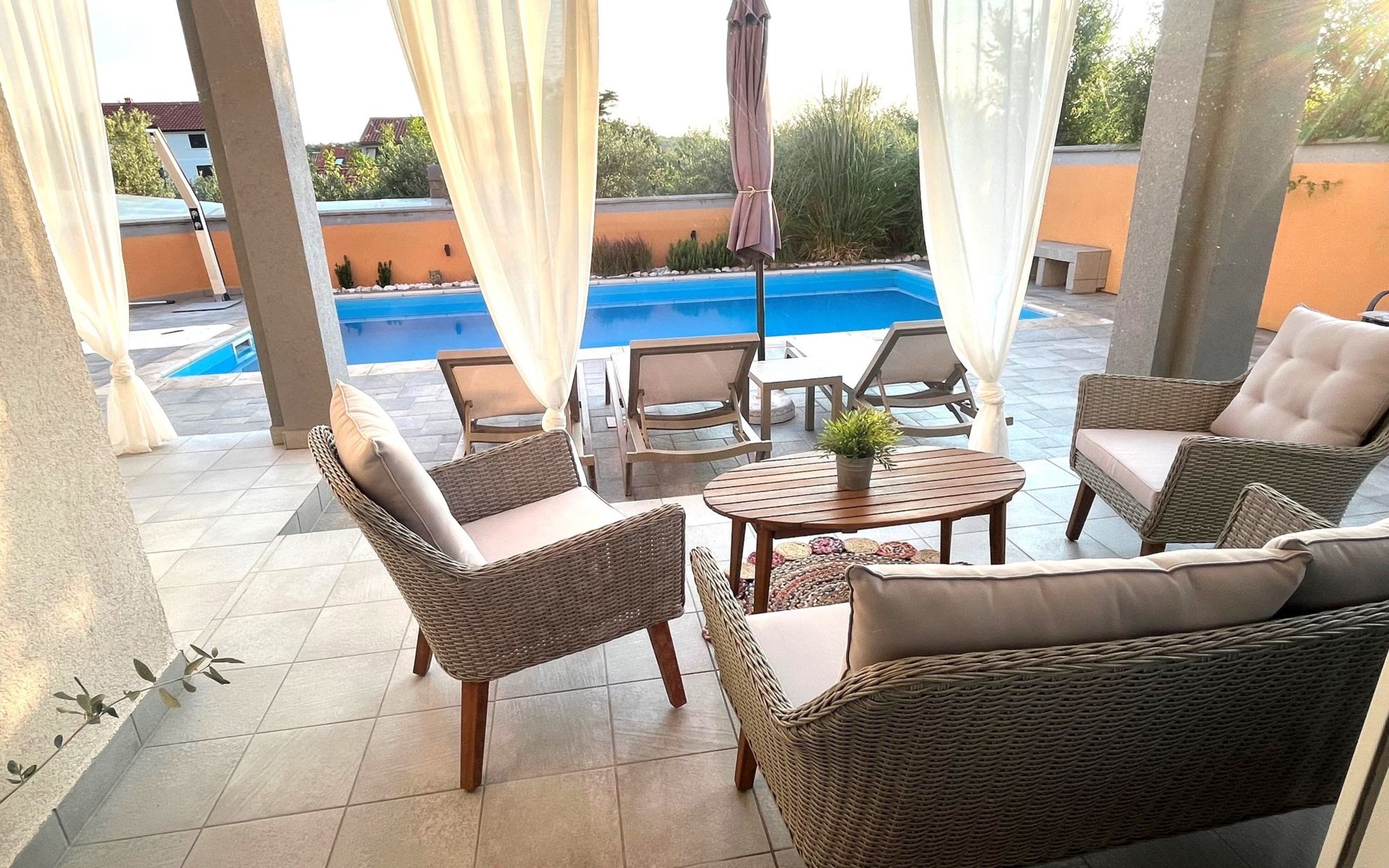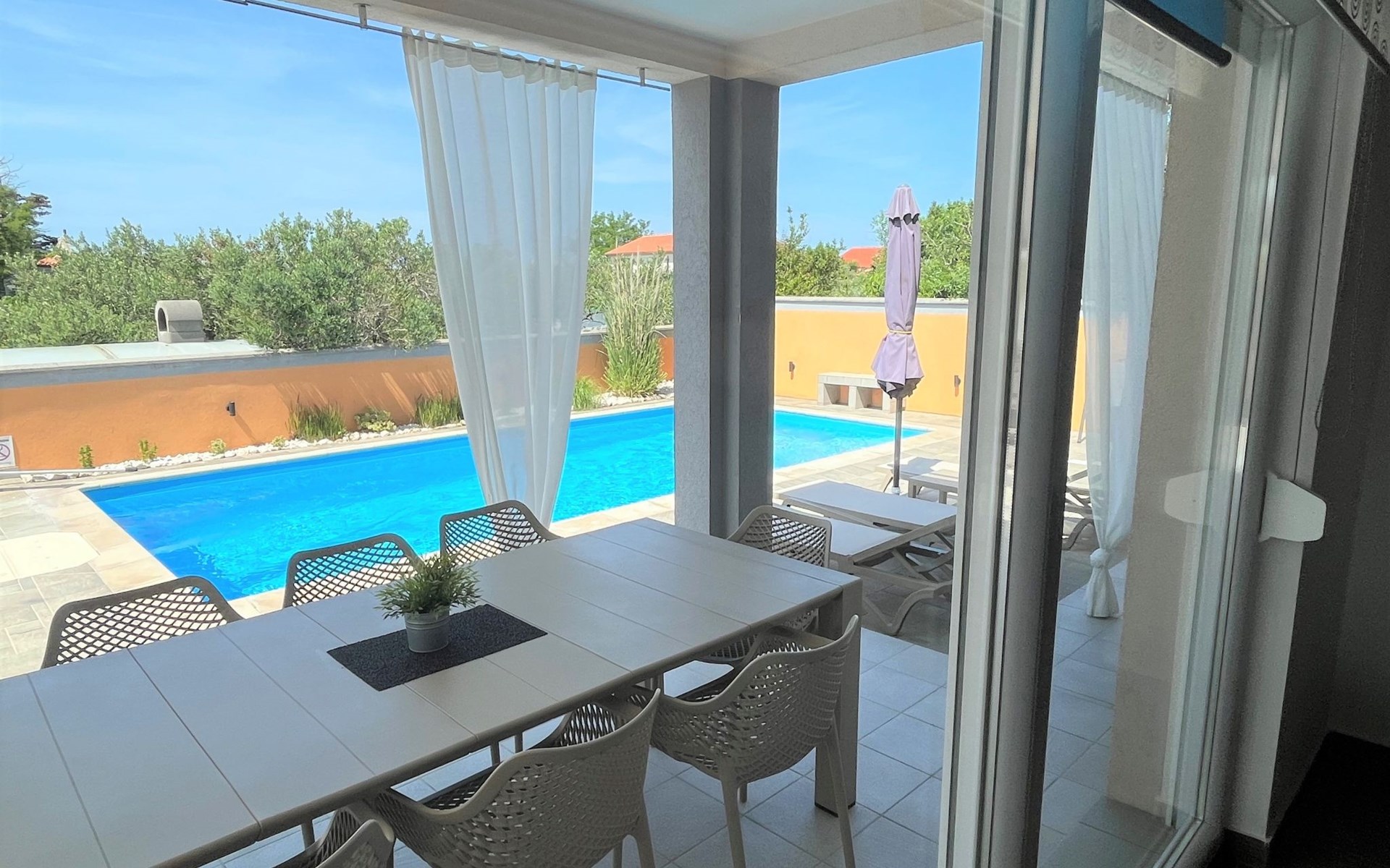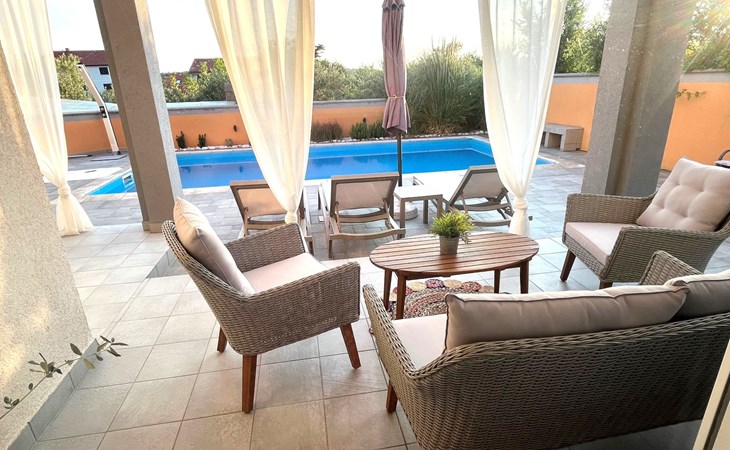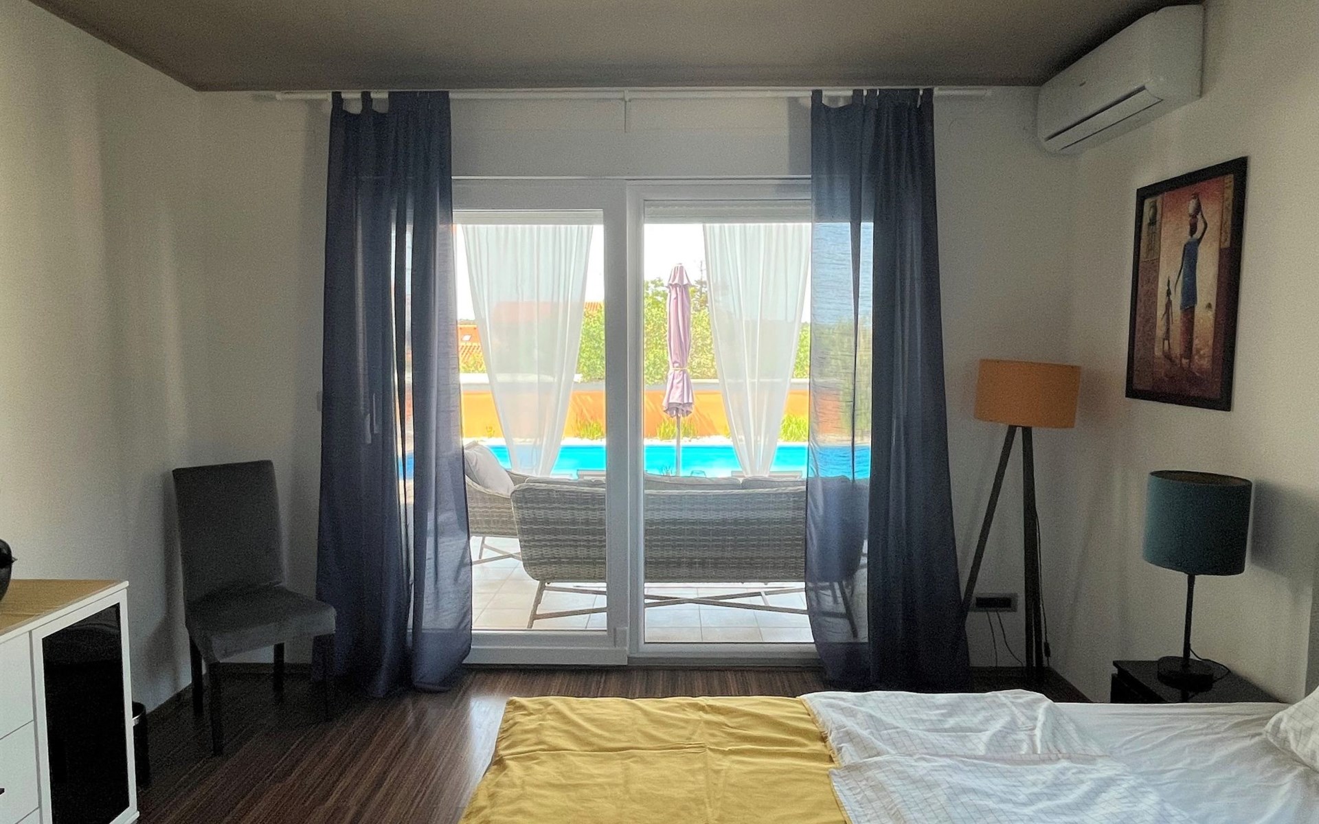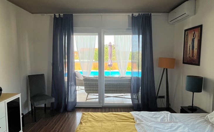 You will have total private moment in garden, thanks to greenery all over the garden.The open ground floor offers a living room with dining area and kitchen, from where you have direct access to the pool and the covered terrace. In the dinning room , seating on the huge sofa bed you can enjoy a view on the garden and pool, or just resting and watching flat TV . A bedroom with double bed and own bathroom, as well as a guest toilet can also found on the ground floor. In the morning, you can use direct access to the pool from the ground floor bedroom, and enjoy in the swimming directly from the bed.