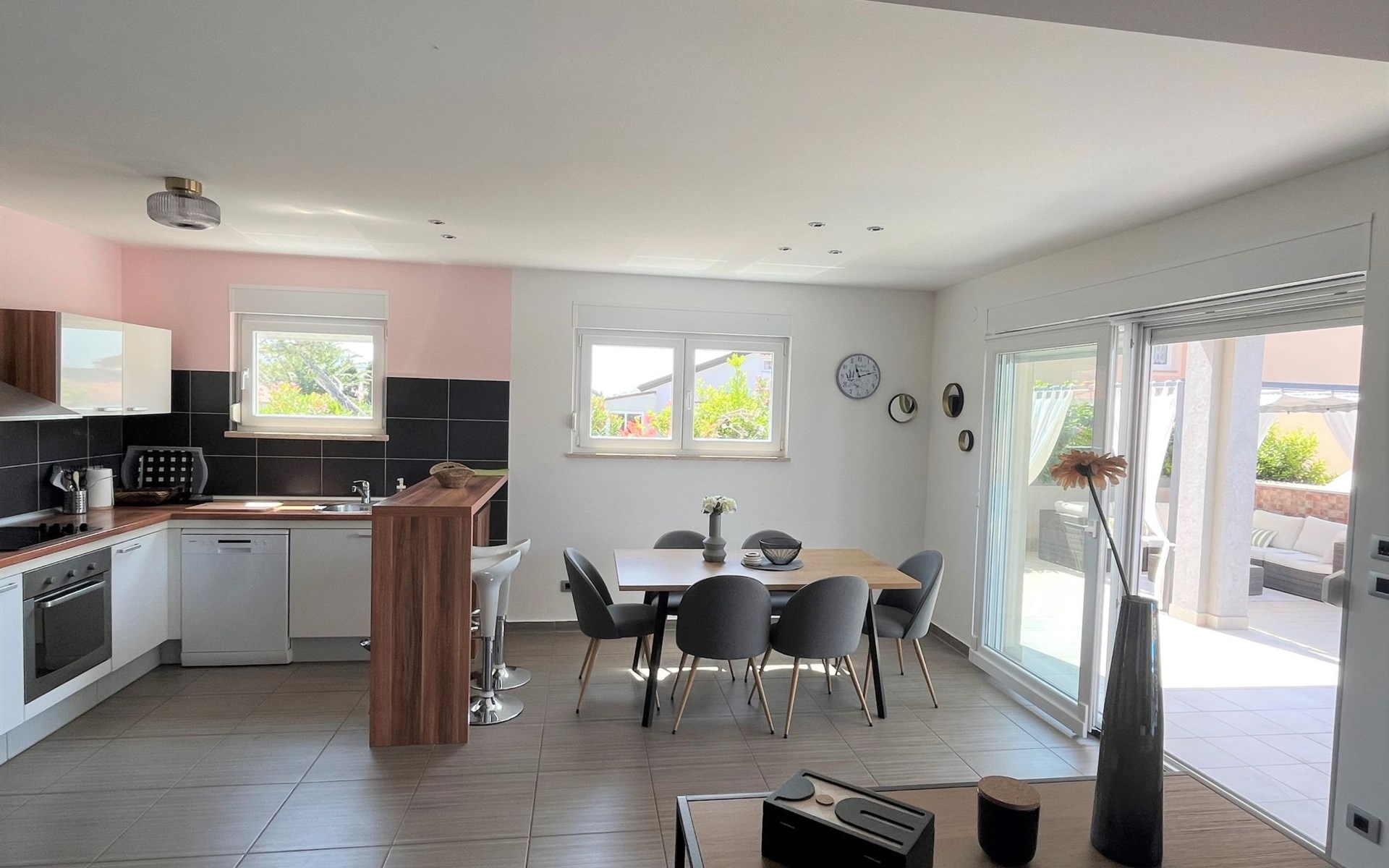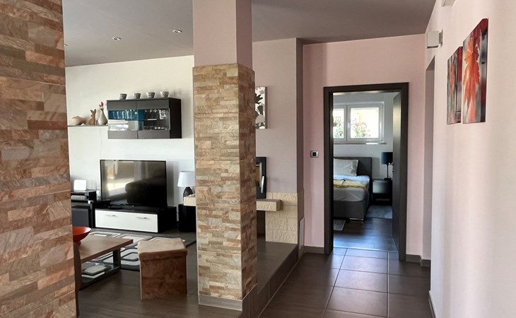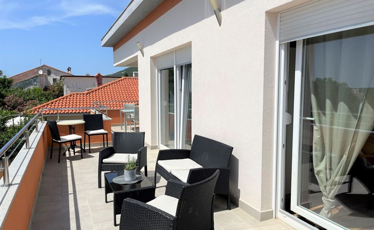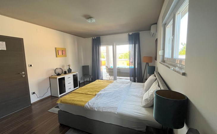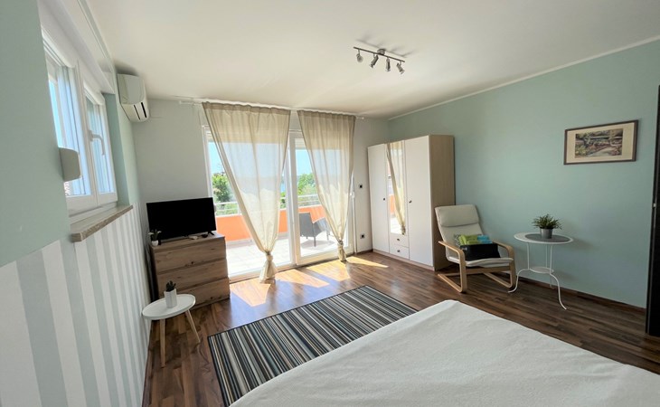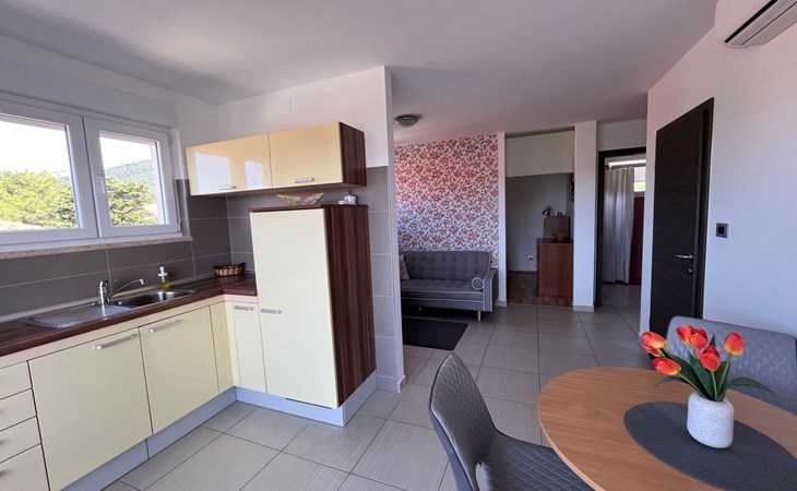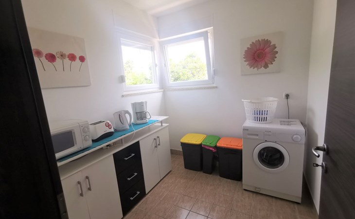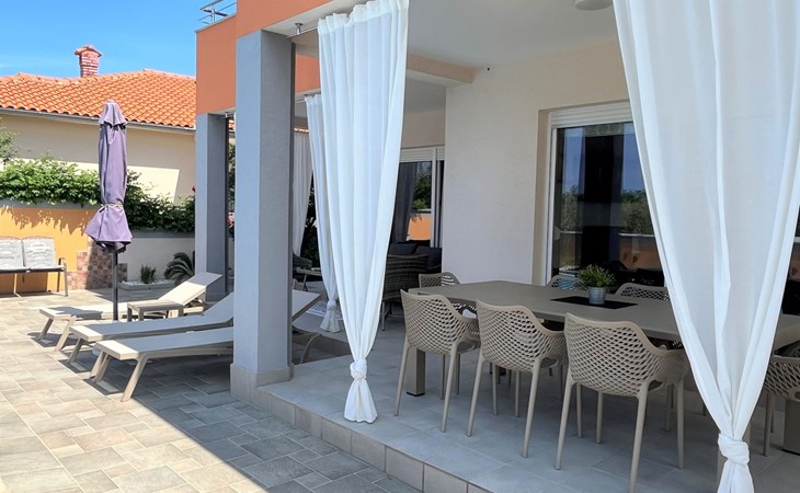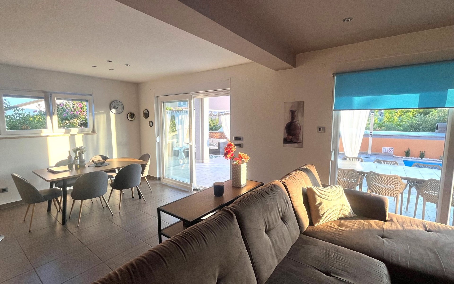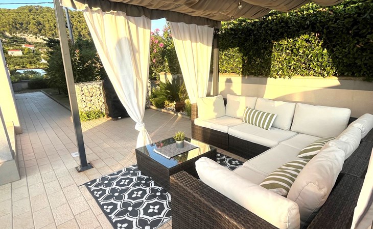 All bedrooms on the first floor are connected with an open terrace while apartment has a covered balcony with a cosy seating area, from where a beautiful view extends over the surroundings and the sea in the distance.A grocery shop is just few steps from the house. The beach is also very close, just 90 meters from the house.