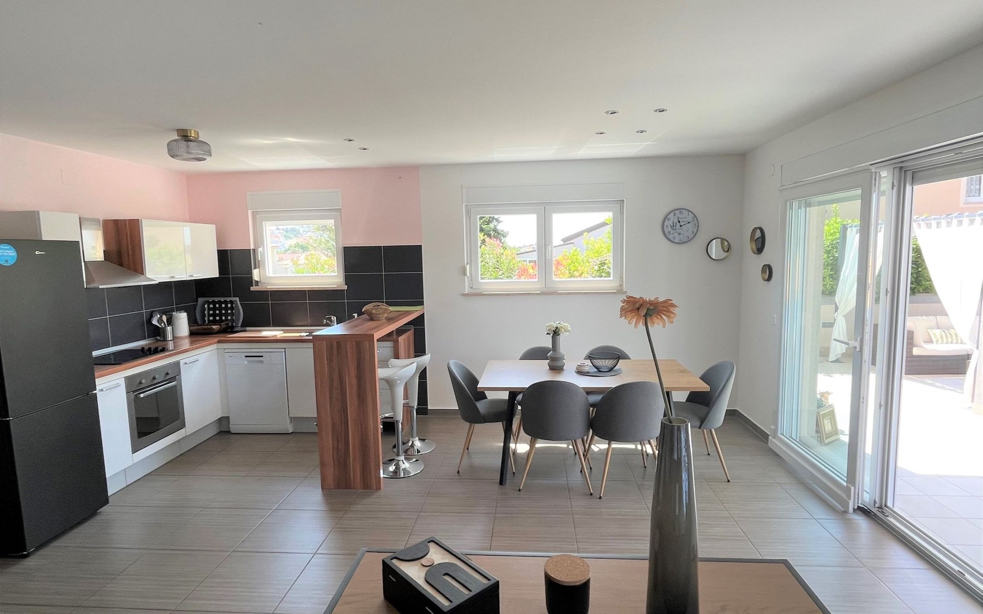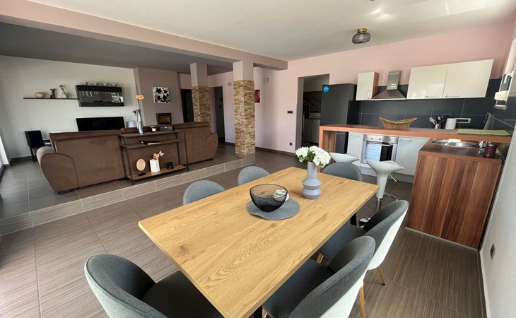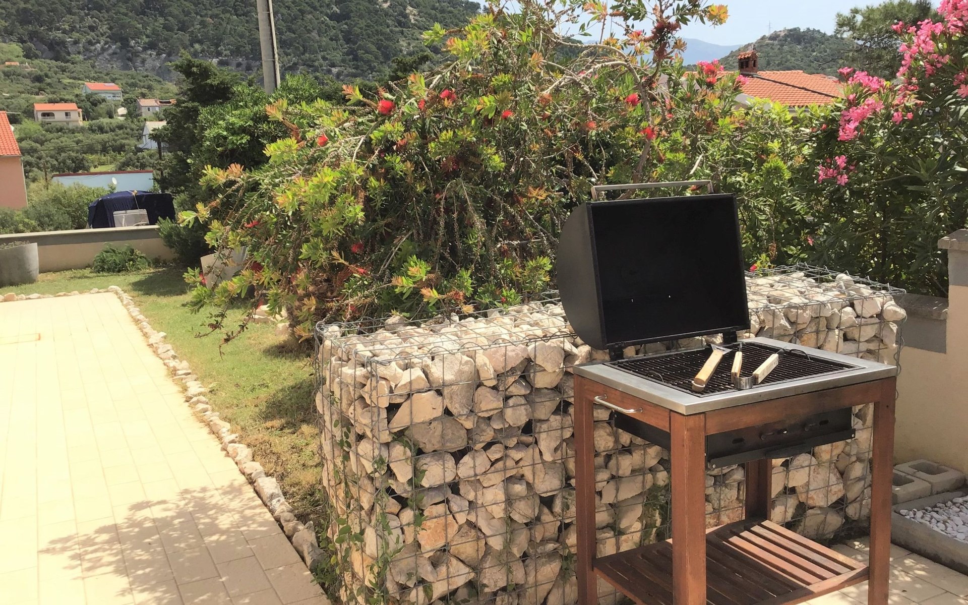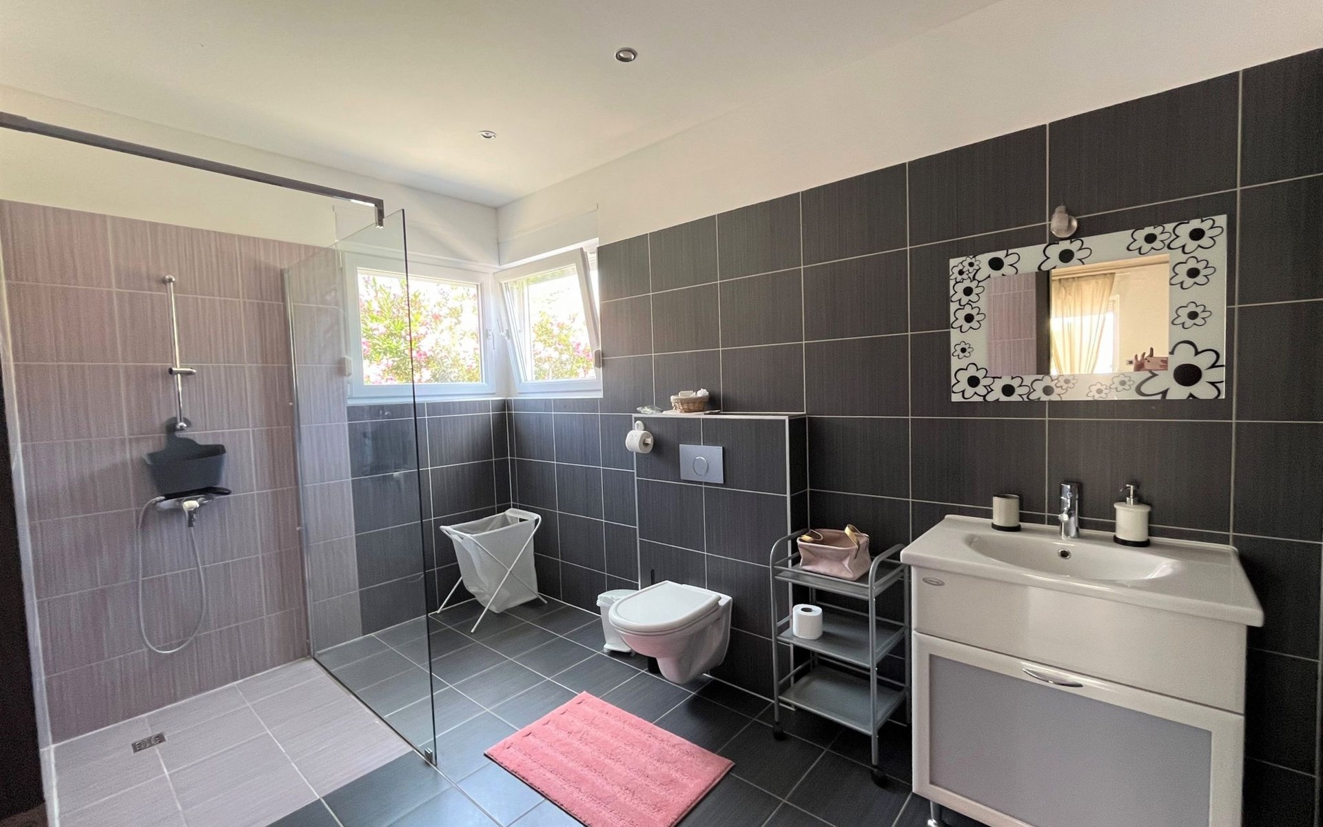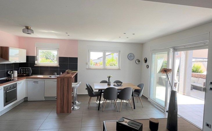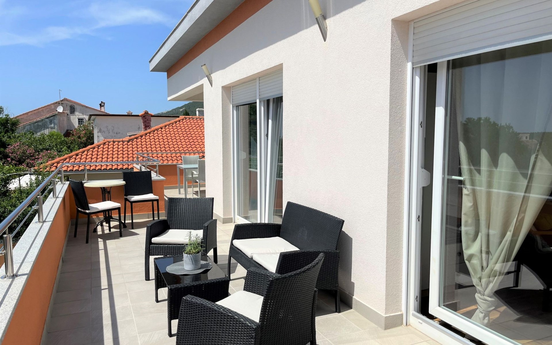 All bedrooms on the first floor are connected with an open terrace while apartment has a covered balcony with a cosy seating area, from where a beautiful view extends over the surroundings and the sea in the distance.A grocery shop is just few steps from the house. The beach is also very close, just 90 meters from the house.