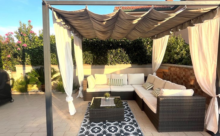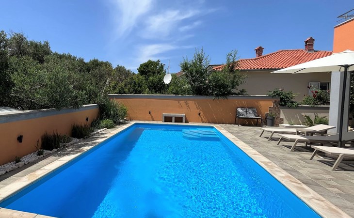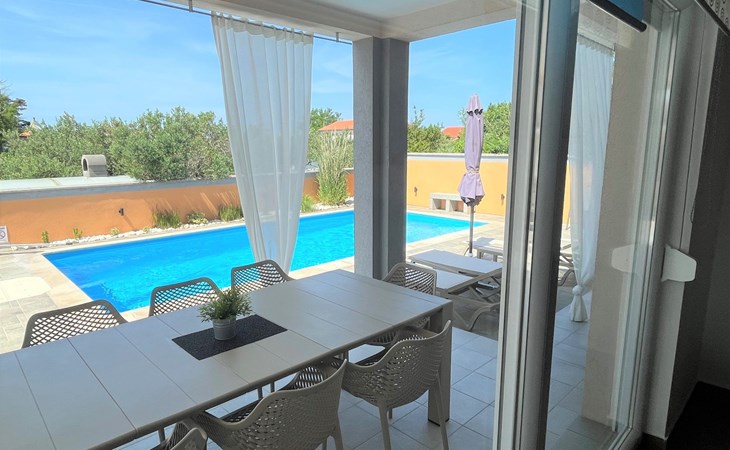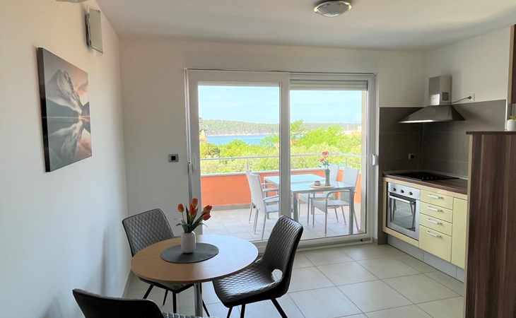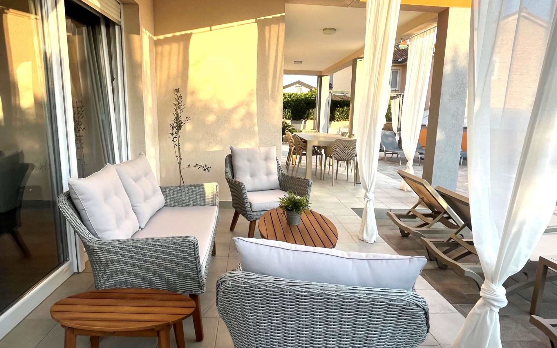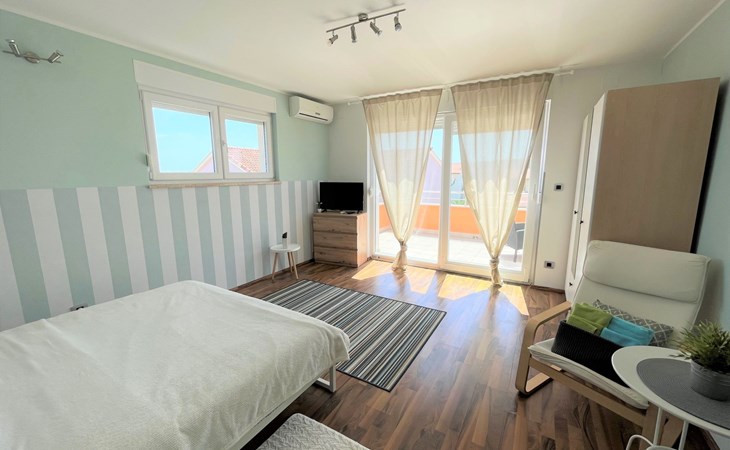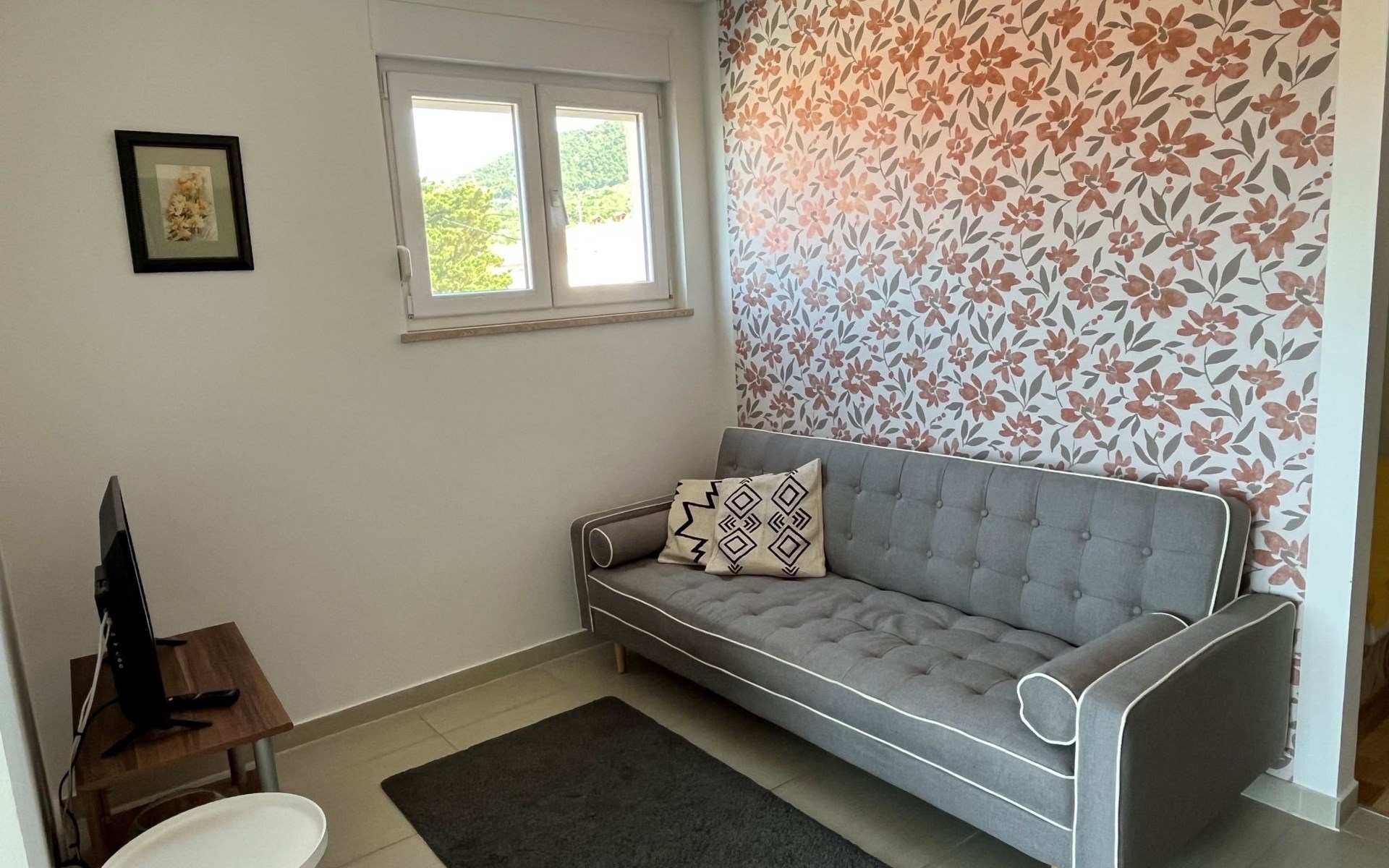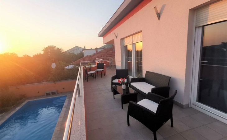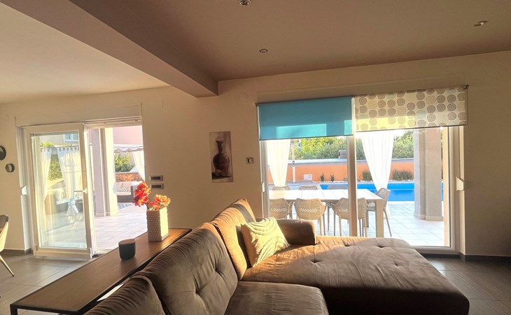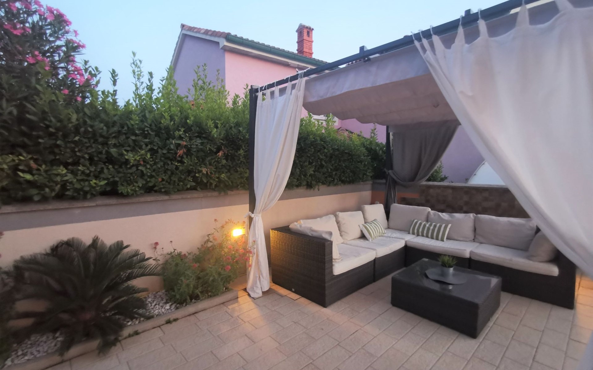 All bedrooms on the first floor are connected with an open terrace while apartment has a covered balcony with a cosy seating area, from where a beautiful view extends over the surroundings and the sea in the distance.A grocery shop is just few steps from the house. The beach is also very close, just 90 meters from the house.