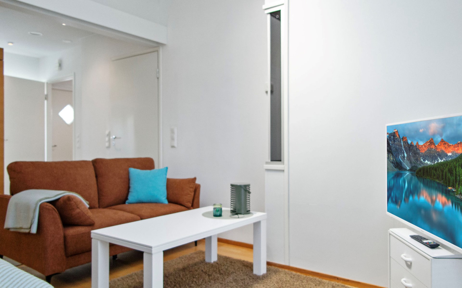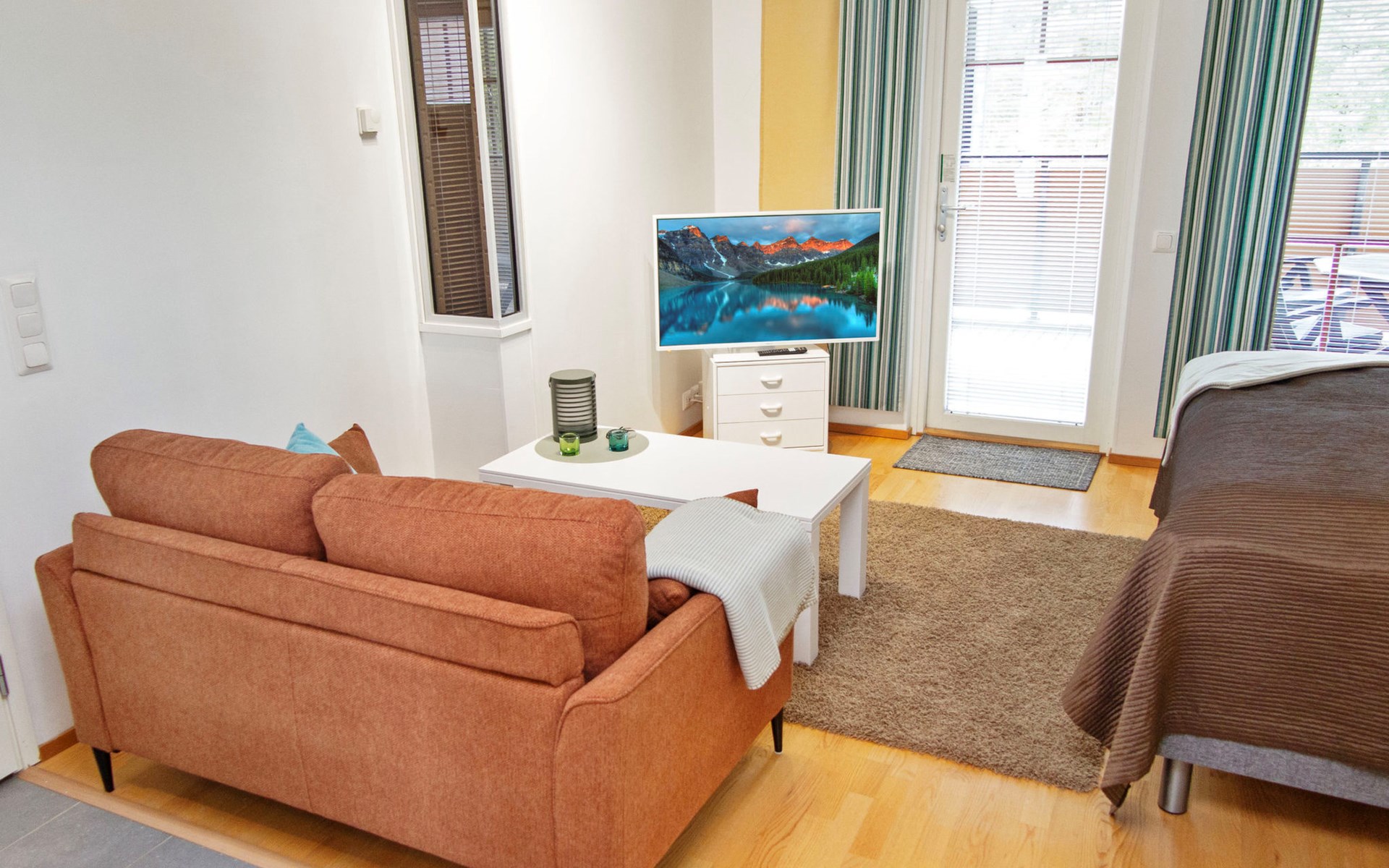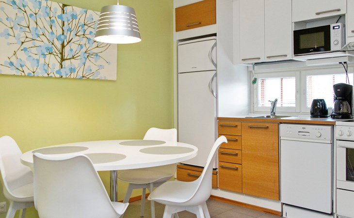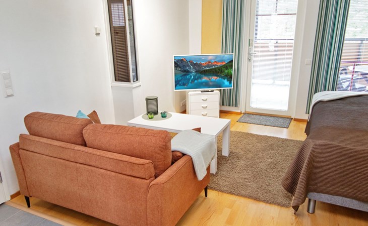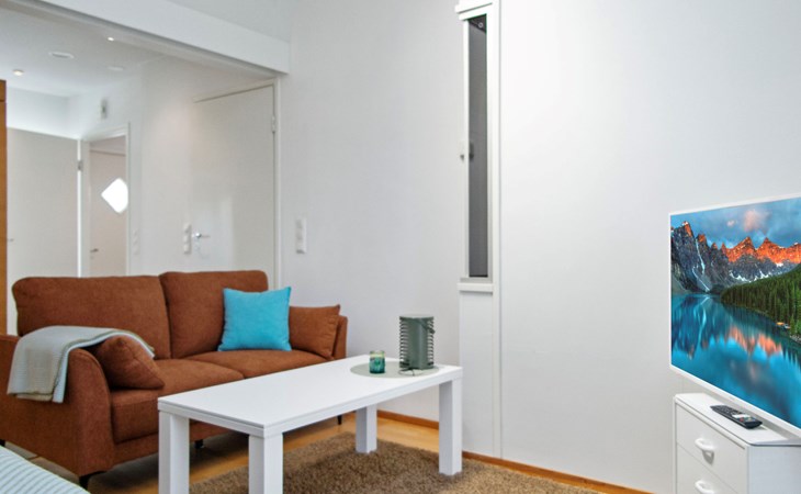The apartment features a practical and comfortable living area with a brand new, plush double bed that guarantees a restful night’s sleep. The spacious bathroom includes two showers and your own private sauna with an electric heater – perfect for a touch of everyday luxury.