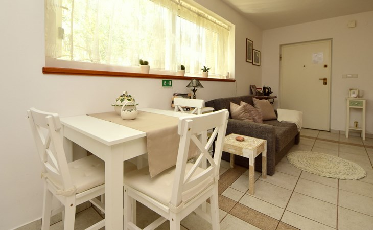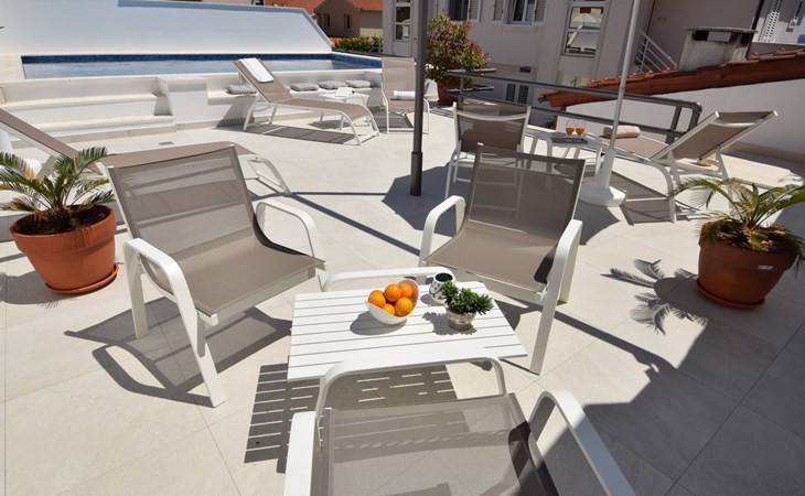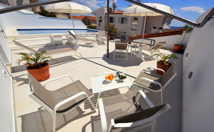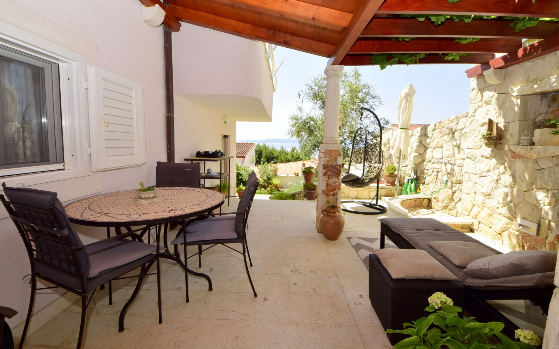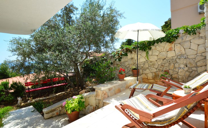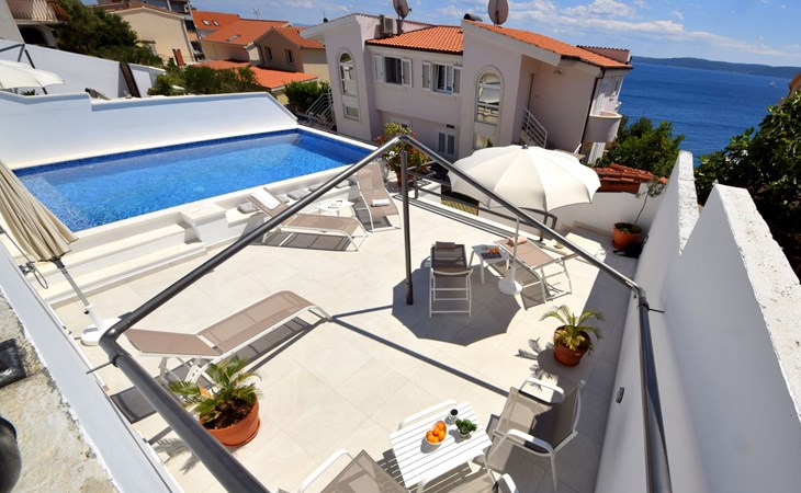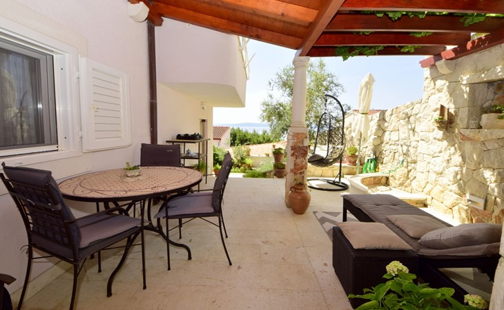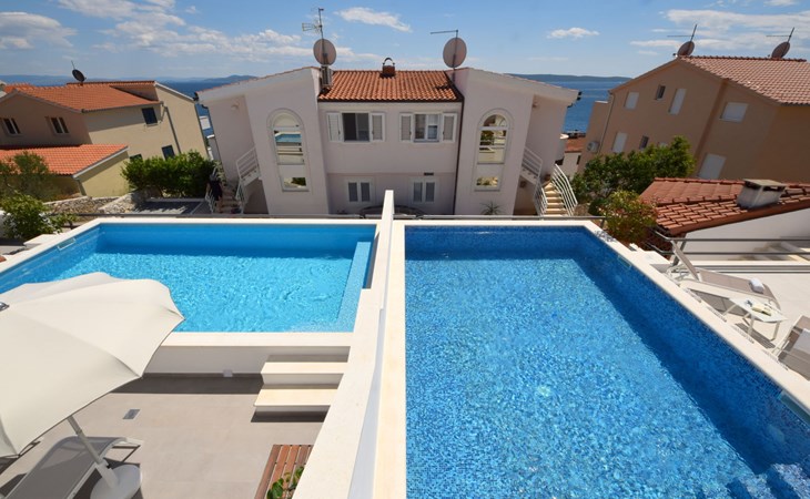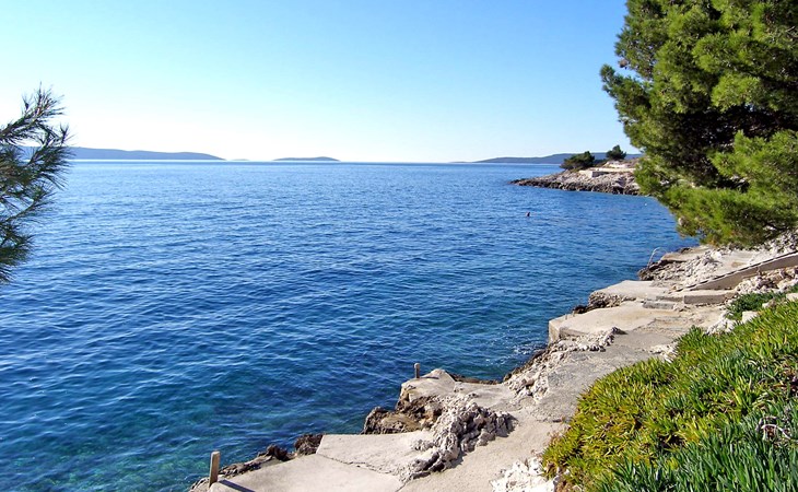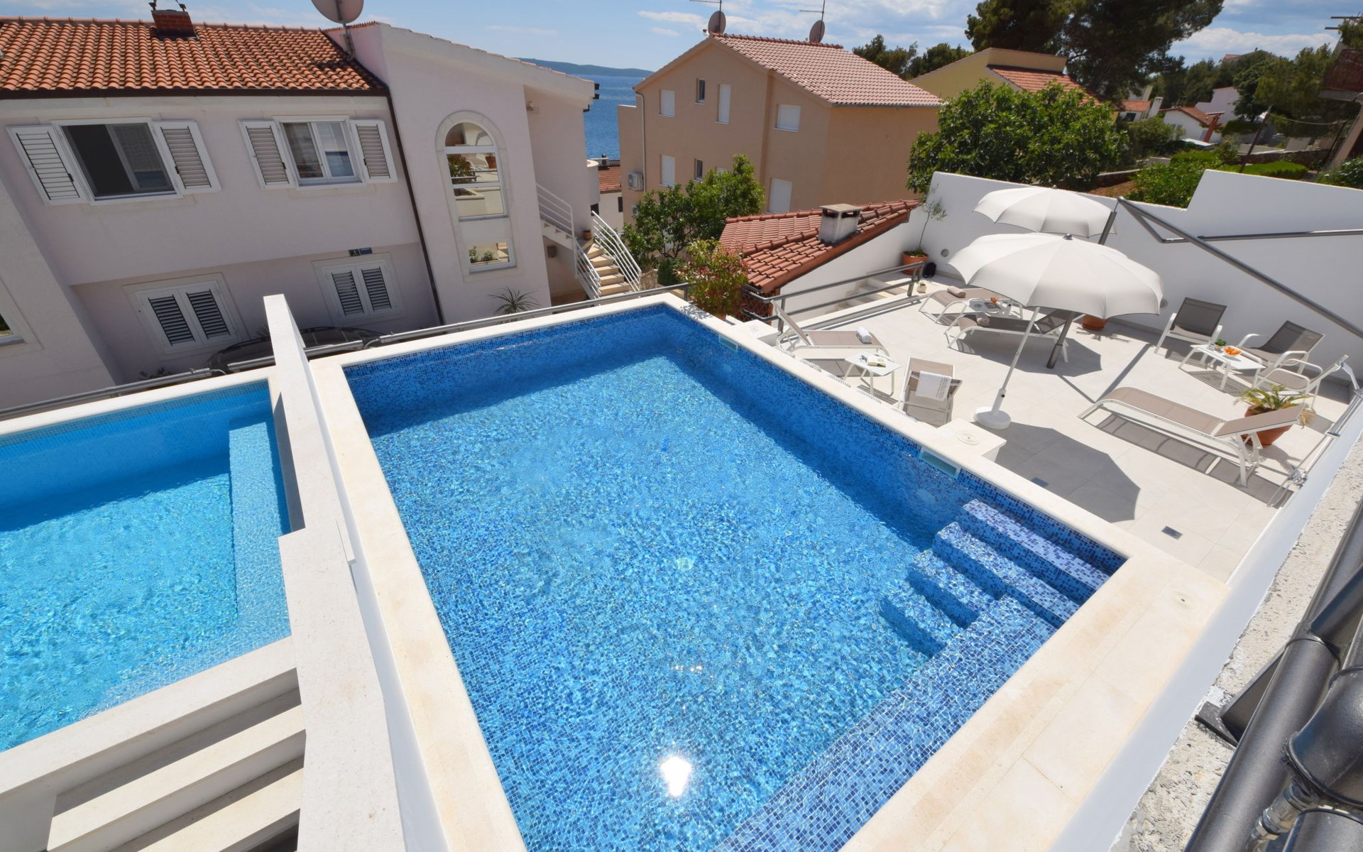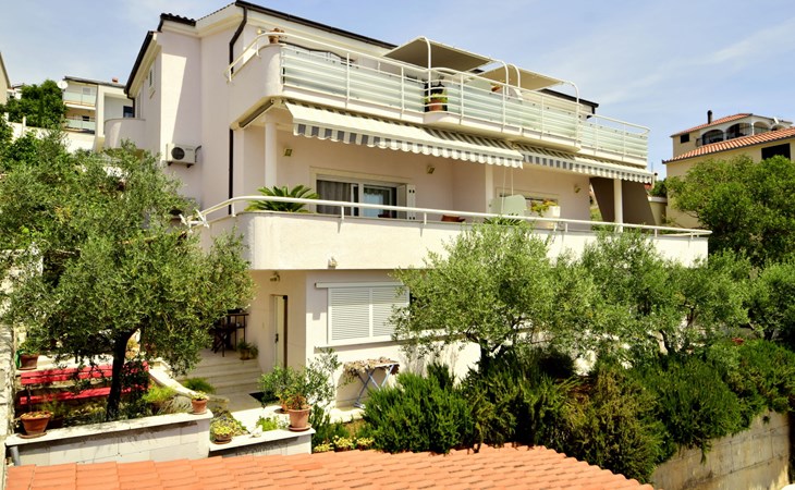 Okrug Gornji (Čiovo) 6 km van Trogir: Appartementencomplex "Villa Meri". 1.5 km van het centrum van Okrug Gornji, rustige, zonnige, verhoogde ligging, 60 m van zee, 60 m van het strand. Voor medegebruik: openluchtzwembad hoekig (7 x 4 m, 30 m2, 140 cm diepte, seizoensgebonden beschikbaarheid: 01.Mei. - 15.Okt.) met trap. Buitendouche, terras (60 m2), tuinmeubelen, barbecue. In het huis: internetaansluiting. Toegangsweg tot aan het huis. Parkeerplaats op 100 m op het terrein. Winkel 250 m, restaurant 200 m, bushalte 1.8 km, kiezelstrand 150 m, rotsstrand 60 m. Vliegveld 6 km van het huis. Vergelijkbare accommodaties kunnen worden geboekt. Object referentie: HR4910.303 is gelegen op hetzelfde terrein.