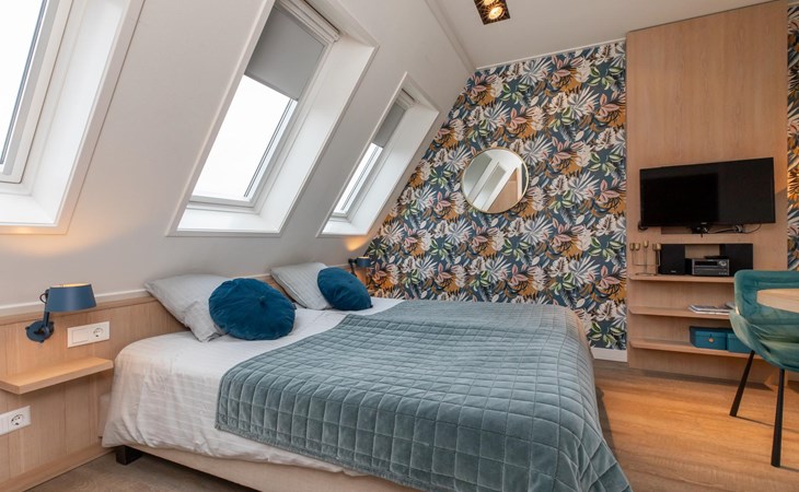 Na een dag vol strandavonturen wacht je een heerlijk ruim bed van 180x200cm. De twee losse matrassen van 90x200cm zorgen ervoor dat jij en je partner optimaal kunnen uitrusten. Handige nachtkastjes aan weerszijden bieden plek voor je boek of een glas water. Je kleding berg je eenvoudig op in de schuine kledingkast.