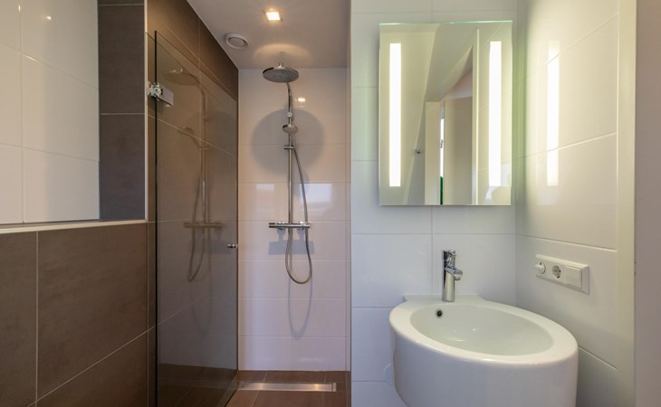 De aangrenzende badkamer is een oase van rust. Kies tussen een ontspannend bad in het ligbad of een verfrissende douche onder de regendouche in de separate inloopdouche. De wastafel en het toilet maken deze ruimte compleet.