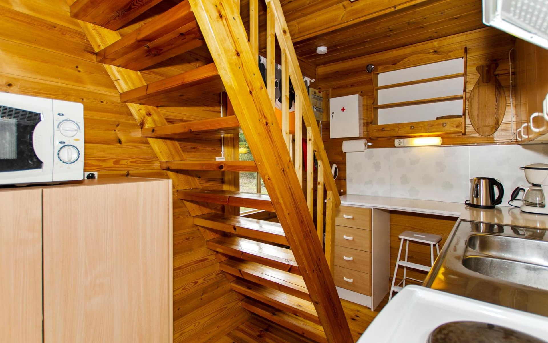 Steep stairs lead to the upper floor. There is a portable air conditioner on the upper floor.