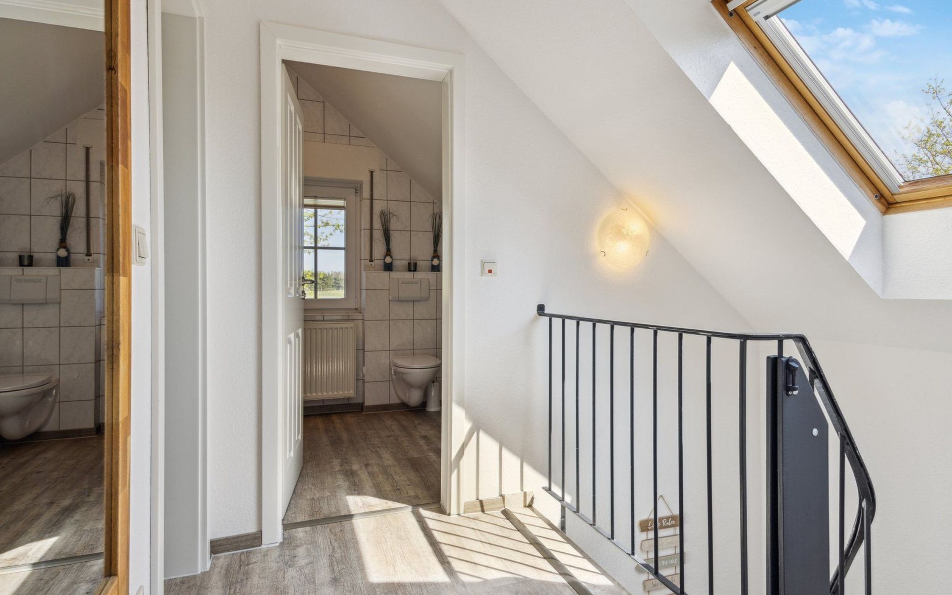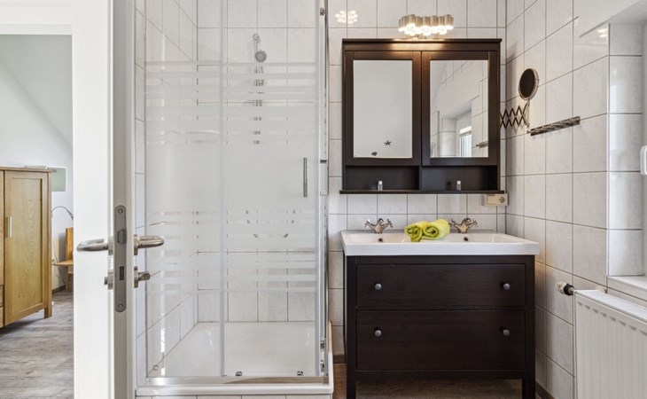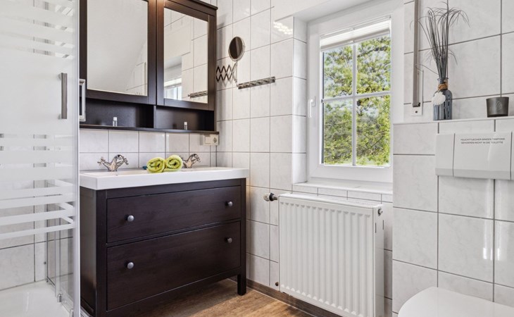 In addition, there is a modern bathroom with a shower, double vanity, and window, as well as a separate guest toilet.