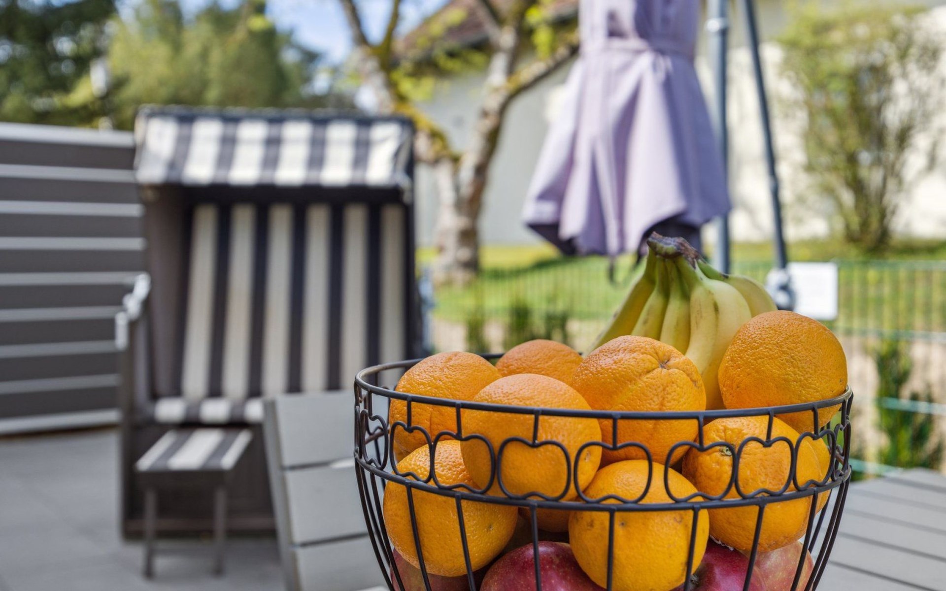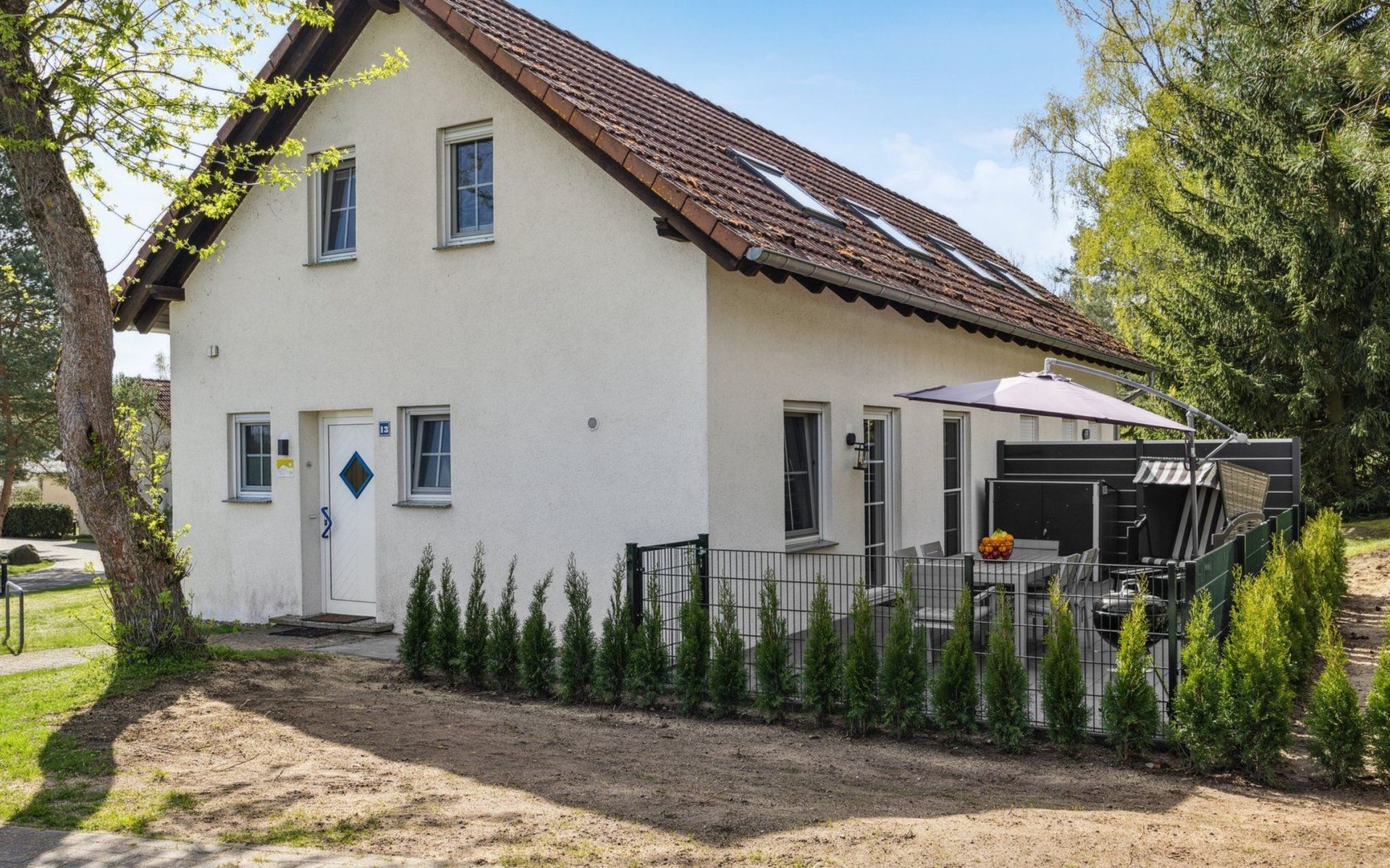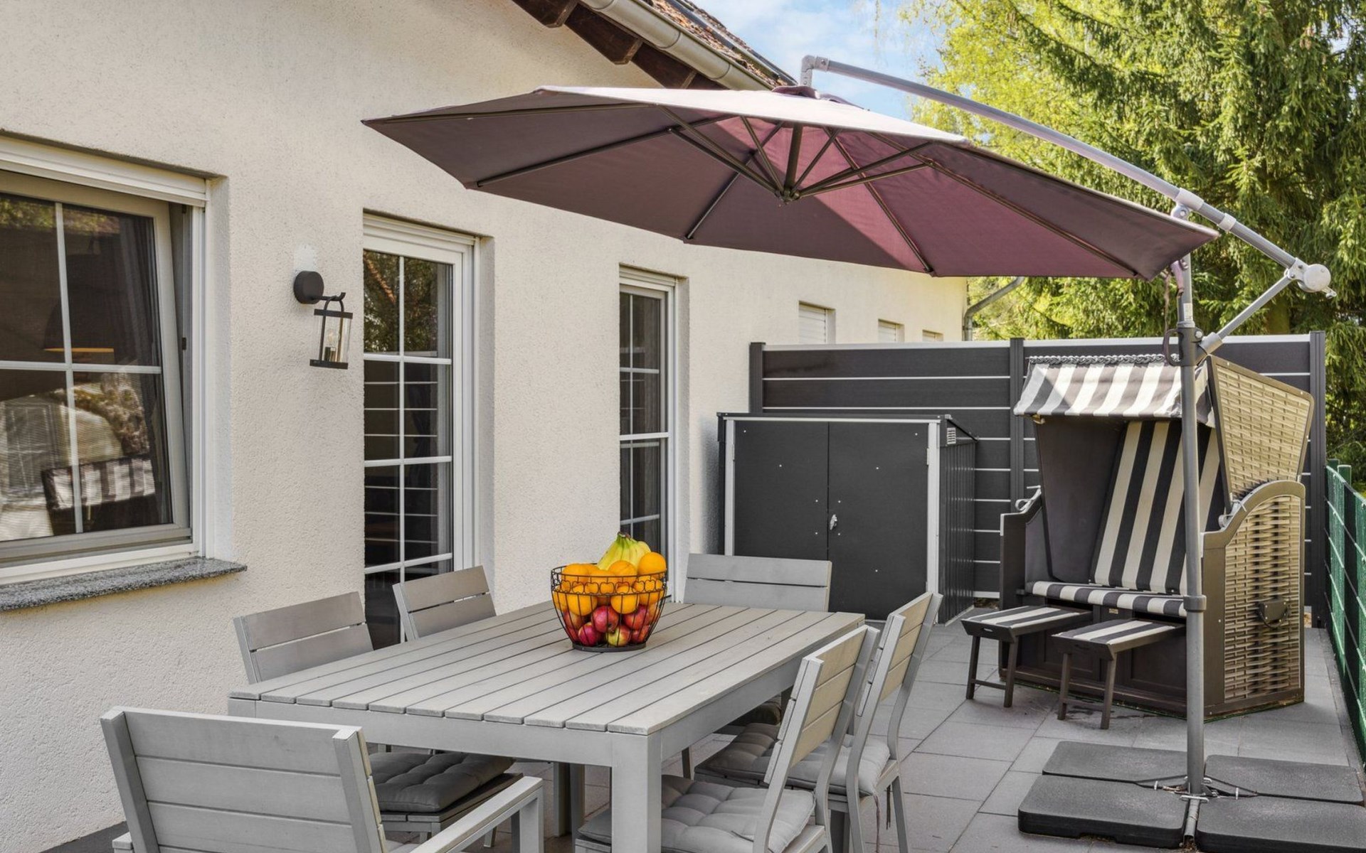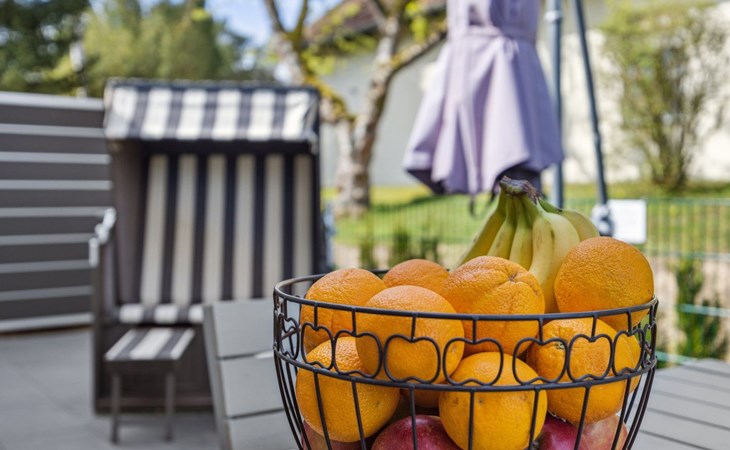 In the garden, a furnished terrace with a table and six seats, a large sun umbrella, a beach basket, sun loungers, and a grill await you – perfect for relaxed holiday days in the green.