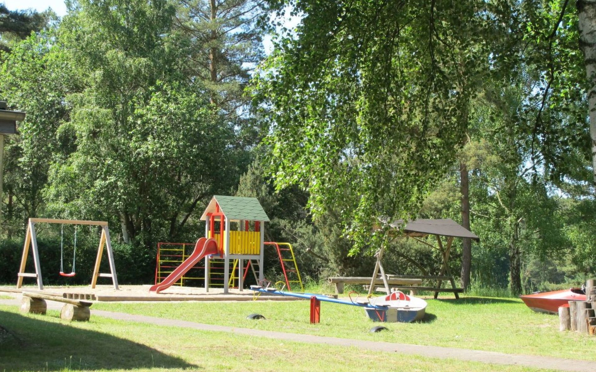 The holiday park offers numerous amenities such as a playground, table tennis room, bicycle rental, and its own swimming area. In the immediate vicinity, you will also find boat rentals as well as diverse leisure and sports opportunities: fishing, cycling and hiking tours, horseback riding, golf, water sports, tennis, canoeing and kayaking, mountain biking, and much more.