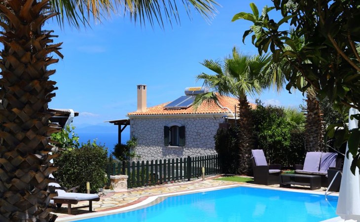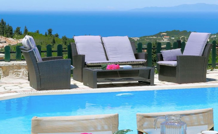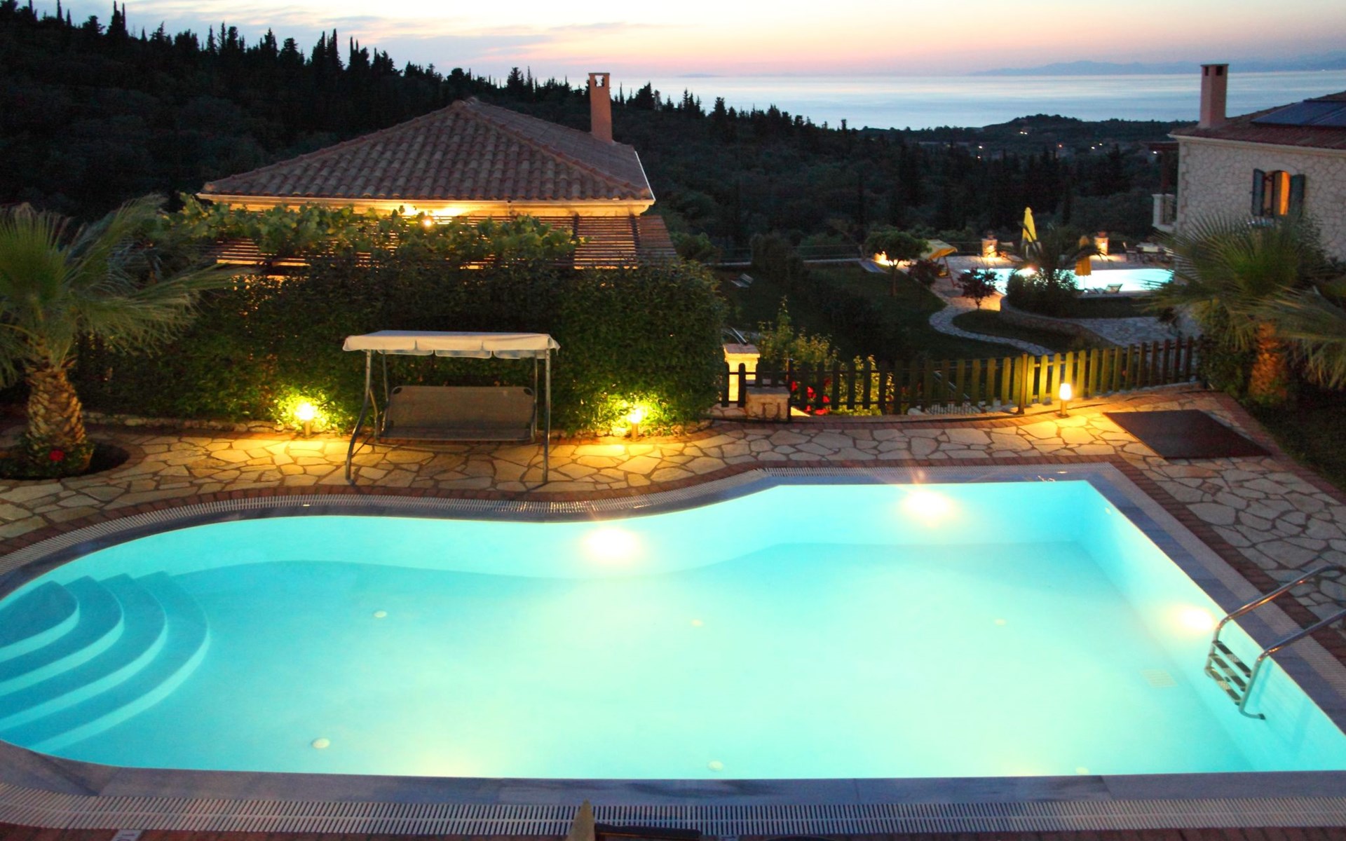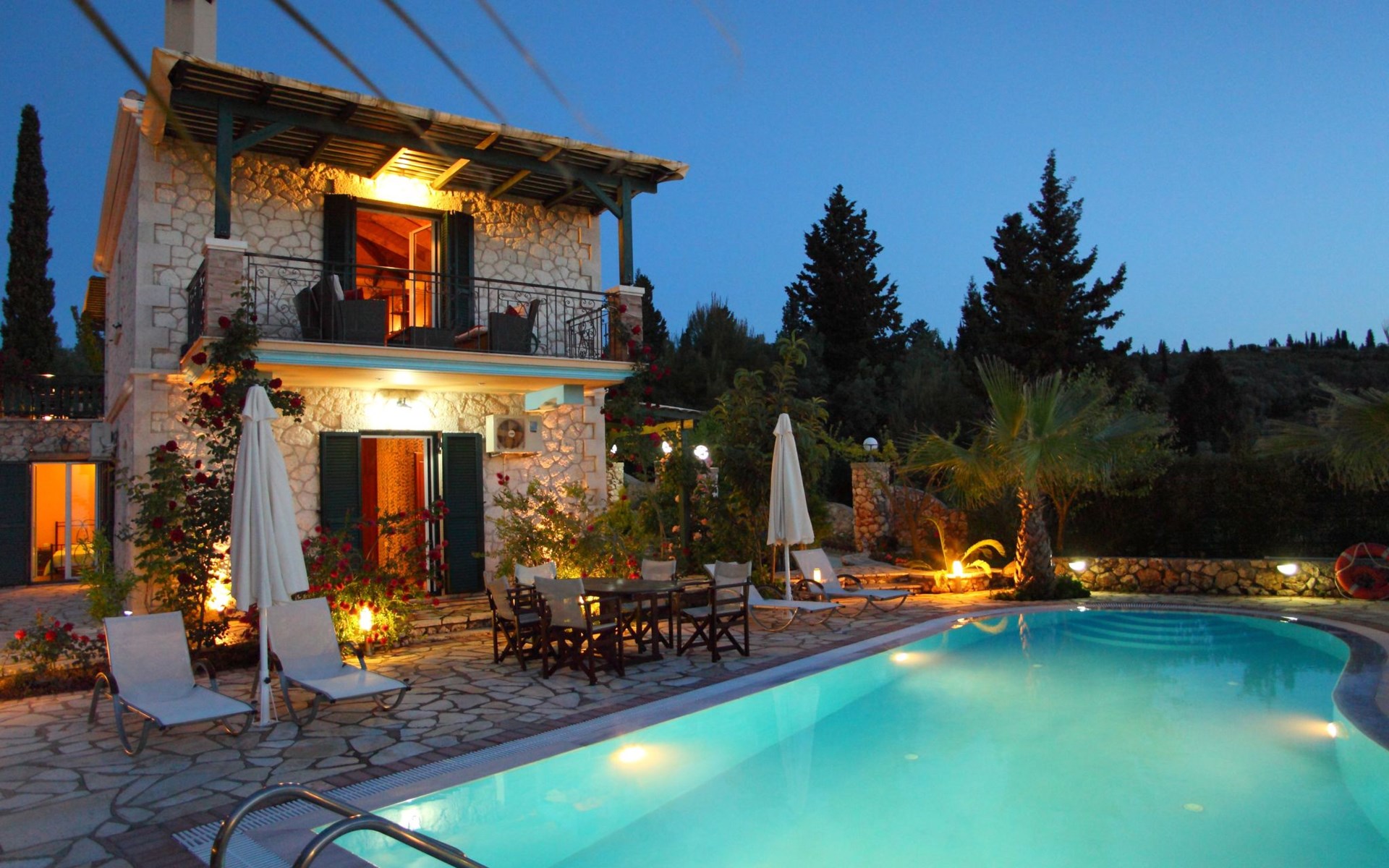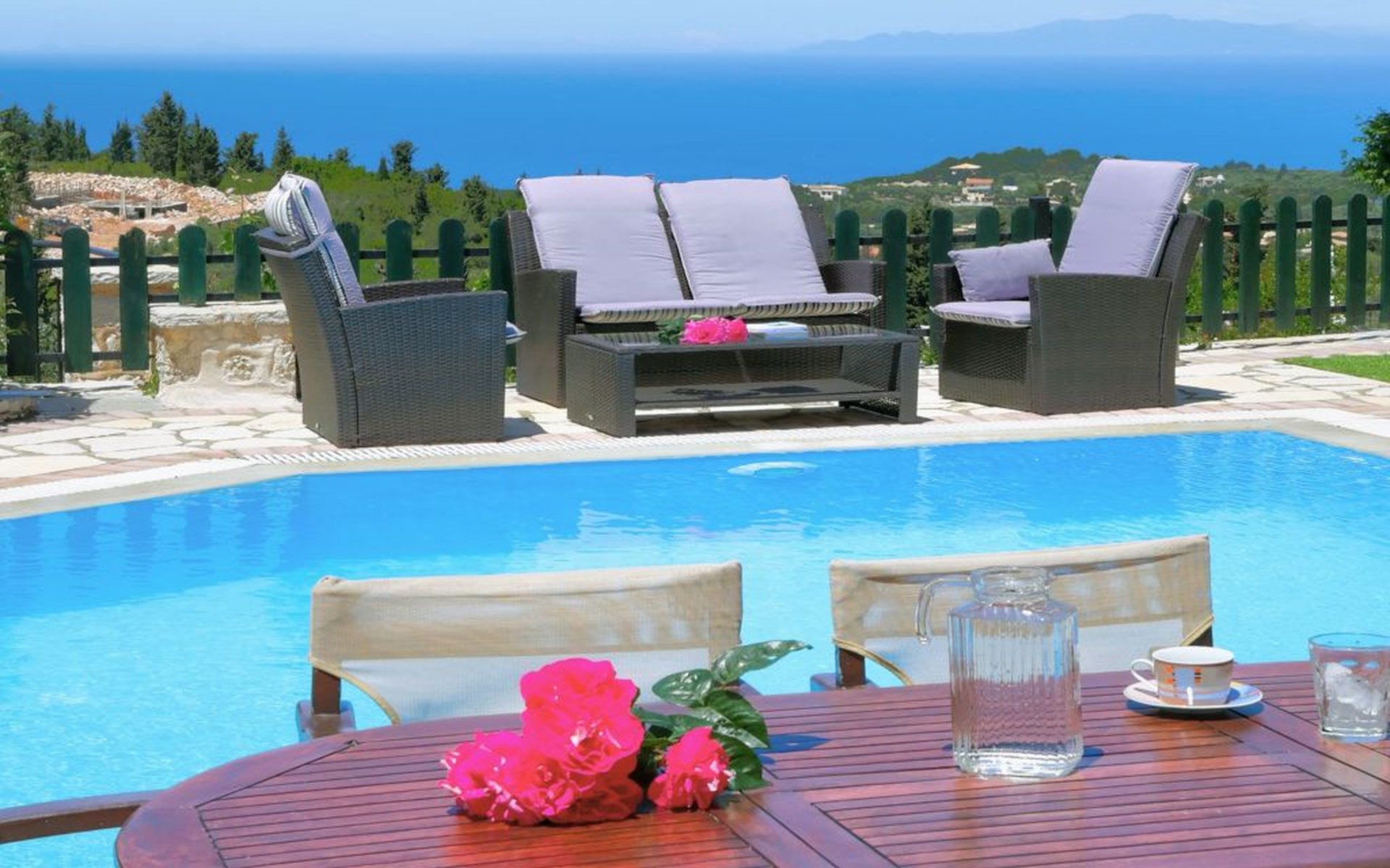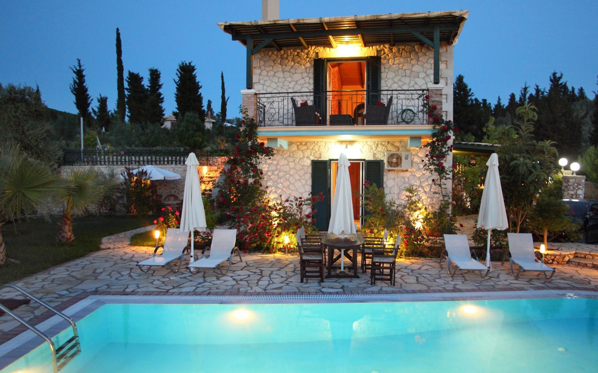 Villas Goudis are in complete harmony with the natural environment. They provide amazing view, the sunset in Ionian Sea. Each villa is independed and allocates swimming pool, green garden with flowers, bbq and parking. All villas are beautifully decorated and are separated in two floors.Lefkada is one of the most beautiful island of Greece and the only one with easy access. Picturesque villages, harbors, small islands, hidden beauty of the mountains and especially the famous beaches, make the best impression to its visitors. Apart from its natural beauty, is also featured with culture and tradition, with a series of events and activities taking place mainly in the summer months on the island. Tsoukalades is located on the west side of the island, in a lush green setting, overlooking the endless blue of the Ionian Sea, and a beautiful sunset! The village is located near the town of Lefkada and the famous beaches Pefkoulia, Agios Nikitas and Kathisma. It is named from the red clay available in the area which they used to make earlier pottery (tsoukalia). It is one of the most beautiful tourist resorts on the island with many amenities for its guests (taverns, cafeterias, mini markets etc.). "Goudis" villas, are located in the most beautiful part of Tsoukalades, in a lush green environment and with a spectacular view to the Ionian Sea. They are fully equipped, and cover every need of their guests, while there is ample parking, pool, barbecue and a beautiful gardenVilla Evelyn is a wonderful three-bedroom villa, ideal for up to 8 people. When you enter the villa from the first floor, you will walk into the spacious living room with as centerpiece the stone built fireplace. Next to the living room is the fully equipped open plan kitchen. From this floor, you have access to the large terrace to admire the view while relaxing at the outdoor seating area. There is a bathroom on this first floor with a shower for your convenience.Down the internal staircase, on the ground floor, are three bedrooms and a family bathroom with a Jacuzzi for you to enjoy. There are two bedrooms with double beds and one with two single beds. All bedrooms have direct access to the lovely pool area.The private outdoor area of Villa Evelyn offers a lush green garden with colorful flowers, trees with seasonal fruit, and a stone built BBQ. You will love the afternoons enjoying the magical sunsets while cooling down with the soft touch of the mountain breeze, making memories that will stay forever in your heart.The final touch is the blue water of the large swimming pool that becomes one with the horizon and the endless blue of the Ionian Sea.Villa Evelyn is an ideal choice for you and your family that promises a comfortable and unforgettable stay on Lefkada Island. 1307673