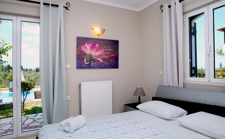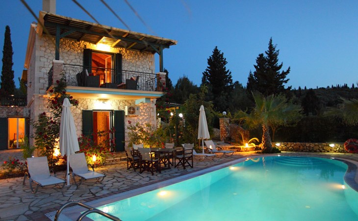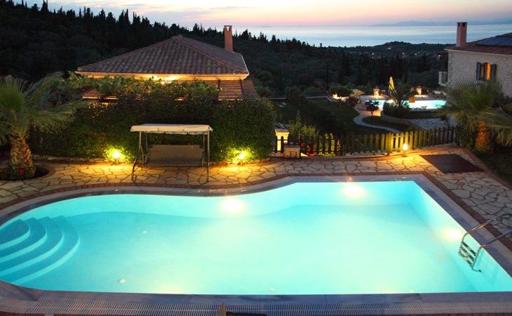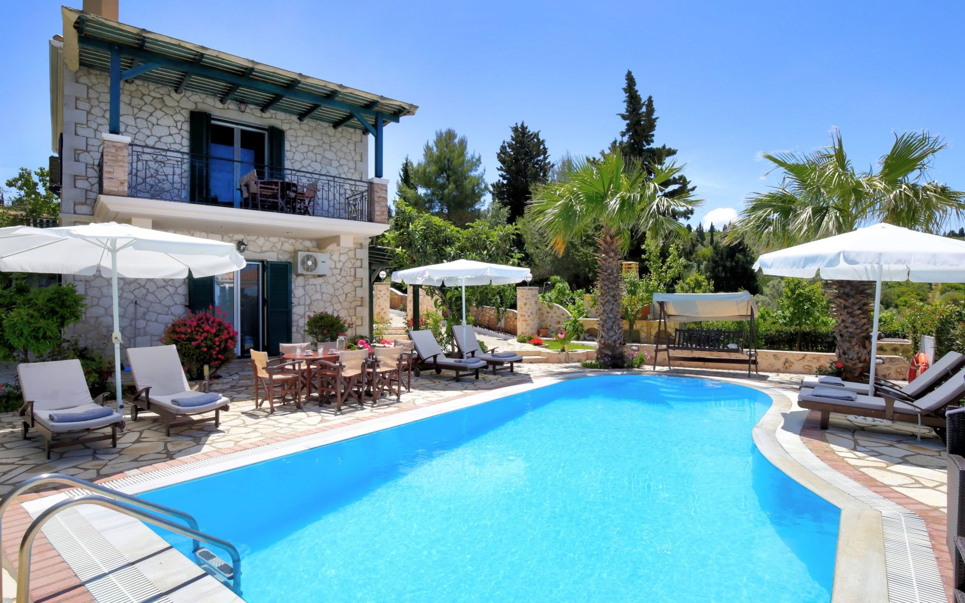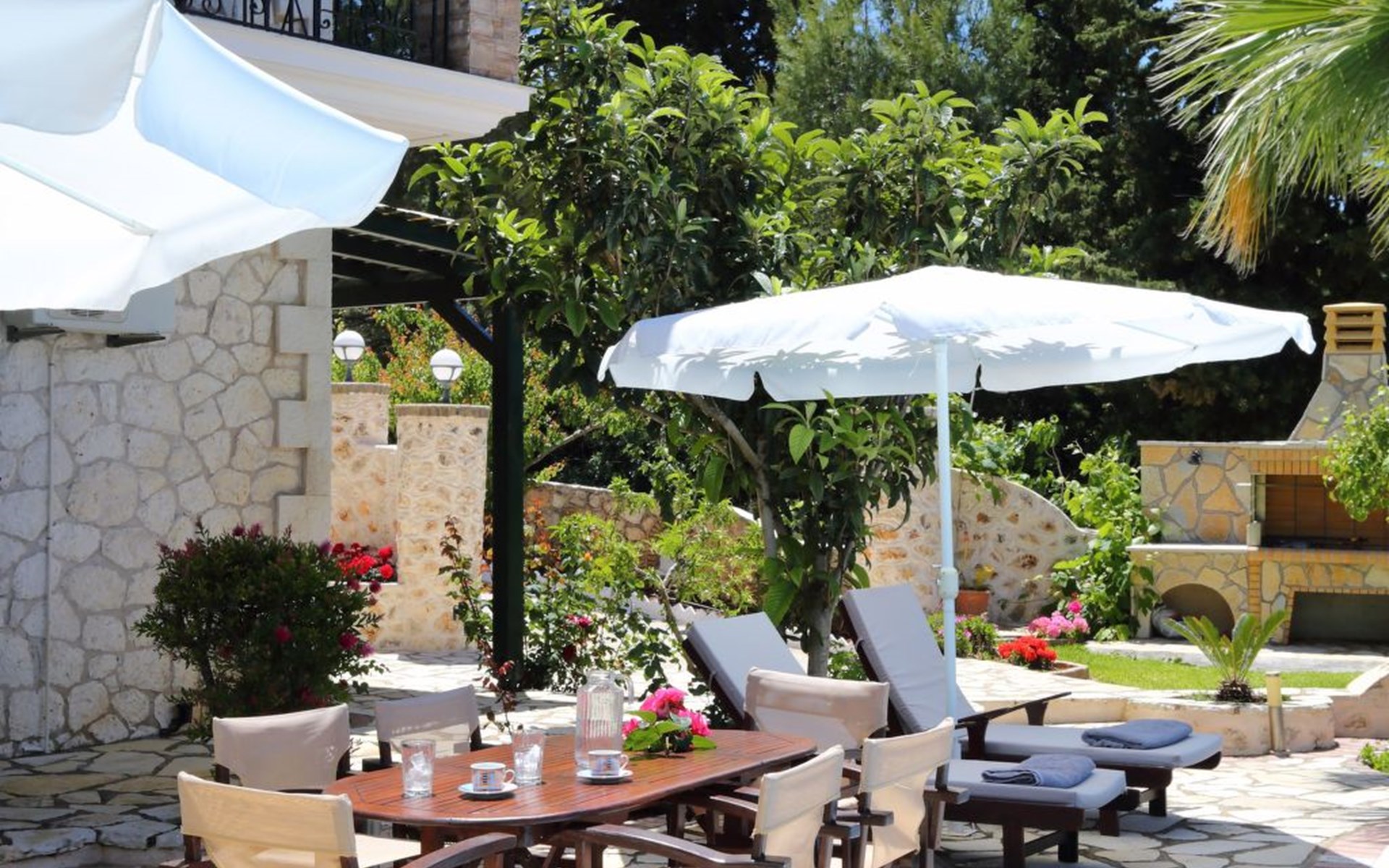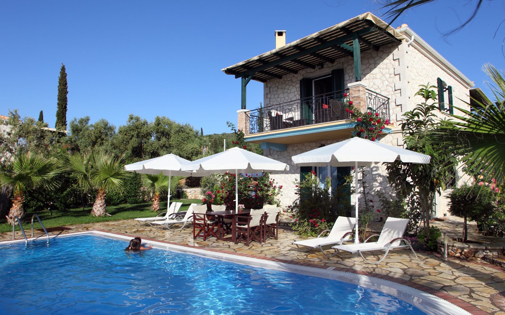 Villas Goudis are in complete harmony with the natural environment. They provide amazing view, the sunset in Ionian Sea. Each villa is independed and allocates swimming pool, green garden with flowers, bbq and parking. All villas are beautifully decorated and are separated in two floors.Lefkada is one of the most beautiful island of Greece and the only one with easy access. Picturesque villages, harbors, small islands, hidden beauty of the mountains and especially the famous beaches, make the best impression to its visitors. Apart from its natural beauty, is also featured with culture and tradition, with a series of events and activities taking place mainly in the summer months on the island. Tsoukalades is located on the west side of the island, in a lush green setting, overlooking the endless blue of the Ionian Sea, and a beautiful sunset! The village is located near the town of Lefkada and the famous beaches Pefkoulia, Agios Nikitas and Kathisma. It is named from the red clay available in the area which they used to make earlier pottery (tsoukalia). It is one of the most beautiful tourist resorts on the island with many amenities for its guests (taverns, cafeterias, mini markets etc.). "Goudis" villas, are located in the most beautiful part of Tsoukalades, in a lush green environment and with a spectacular view to the Ionian Sea. They are fully equipped, and cover every need of their guests, while there is ample parking, pool, barbecue and a beautiful gardenVilla Evelyn is a wonderful three-bedroom villa, ideal for up to 8 people. When you enter the villa from the first floor, you will walk into the spacious living room with as centerpiece the stone built fireplace. Next to the living room is the fully equipped open plan kitchen. From this floor, you have access to the large terrace to admire the view while relaxing at the outdoor seating area. There is a bathroom on this first floor with a shower for your convenience.Down the internal staircase, on the ground floor, are three bedrooms and a family bathroom with a Jacuzzi for you to enjoy. There are two bedrooms with double beds and one with two single beds. All bedrooms have direct access to the lovely pool area.The private outdoor area of Villa Evelyn offers a lush green garden with colorful flowers, trees with seasonal fruit, and a stone built BBQ. You will love the afternoons enjoying the magical sunsets while cooling down with the soft touch of the mountain breeze, making memories that will stay forever in your heart.The final touch is the blue water of the large swimming pool that becomes one with the horizon and the endless blue of the Ionian Sea.Villa Evelyn is an ideal choice for you and your family that promises a comfortable and unforgettable stay on Lefkada Island. 1307673