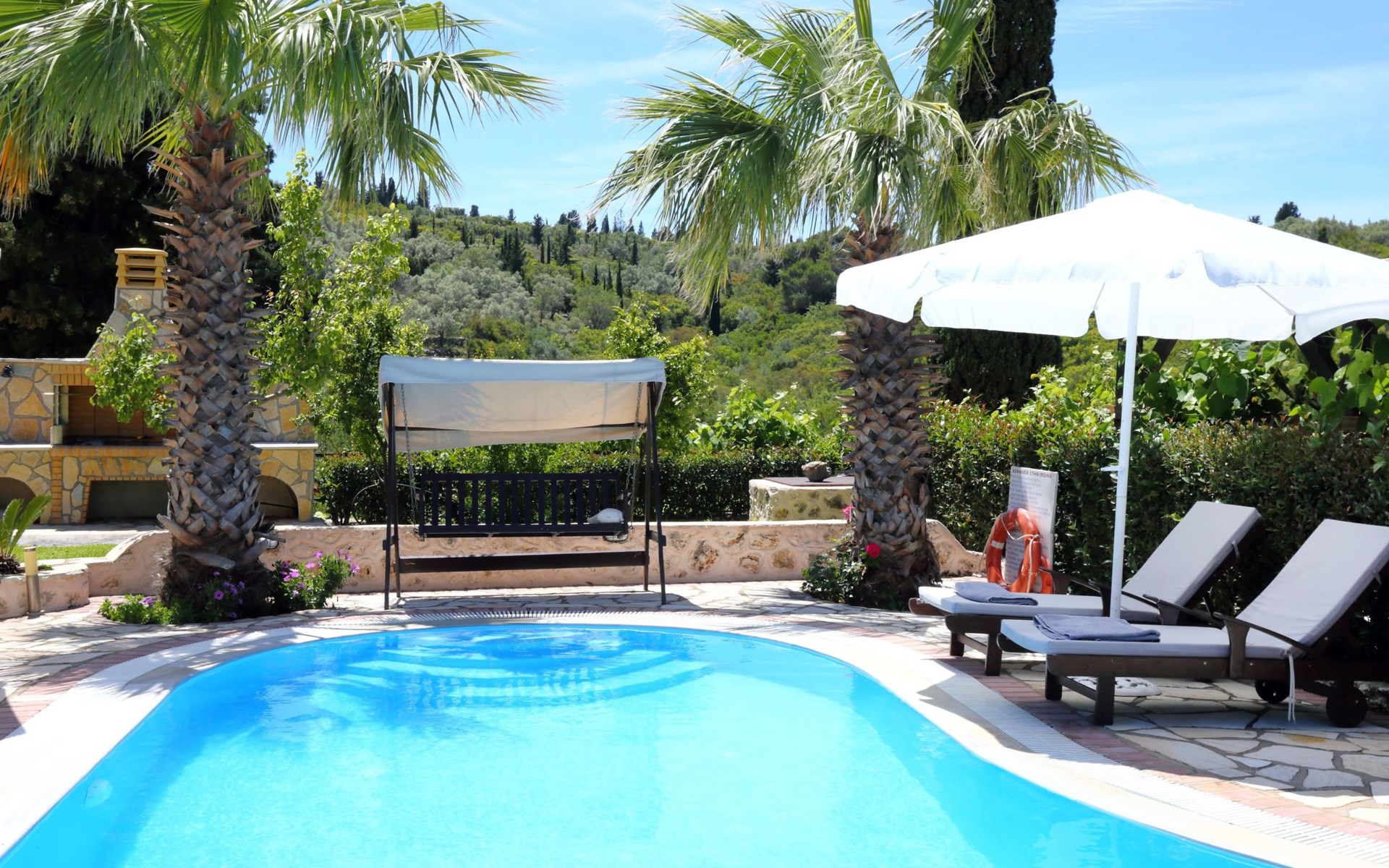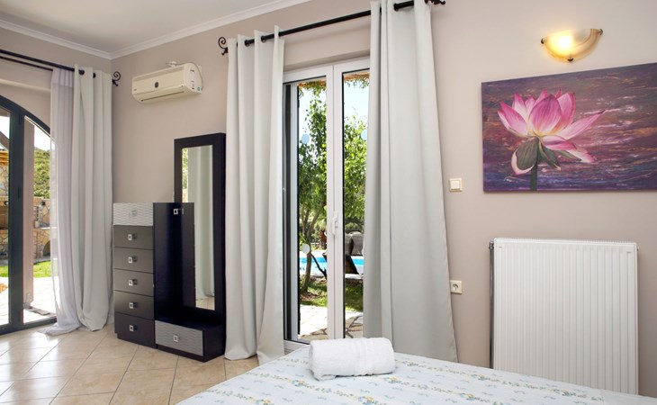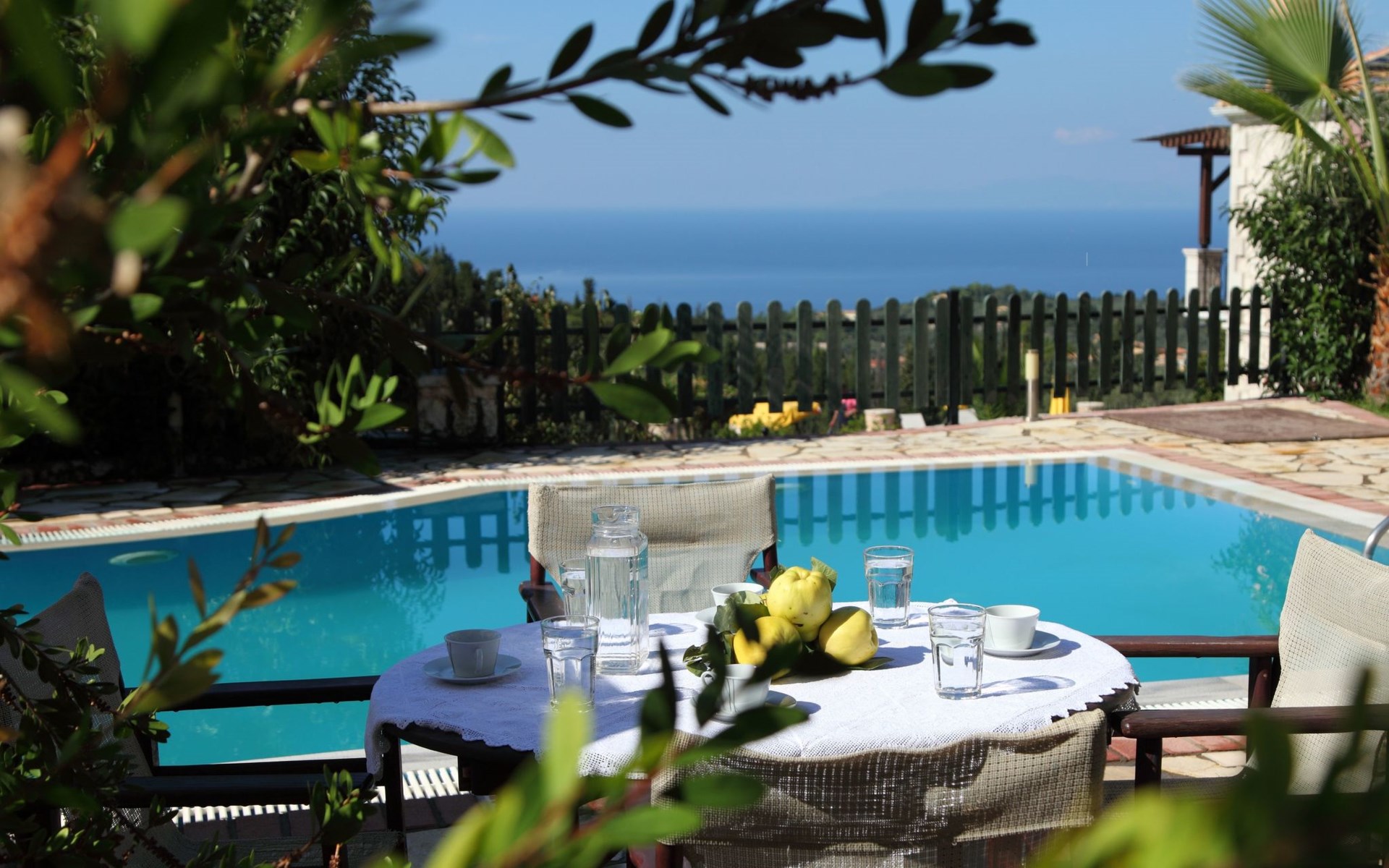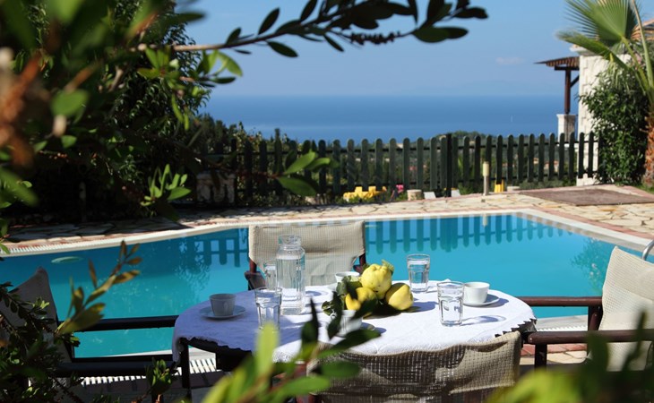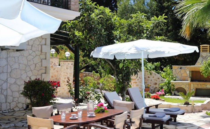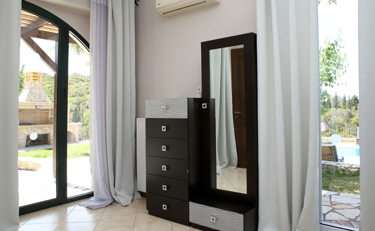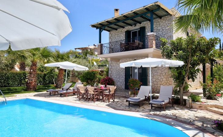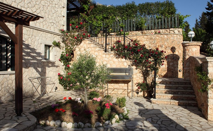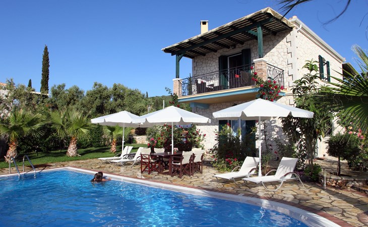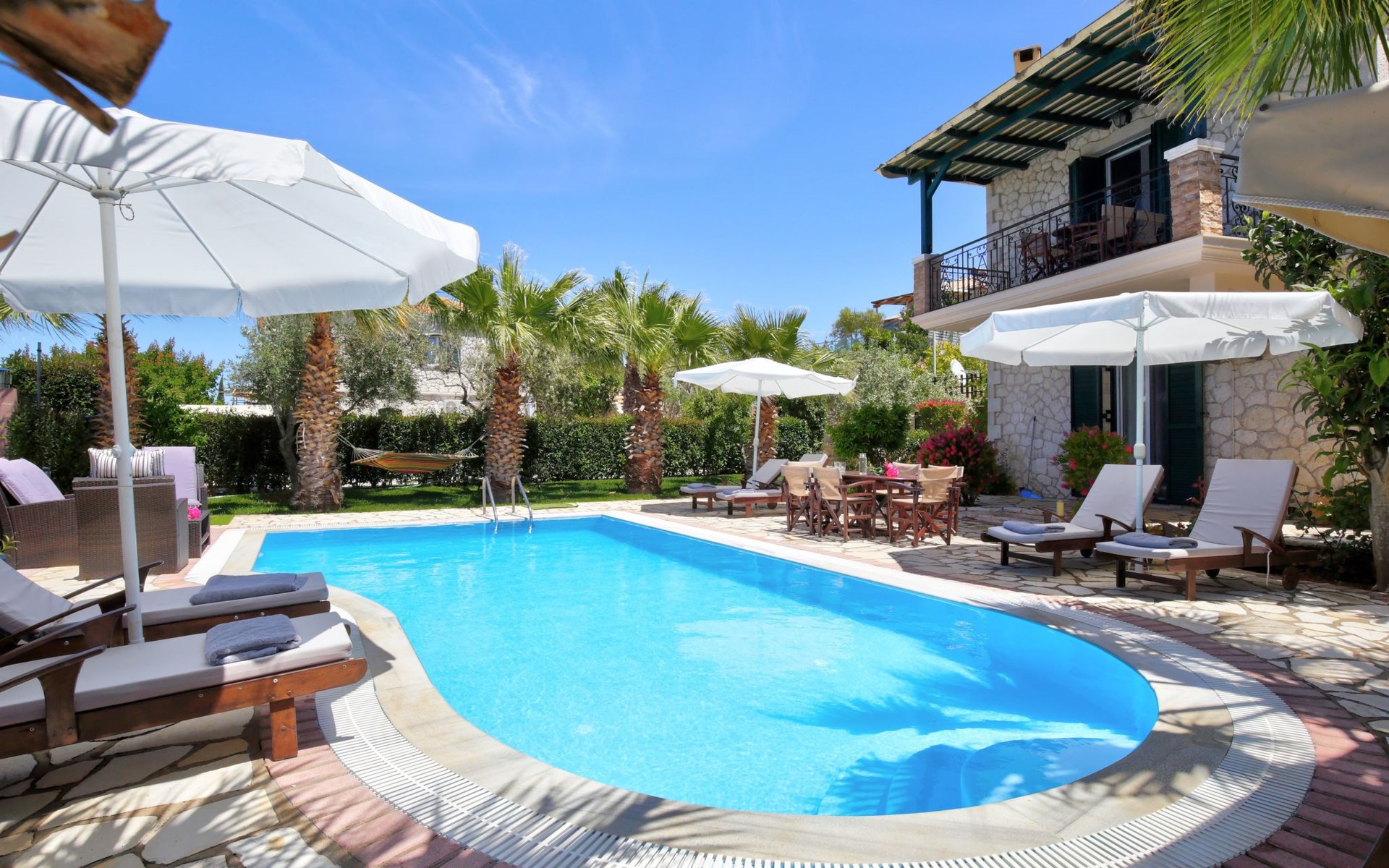 Villas Goudis are in complete harmony with the natural environment. They provide amazing view, the sunset in Ionian Sea. Each villa is independed and allocates swimming pool, green garden with flowers, bbq and parking. All villas are beautifully decorated and are separated in two floors.Lefkada is one of the most beautiful island of Greece and the only one with easy access. Picturesque villages, harbors, small islands, hidden beauty of the mountains and especially the famous beaches, make the best impression to its visitors. Apart from its natural beauty, is also featured with culture and tradition, with a series of events and activities taking place mainly in the summer months on the island. Tsoukalades is located on the west side of the island, in a lush green setting, overlooking the endless blue of the Ionian Sea, and a beautiful sunset! The village is located near the town of Lefkada and the famous beaches Pefkoulia, Agios Nikitas and Kathisma. It is named from the red clay available in the area which they used to make earlier pottery (tsoukalia). It is one of the most beautiful tourist resorts on the island with many amenities for its guests (taverns, cafeterias, mini markets etc.). "Goudis" villas, are located in the most beautiful part of Tsoukalades, in a lush green environment and with a spectacular view to the Ionian Sea. They are fully equipped, and cover every need of their guests, while there is ample parking, pool, barbecue and a beautiful gardenVilla Evelyn is a wonderful three-bedroom villa, ideal for up to 8 people. When you enter the villa from the first floor, you will walk into the spacious living room with as centerpiece the stone built fireplace. Next to the living room is the fully equipped open plan kitchen. From this floor, you have access to the large terrace to admire the view while relaxing at the outdoor seating area. There is a bathroom on this first floor with a shower for your convenience.Down the internal staircase, on the ground floor, are three bedrooms and a family bathroom with a Jacuzzi for you to enjoy. There are two bedrooms with double beds and one with two single beds. All bedrooms have direct access to the lovely pool area.The private outdoor area of Villa Evelyn offers a lush green garden with colorful flowers, trees with seasonal fruit, and a stone built BBQ. You will love the afternoons enjoying the magical sunsets while cooling down with the soft touch of the mountain breeze, making memories that will stay forever in your heart.The final touch is the blue water of the large swimming pool that becomes one with the horizon and the endless blue of the Ionian Sea.Villa Evelyn is an ideal choice for you and your family that promises a comfortable and unforgettable stay on Lefkada Island. 1307673