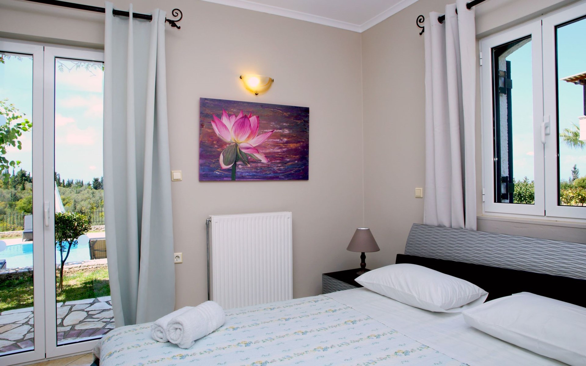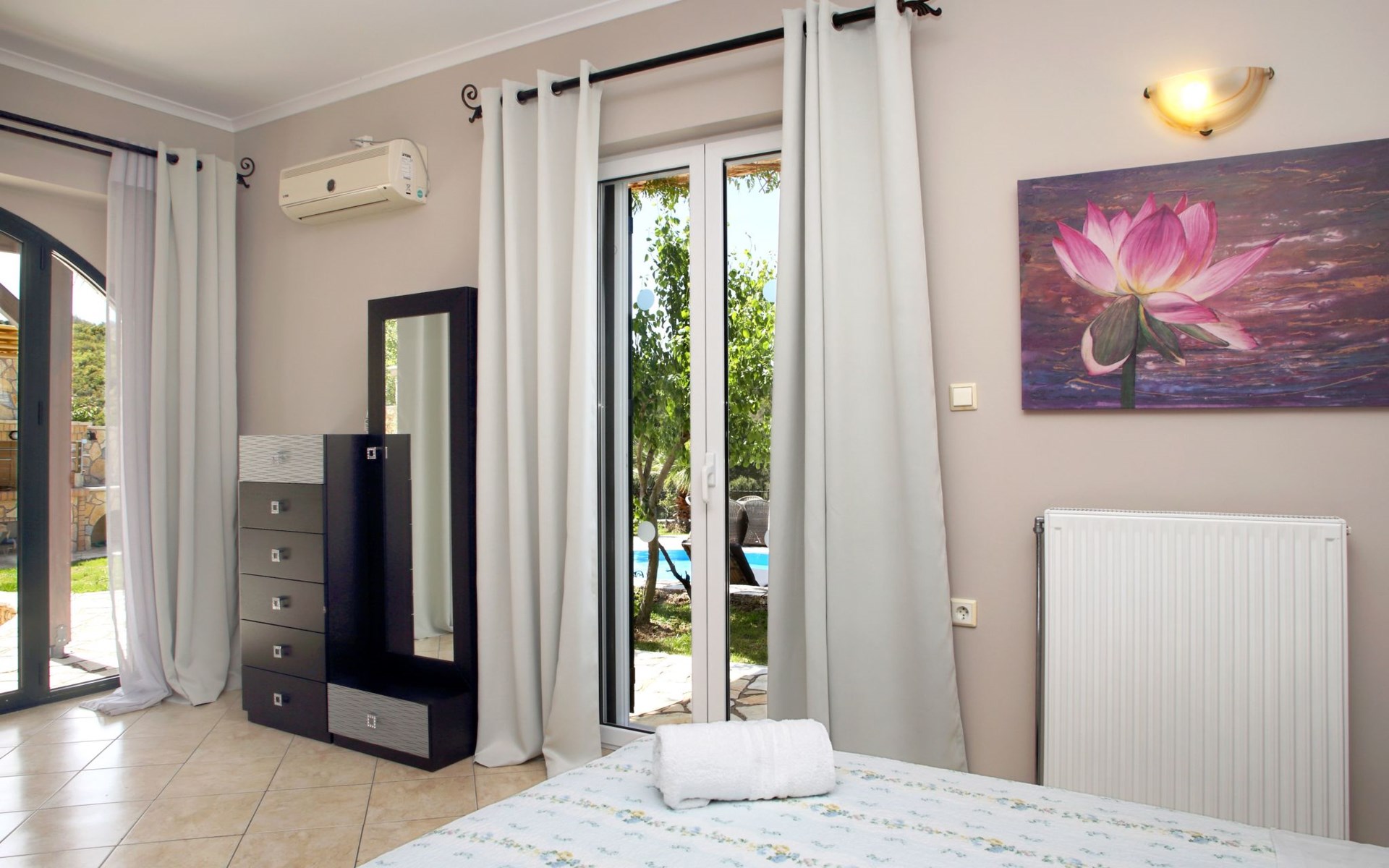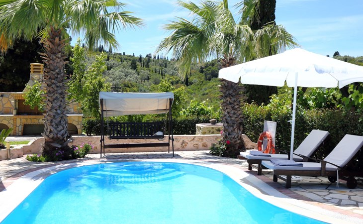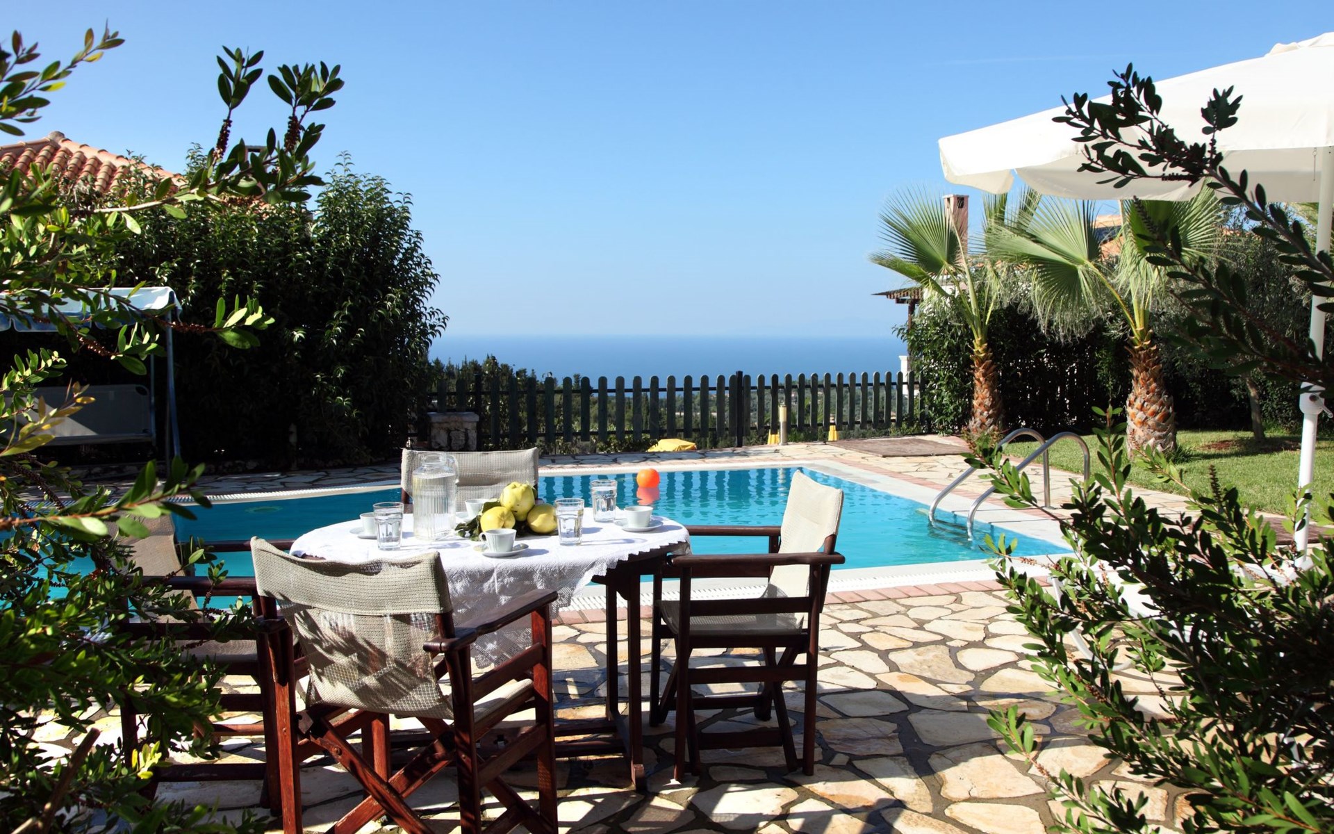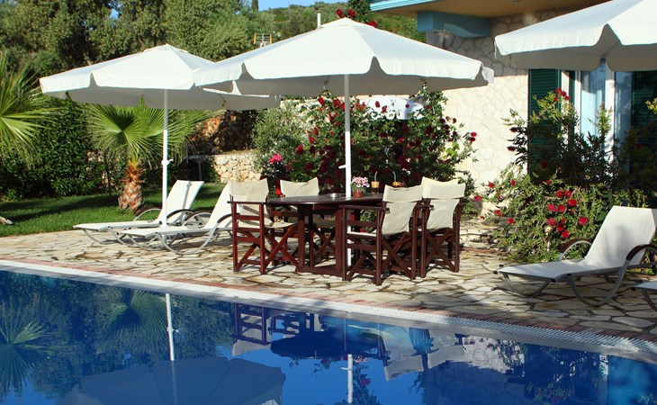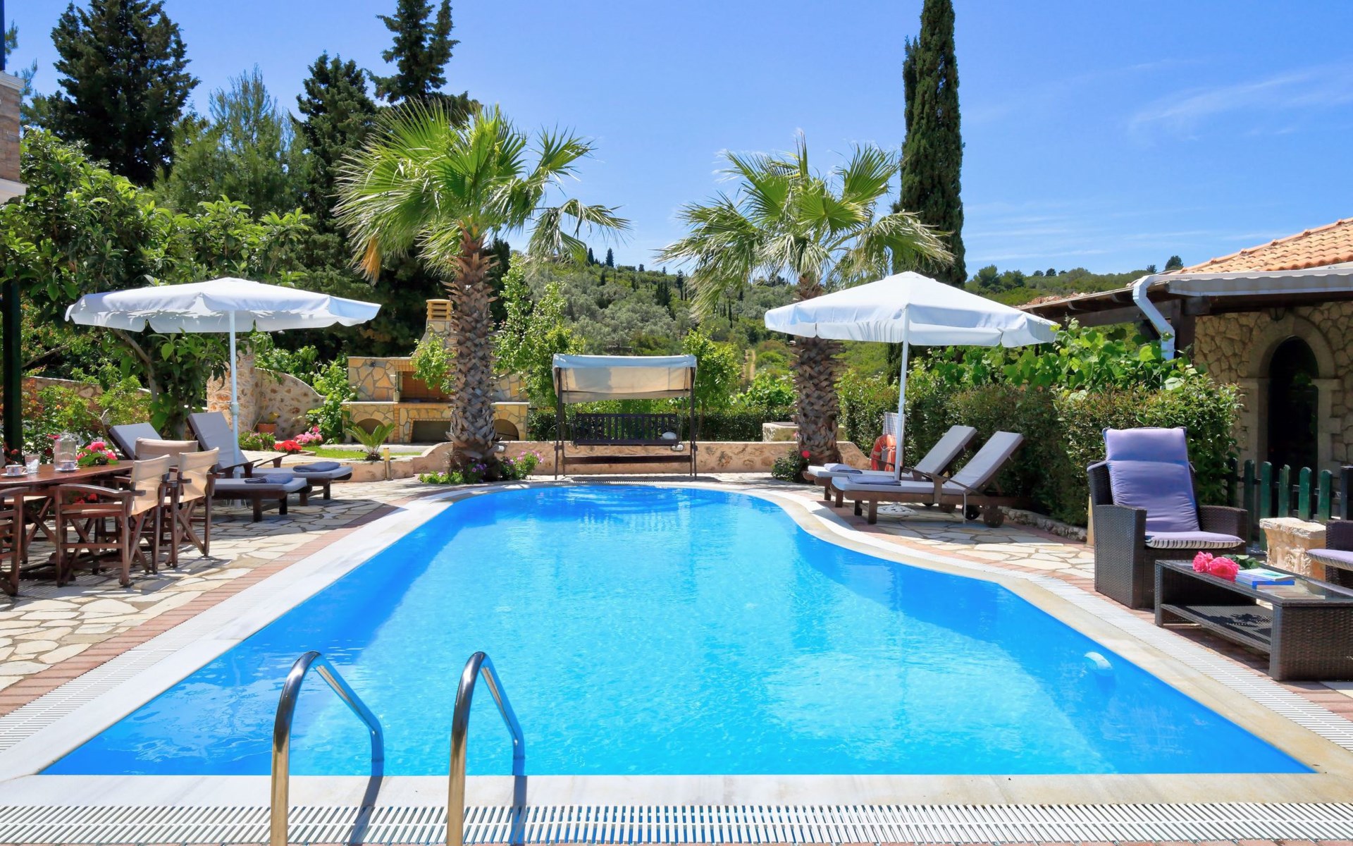 Villas Goudis are in complete harmony with the natural environment. They provide amazing view, the sunset in Ionian Sea. Each villa is independed and allocates swimming pool, green garden with flowers, bbq and parking. All villas are beautifully decorated and are separated in two floors.Lefkada is one of the most beautiful island of Greece and the only one with easy access. Picturesque villages, harbors, small islands, hidden beauty of the mountains and especially the famous beaches, make the best impression to its visitors. Apart from its natural beauty, is also featured with culture and tradition, with a series of events and activities taking place mainly in the summer months on the island. Tsoukalades is located on the west side of the island, in a lush green setting, overlooking the endless blue of the Ionian Sea, and a beautiful sunset! The village is located near the town of Lefkada and the famous beaches Pefkoulia, Agios Nikitas and Kathisma. It is named from the red clay available in the area which they used to make earlier pottery (tsoukalia). It is one of the most beautiful tourist resorts on the island with many amenities for its guests (taverns, cafeterias, mini markets etc.). "Goudis" villas, are located in the most beautiful part of Tsoukalades, in a lush green environment and with a spectacular view to the Ionian Sea. They are fully equipped, and cover every need of their guests, while there is ample parking, pool, barbecue and a beautiful gardenVilla Evelyn is a wonderful three-bedroom villa, ideal for up to 8 people. When you enter the villa from the first floor, you will walk into the spacious living room with as centerpiece the stone built fireplace. Next to the living room is the fully equipped open plan kitchen. From this floor, you have access to the large terrace to admire the view while relaxing at the outdoor seating area. There is a bathroom on this first floor with a shower for your convenience.Down the internal staircase, on the ground floor, are three bedrooms and a family bathroom with a Jacuzzi for you to enjoy. There are two bedrooms with double beds and one with two single beds. All bedrooms have direct access to the lovely pool area.The private outdoor area of Villa Evelyn offers a lush green garden with colorful flowers, trees with seasonal fruit, and a stone built BBQ. You will love the afternoons enjoying the magical sunsets while cooling down with the soft touch of the mountain breeze, making memories that will stay forever in your heart.The final touch is the blue water of the large swimming pool that becomes one with the horizon and the endless blue of the Ionian Sea.Villa Evelyn is an ideal choice for you and your family that promises a comfortable and unforgettable stay on Lefkada Island. 1307673