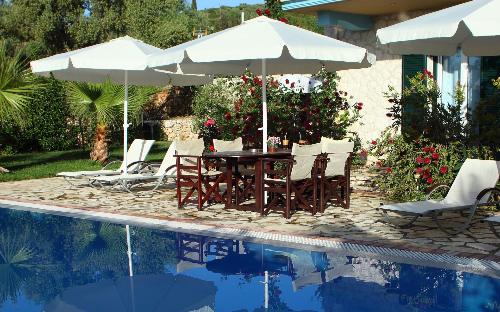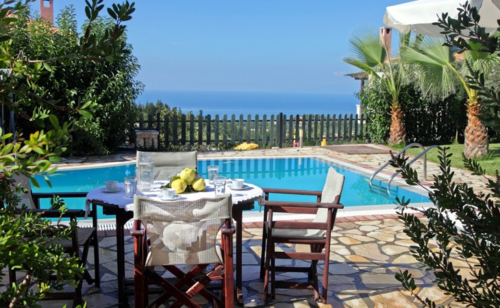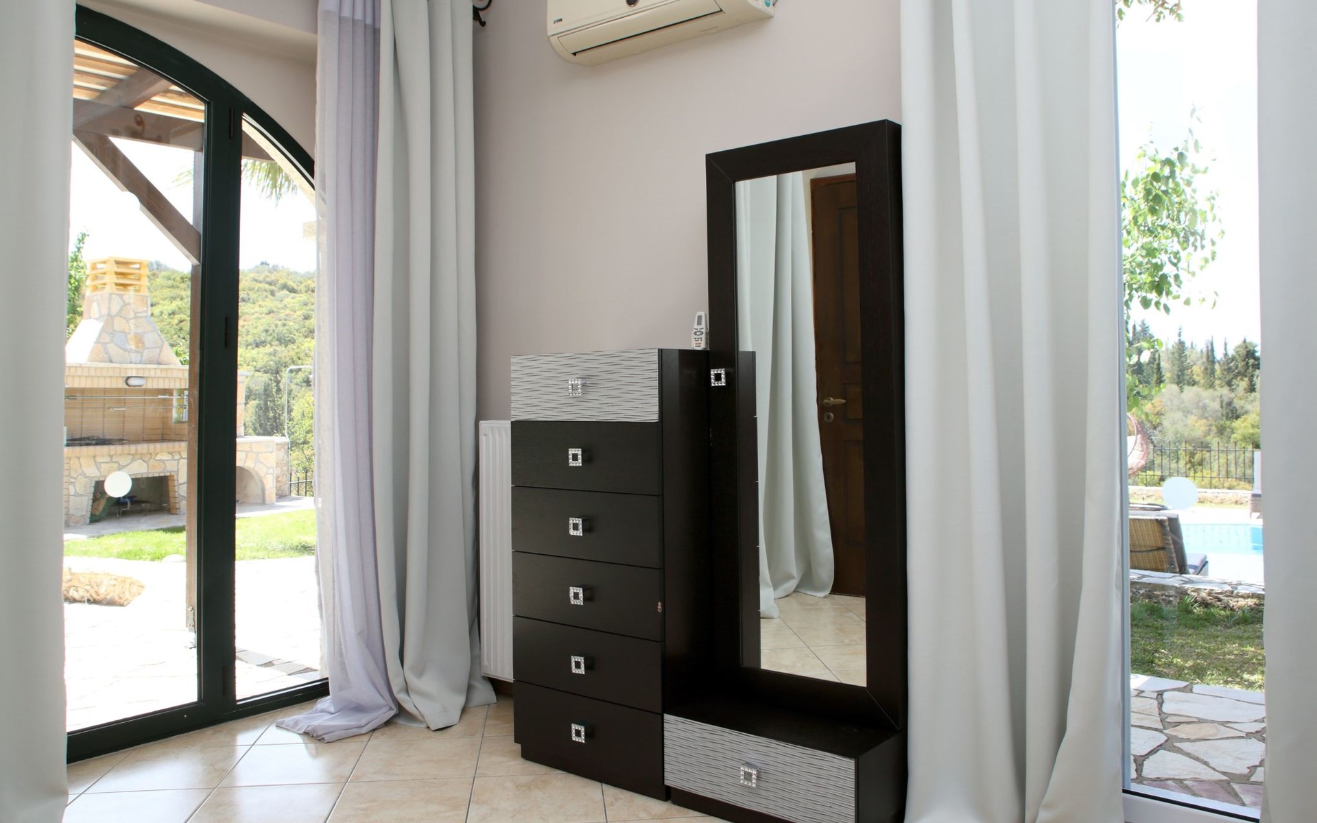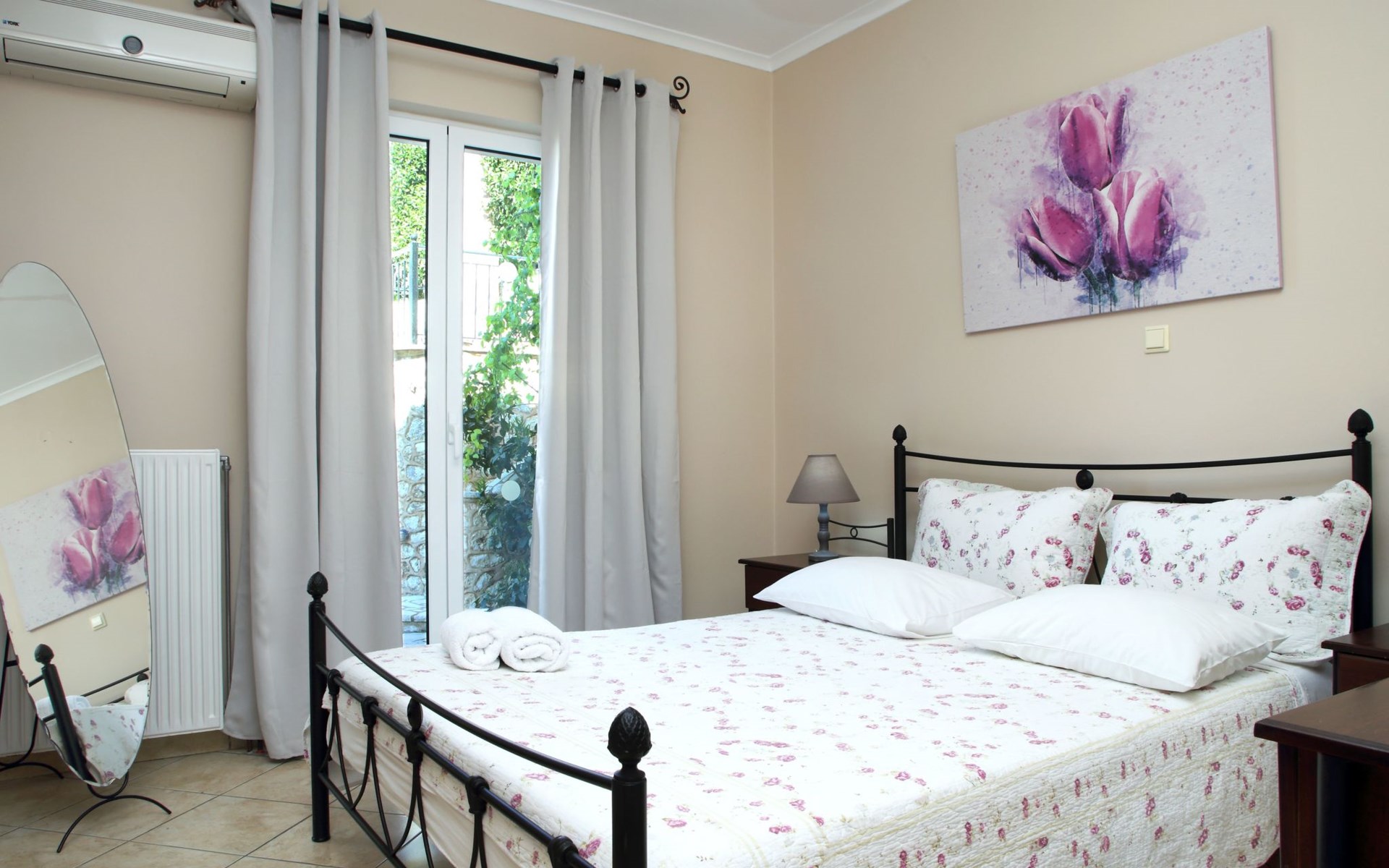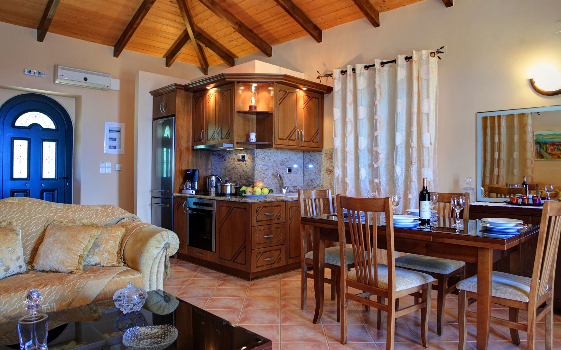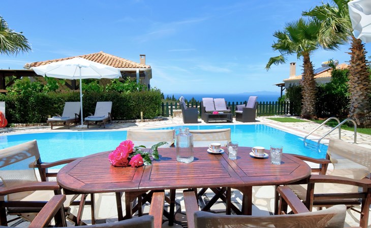 Villas Goudis are in complete harmony with the natural environment. They provide amazing view, the sunset in Ionian Sea. Each villa is independed and allocates swimming pool, green garden with flowers, bbq and parking. All villas are beautifully decorated and are separated in two floors.Lefkada is one of the most beautiful island of Greece and the only one with easy access. Picturesque villages, harbors, small islands, hidden beauty of the mountains and especially the famous beaches, make the best impression to its visitors. Apart from its natural beauty, is also featured with culture and tradition, with a series of events and activities taking place mainly in the summer months on the island. Tsoukalades is located on the west side of the island, in a lush green setting, overlooking the endless blue of the Ionian Sea, and a beautiful sunset! The village is located near the town of Lefkada and the famous beaches Pefkoulia, Agios Nikitas and Kathisma. It is named from the red clay available in the area which they used to make earlier pottery (tsoukalia). It is one of the most beautiful tourist resorts on the island with many amenities for its guests (taverns, cafeterias, mini markets etc.). "Goudis" villas, are located in the most beautiful part of Tsoukalades, in a lush green environment and with a spectacular view to the Ionian Sea. They are fully equipped, and cover every need of their guests, while there is ample parking, pool, barbecue and a beautiful gardenVilla Evelyn is a wonderful three-bedroom villa, ideal for up to 8 people. When you enter the villa from the first floor, you will walk into the spacious living room with as centerpiece the stone built fireplace. Next to the living room is the fully equipped open plan kitchen. From this floor, you have access to the large terrace to admire the view while relaxing at the outdoor seating area. There is a bathroom on this first floor with a shower for your convenience.Down the internal staircase, on the ground floor, are three bedrooms and a family bathroom with a Jacuzzi for you to enjoy. There are two bedrooms with double beds and one with two single beds. All bedrooms have direct access to the lovely pool area.The private outdoor area of Villa Evelyn offers a lush green garden with colorful flowers, trees with seasonal fruit, and a stone built BBQ. You will love the afternoons enjoying the magical sunsets while cooling down with the soft touch of the mountain breeze, making memories that will stay forever in your heart.The final touch is the blue water of the large swimming pool that becomes one with the horizon and the endless blue of the Ionian Sea.Villa Evelyn is an ideal choice for you and your family that promises a comfortable and unforgettable stay on Lefkada Island. 1307673