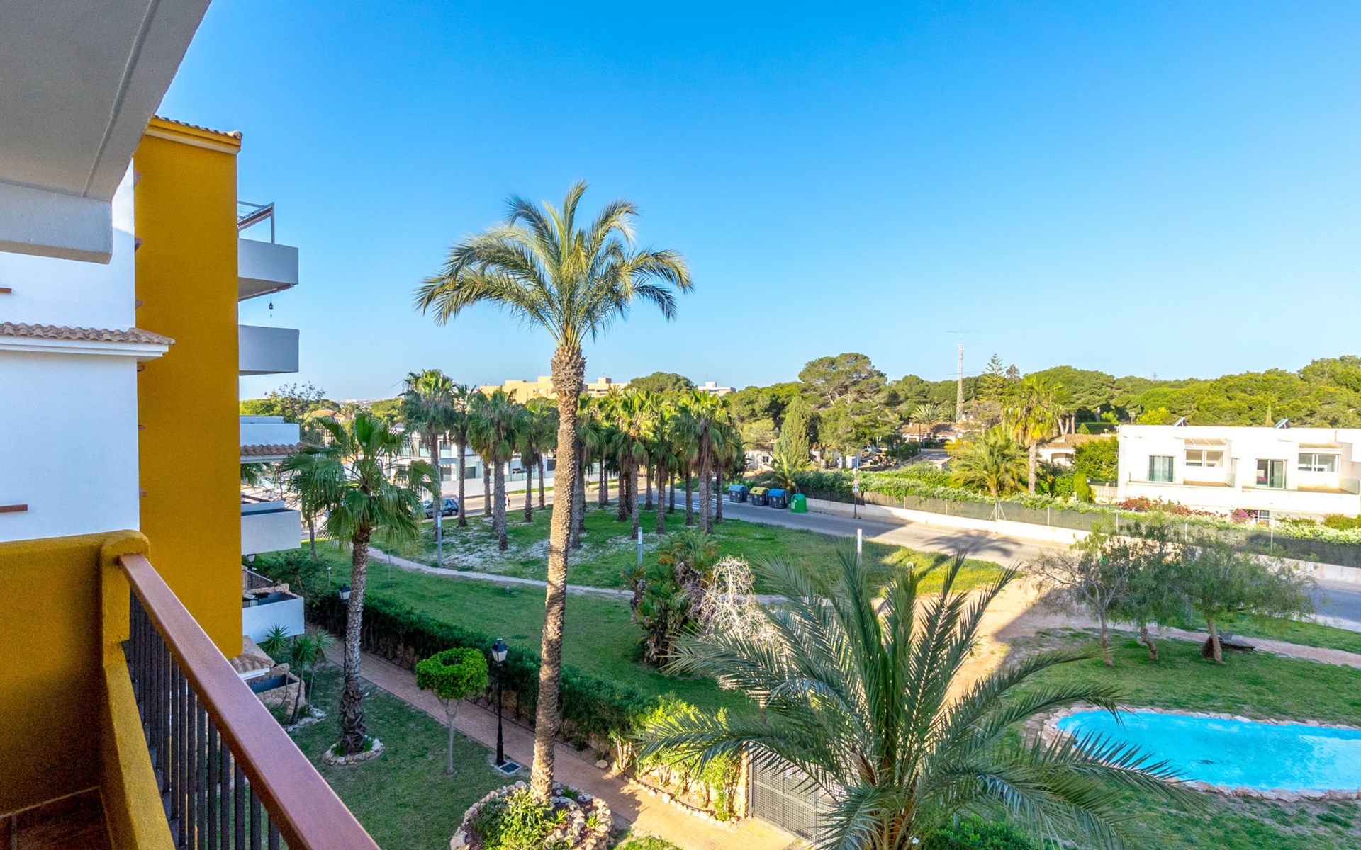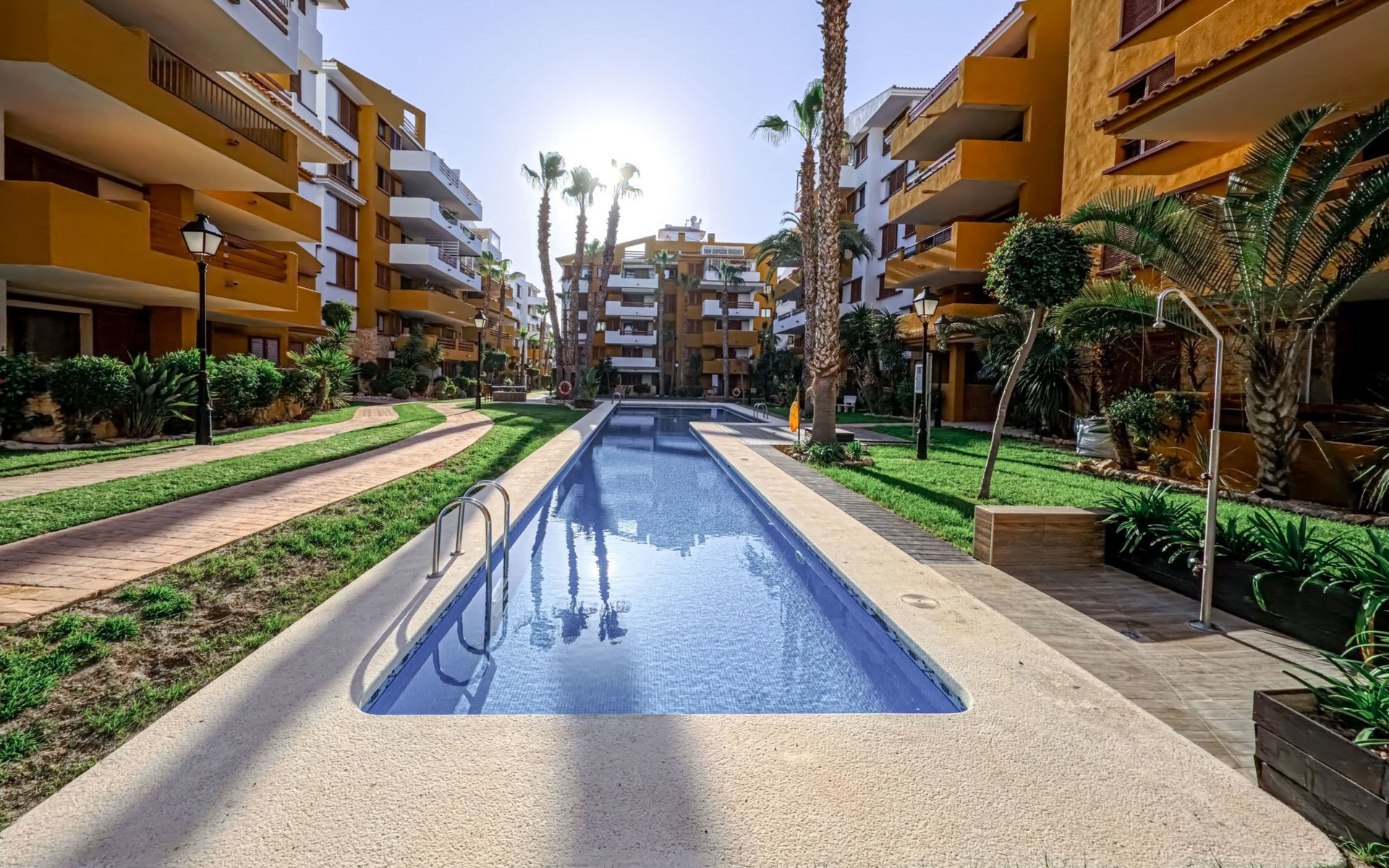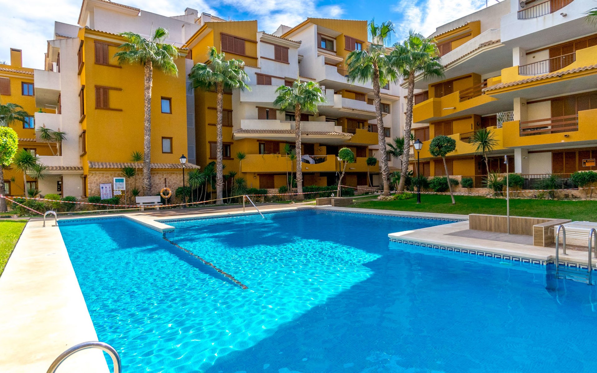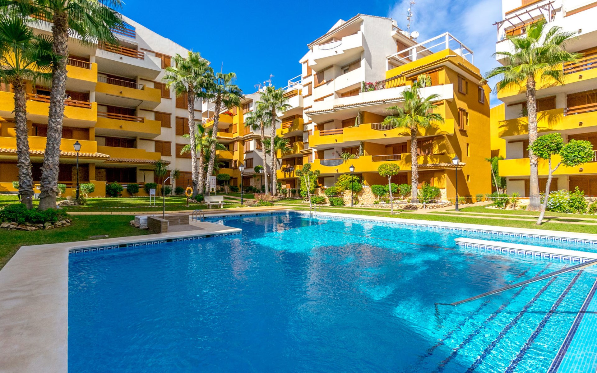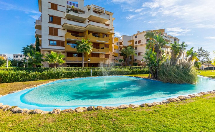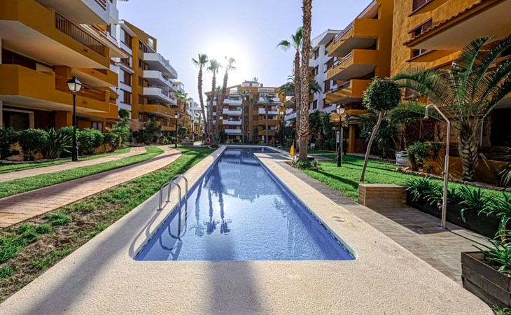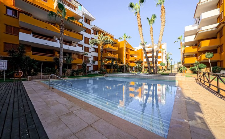 Punta Prima: Mooi flatgebouw "La Recoleta". 7 km van het centrum van Torrevieja, 3 km van het centrum van Orihuela Costa, 300 m van zee, 900 m van het strand. Voor medegebruik: terrein (omheind), mooie, verzorgde tuin bloemen en bomen, ligweide, 3 zwembaden (26 x 6 m, seizoensgebonden beschikbaarheid: 01.Jan. - 31.Dec.) met trap. Buitendouche. In het huis: lift. Levensmiddelenwinkel 1.8 km, supermarkt 1.8 km, winkelcentrum 1 km, restaurant 300 m, bushalte 600 m, zandstrand "Playa Punta Prima", baai 300 m. Jachthaven 5 km, jachthaven 5 km, golfterrein 7 km. De eigenaar accepteert geen jeugdgroepen.