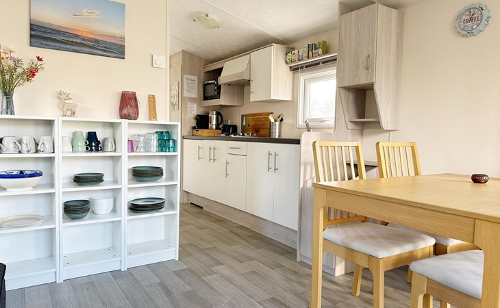 Binnen verwelkomt een gezellige woonkamer u met een comfortabele slaapbank en een eettafel voor vijf personen. De volledig uitgeruste keuken biedt alle gemakken die u nodig heeft voor een zorgeloos verblijf. Voor extra comfort beschikt het chalet over gratis WiFi, centrale verwarming en een smart-tv.