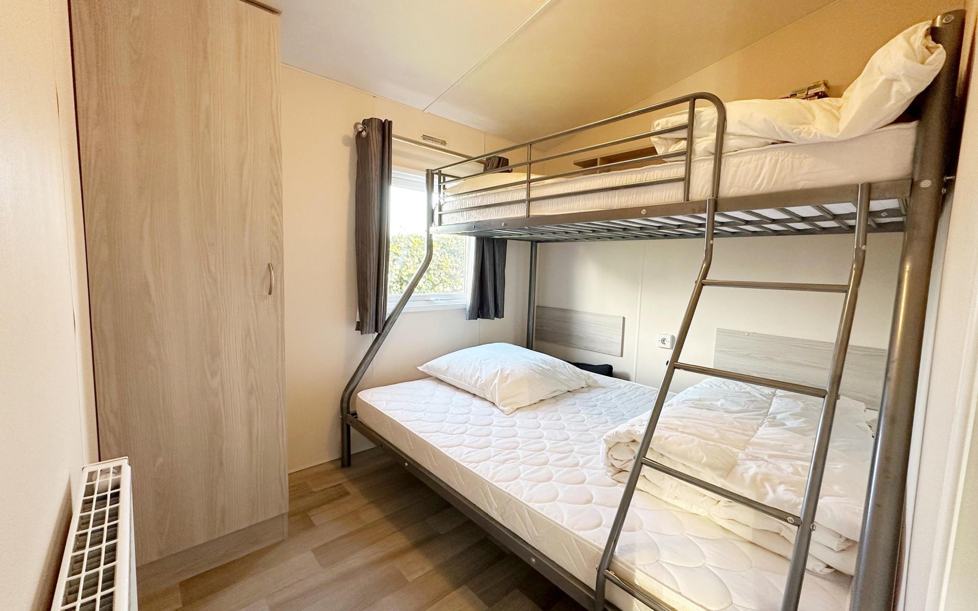 In de hoofdslaapkamer staat een tweepersoonsbed (180x200). In de tweede slaapkamerstaat een stapelbed: boven 90x200 en onder 140x200). In de woonkamer kan de 5e gast slapen op een slaapbank met twee bedden (2x 90x200cm).