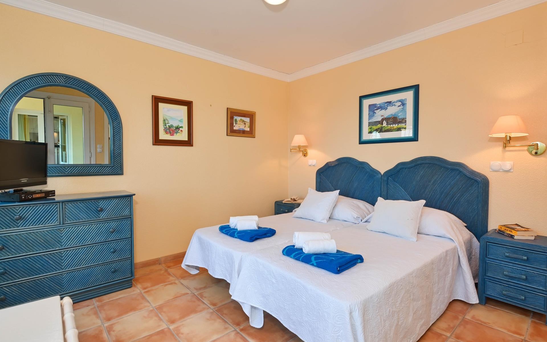 - slaapkamer met 2 eenpersoonsbedden (met een afmeting van 190 bij 90 cm), televisie en en-suite badkamer