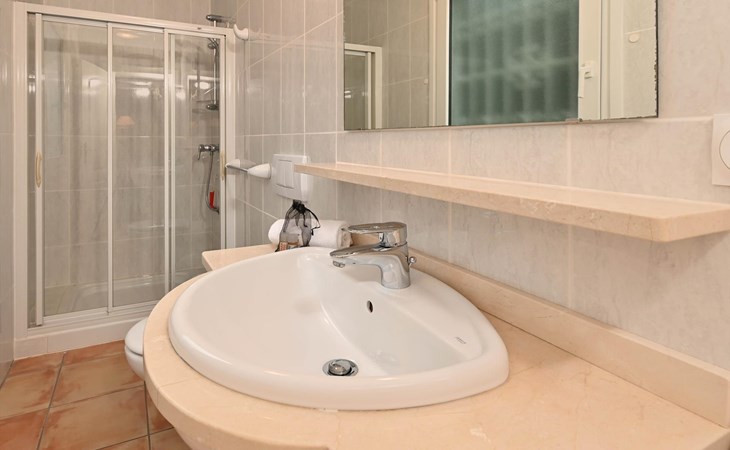- badkamer met enkele wastafel, douche, en bidet
