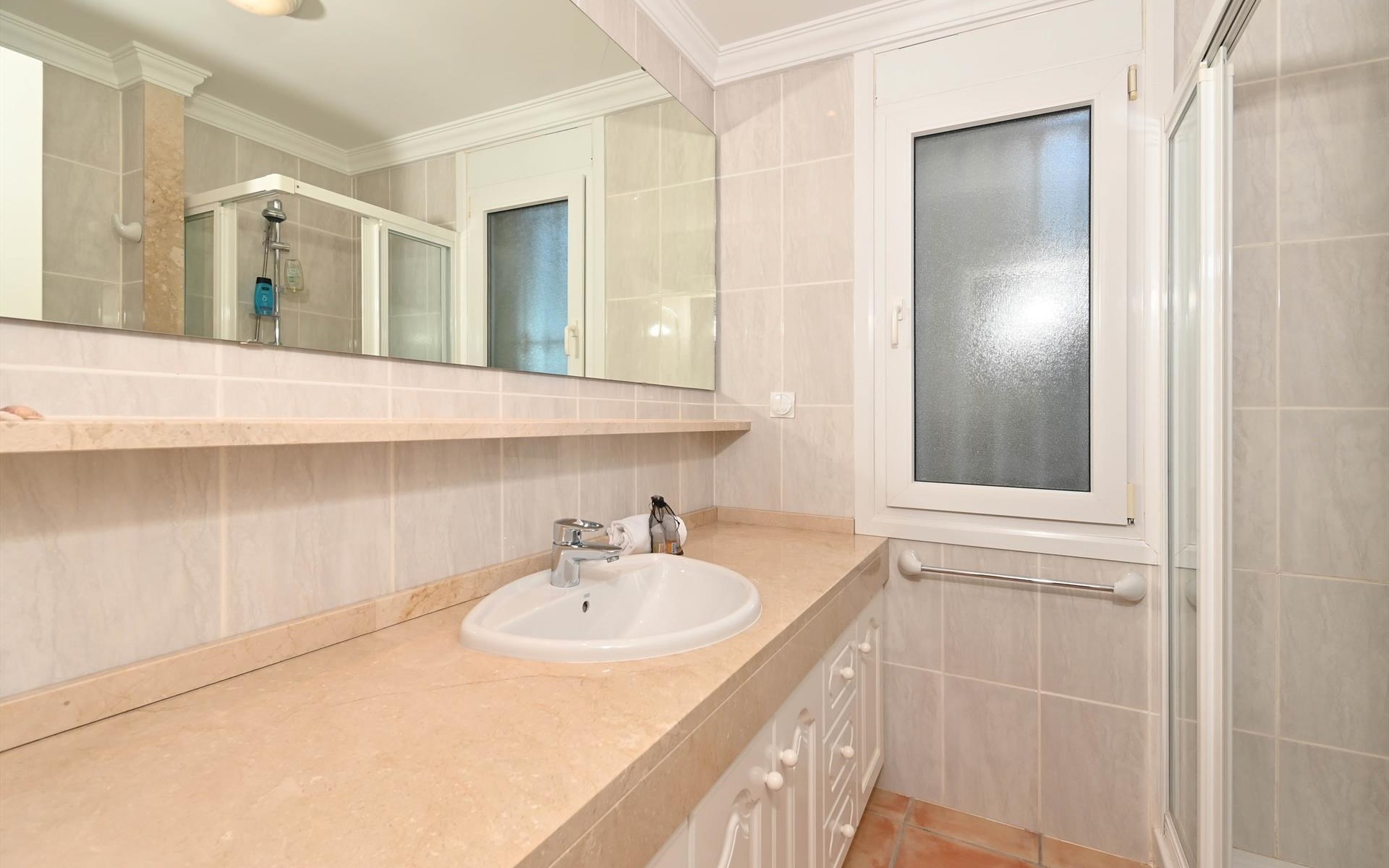 - badkamer met enkele wastafel, douche, en toilet