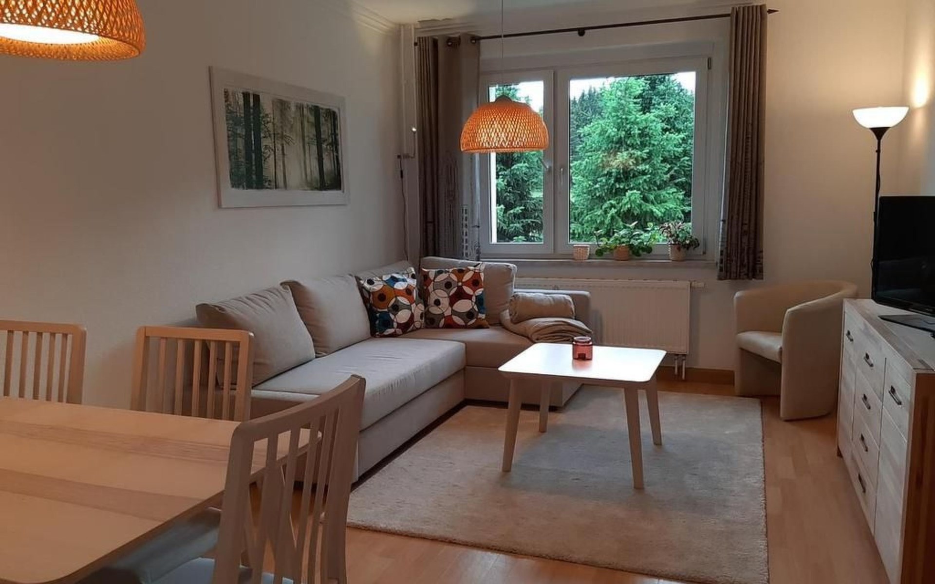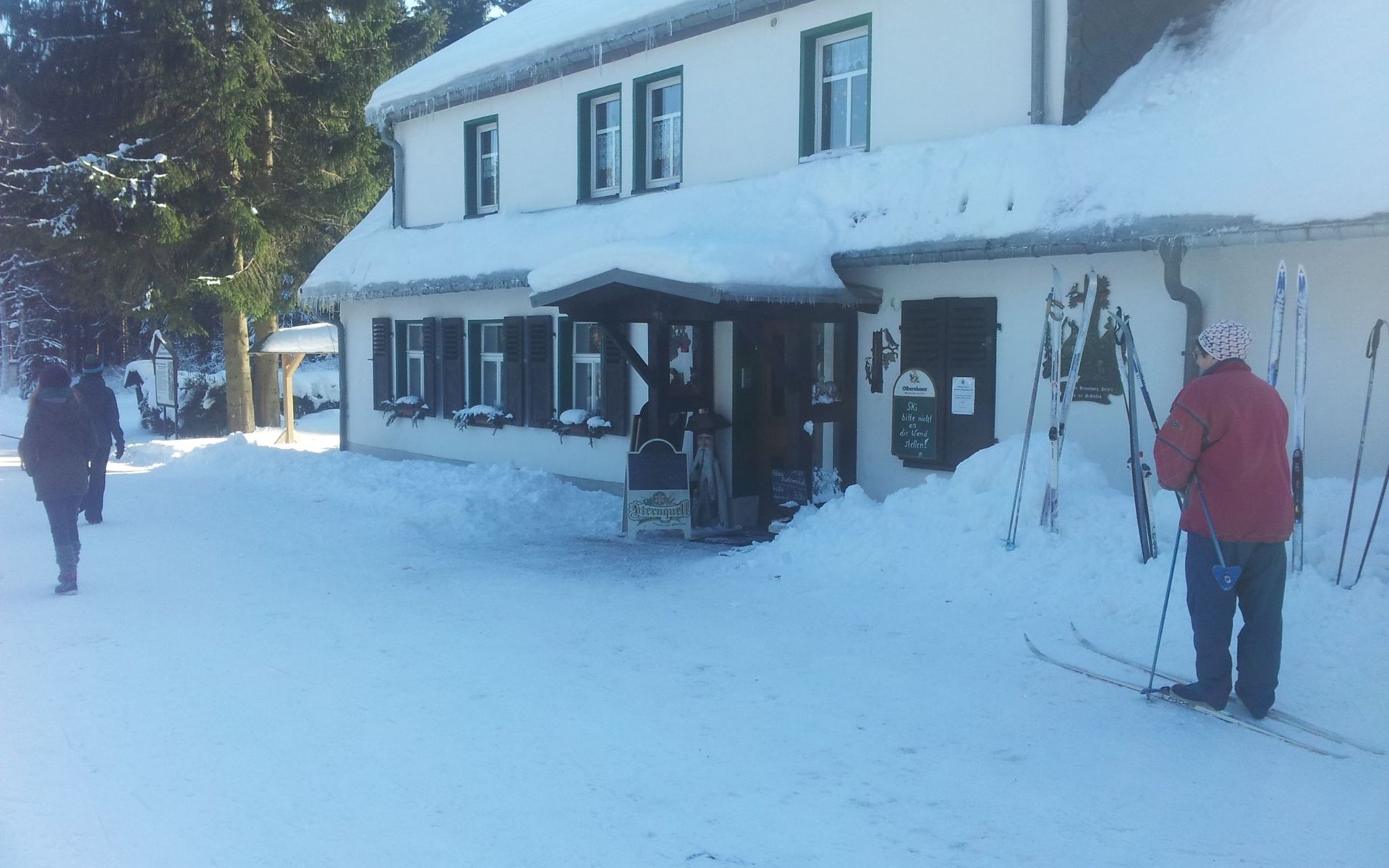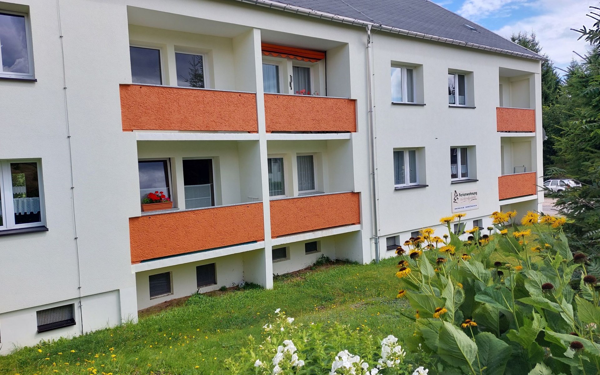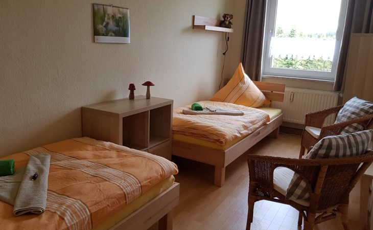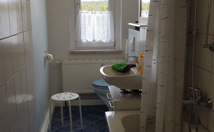You live in a very quietly located, bright and 2020 modernised 3-room flat with balcony, bathroom (WC) and kitchen on 60 m². The location is surrounded by extensive forests and is known for its clear, clean air. Ideal for 2 to 4 people. Non-smoking apartment (smoking permitted on the balcony), "snow-safe", directly on the Kammweg/Kammloipe. The apartment is located above Carlsfeld in a very quiet location (dead end), in a large forest clearing, distance to the Vogtland 12 km, Johanngeorgenstadt and Eibenstock also 12 km each. Only 3 km from the Czech/Bohemian border and the upland moors there.Sitting area for 12 people with barbecue fireplace, charcoal grill, two children's bicycles for children up to 12 years (on their own responsibility), children's toys and board games. Dogs are not allowed.Living room: sofa corner, dining table with 5 chairs, SAT-TV, DVD. Bedroom 1: 1 double bed, wardrobe, mirror, chest of drawers. Bedroom 2: 2 single beds, small table, 2 chairs, shelf, children's toys, MP3-CD cassette radio. Kitchen: various kitchen cupboards, fridge-freezer, long worktop, small dining area, cooker (4 hotplates), toaster, coffee machine, kettle, mixer, various kitchen accessories. Bathroom: bathtub with shower holder and curtain, washbasin, toiletBalcony: table with 2 patio chairsToddler equipment with chairs, cot and bathtubBicycle and ski storage roomNature and hiking/bicycle tours: Nature and landscape conservation areas in the immediate vicinity, clean springs and streams, berries and mushrooms, extensive, well-signposted network of hiking and cycling trails. The landlord is happy to provide information on hiking, cycling or skiing tours. Winter sports: family-friendly ski and toboggan slope in Carlsfeld ("Ski-Fun-Park"), others in Wildenthal, Eibenstock, Johanngeorgenstadt and Oberwiesenthal / extensive, groomed cross-country ski trail network (Auersberg area) and the longest groomed ridge trail in Germany Schöneck - Mühlleiten - Carlsfeld - Johanngeorgenstadt / ski, snowboard and toboggan hire centres in all towns / natural ice stadium in Johanngeorgenstadt Museums, swimming pools and more: Badegärten Eibenstock (please book for sauna rituals or massages), Bergbühne Eibenstock, all-weather bobsleigh run, embroidery show workshop in Eibenstock (10 km), Pferdegöpel and Glöck'l show mine in Johanngeorgenstadt (11 km), charcoal burning at Sosa dam (18 km), Space exhibition in Morgenröthe-Rautenkranz (13 km), outdoor swimming pool and liqueur factory in Bockau (19 km) You will receive a car park reserved for you personally at the house, which is cleared of snow on your arrival in winter. We can provide you with a second car park free of charge on request. This gives you the opportunity to start your tour directly from the apartment on foot or on skis. There is a large seating area at the rear of the building.