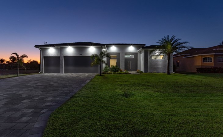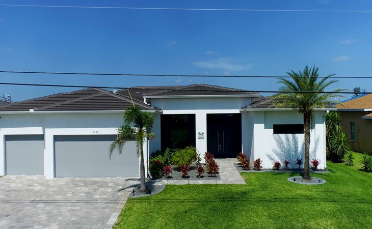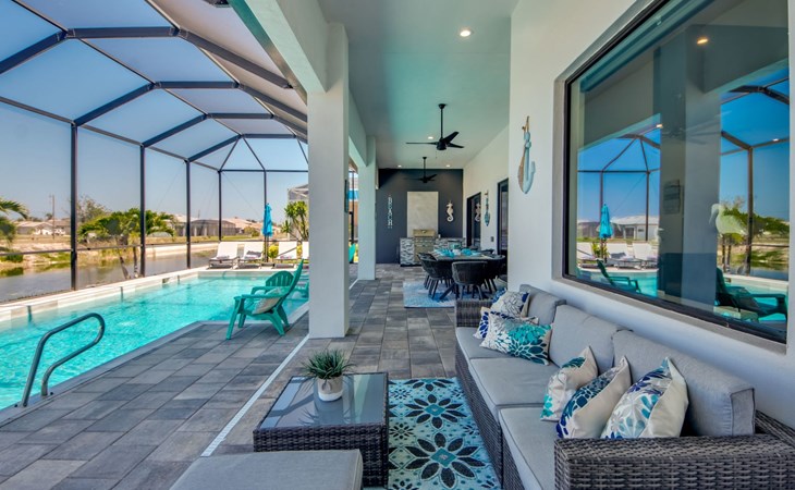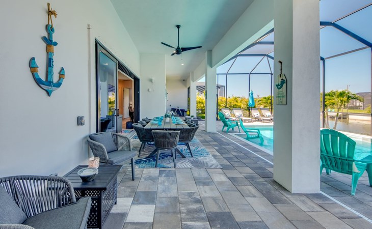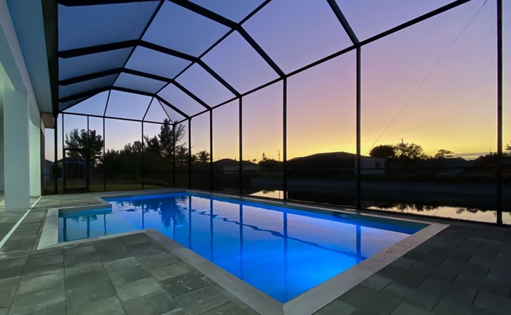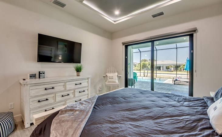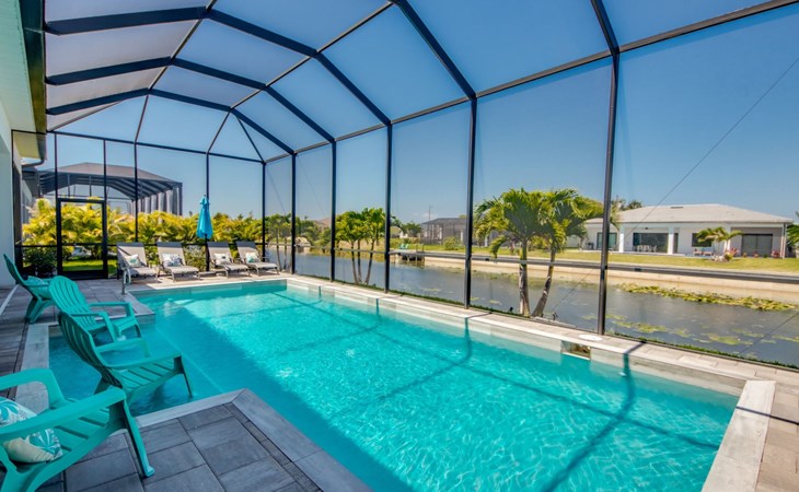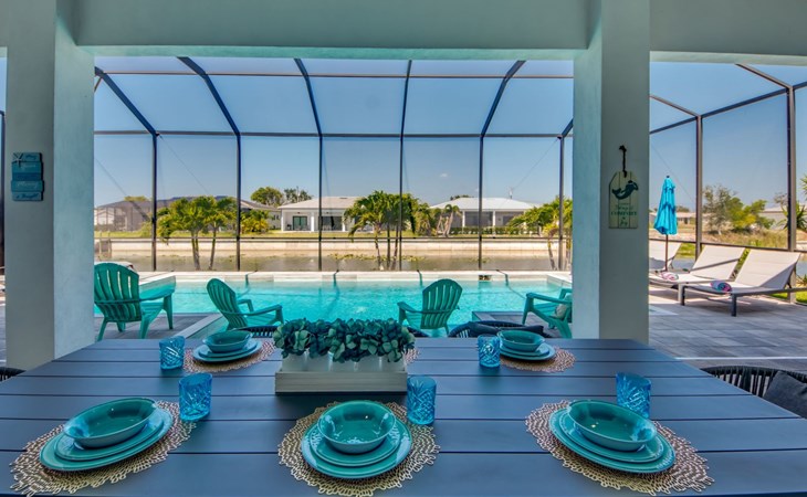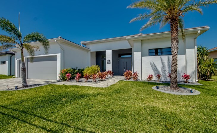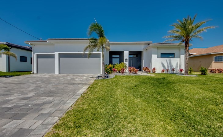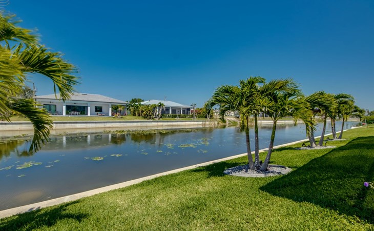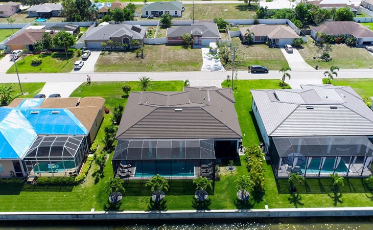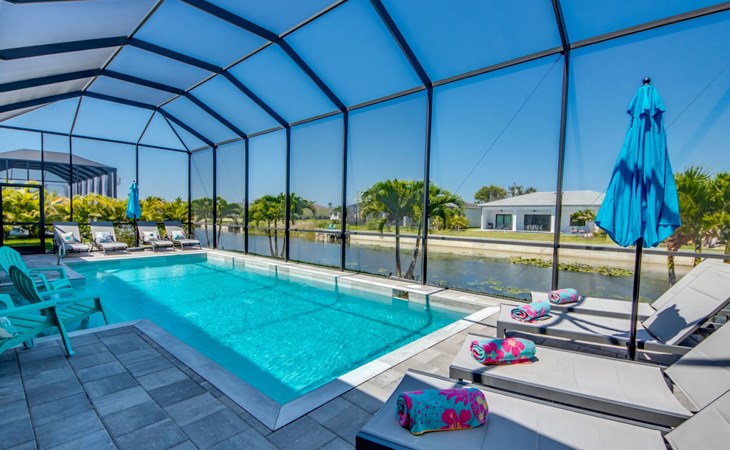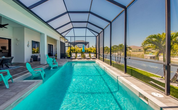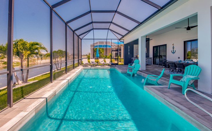 The Villa Maui with heated private pool in the holiday resort of Cape Coral on the west coast of Florida invites you to enjoy a holiday with state-of-the-art facilities and pure luxury in an excellent location with many excursion and shopping opportunities nearby.the Villa Maui was only built in 2019 in a modern style. It is located in a quiet area directly on a south-west facing canal, where you can enjoy the sunset with a view over the canal and experience a wonderful holiday on the Gulf Coast of Florida. Experience the best comfort for your relaxing holiday.Villa Maui is on one level and is approx. 204m² in size.The large, open-plan living room is located in the centre of the house with the open-plan kitchen and spacious dining area. The high ceilings and large windows give the rooms a spacious and bright feel. An oversized fan hangs from the ceiling in the living room.In the living room you will find a large lounge area and a large Smart TV as well as a fireplace.In the open, fully equipped kitchen you will find, among other things:- microwave- oven- French door fridge with freezer compartment and ice cube maker- Food processor- Egg cooker- Nespresso Vertuo coffee machine- Keurig coffee machine- Filter coffee machine- Milk frother- Pots, pans, crockery, cutlery, glasses etc.- Dishwasher- Kettle- Children's crockery and cutleryThe dining area easily seats up to 7-8 people.The windows in the living room and dining area can be blacked out. This ensures privacy, sun protection and privacy at all times.The so-called MASTER AREA is located in the right-hand area.In the master bedroom you have a king-size bed, smart TV, fan, direct pool access and access to the master bathroom. The doors in the master bedroom have electric darkening and an alarm that can be activated if necessary (children).In the master bathroom with natural light, you can shower comfortably in the walk-in rain shower and take a cosy bath in the free-standing bathtub. 2 washbasins, drawers, make-up mirror, hairdryer, towels, bath towels and a separate toilet complete the offer.There are 2 guest rooms and the guest bathroom on the left-hand side of the house.Guest room 1:- large double bed- Access to the pool area- Electric darkening of the doors- Alarm on the doors if required- Smart TV- built-in wardrobe- fanGuest room 2:- large double bed- window- fan- Smart TV- built-in wardrobeGuest bathroom:- Toilet- Walk-in shower with rain shower- Hand towels- Bath towels- Washbasin- Storage facilities- Hairdryer- make-up mirrorOffice/ 3rd guest room- Pull-out sofa- Writing desk- chair- Fan- Blackout blinds on the windowsOf course, we also have something for our younger guests:- free baby cot- baby monitor- high chair- children's cutleryThe Loundry contains the following:- Washing machine- tumble dryer- Ironing board and iron- Hoover- Shopping baskets and bagsThe house has central air conditioning.The pool area is easily accessible from the living room. Experience a breathtaking view over the wide freshwater canal. The plot has beautiful palm trees and we have planted a palm hedge to the neighbouring properties.The heated pool is over 9 metres long and invites you to splash around and relax. The pool area is completely enclosed by a screen. This keeps the mosquitoes away.There are plenty of new sun loungers, cushions and parasols around the pool. A weekly pool service ensures good water quality.A new outdoor kitchen with barbecue, fridge and shelves makes for great barbecue evenings by the pool. Enjoy marvellous sunsets with a view over the canal. Sun worshippers will get their money's worth thanks to the good south-west orientation.There is also a lounge area. A large dining area for up to 10 people and ceiling fans on the terrace round off the offer.New: we have had hurricane shutters installed on the terrace. The shutters not only protect against the storm, but our guests can also adjust them electrically to protect them from the sun, rain and wind on the terrace. Enjoy your holiday to the full.New: TV on the terrace, watch TV in the pool!Bath towels, towels and bed linen are included in the price. Beach chairs and umbrellas for your beach visit can be used free of charge.You can park your car safely in the garage.Please note that security cameras are installed in front of the house at the garage and entrance for your safety. It is not permitted to tamper with the electrics, Wi-Fi router or TV sets!-You can easily access the pool area from the living room. Experience a breathtaking view over the wide fresh water channel. The plot has beautiful palm trees and we have planted a palm hedge to the neighbouring properties.The heated pool is over 9 metres long and invites you to splash around and relax. The pool area is completely enclosed by a screen. This keeps the mosquitoes away.There are plenty of new sun loungers, cushions and parasols around the pool. A weekly pool service ensures good water quality.A new outdoor kitchen with barbecue, fridge and shelves makes for great barbecue evenings by the pool. Enjoy marvellous sunsets with a view over the canal. Sun worshippers will get their money's worth thanks to the good south-west orientation.There is also a lounge area. A large dining area for up to 10 people and ceiling fans on the terrace round off the offer.New: we have had hurricane shutters installed on the terrace. The shutters not only protect against the storm, but our guests can also adjust them electrically to protect them from the sun, rain and wind on the terrace. Enjoy your holiday to the full.Bath towels, towels and bed linen are included in the price. Beach chairs and umbrellas for your beach visit can be used free of charge.The screen protects you from mosquitoes on the terrace.Sunshades, sunbeds and bath towels are available for free use in the house.Various toys and air mattresses may be available on site and a lounge area has been integrated.The front garden was also embellished in October 2021 with new plants an