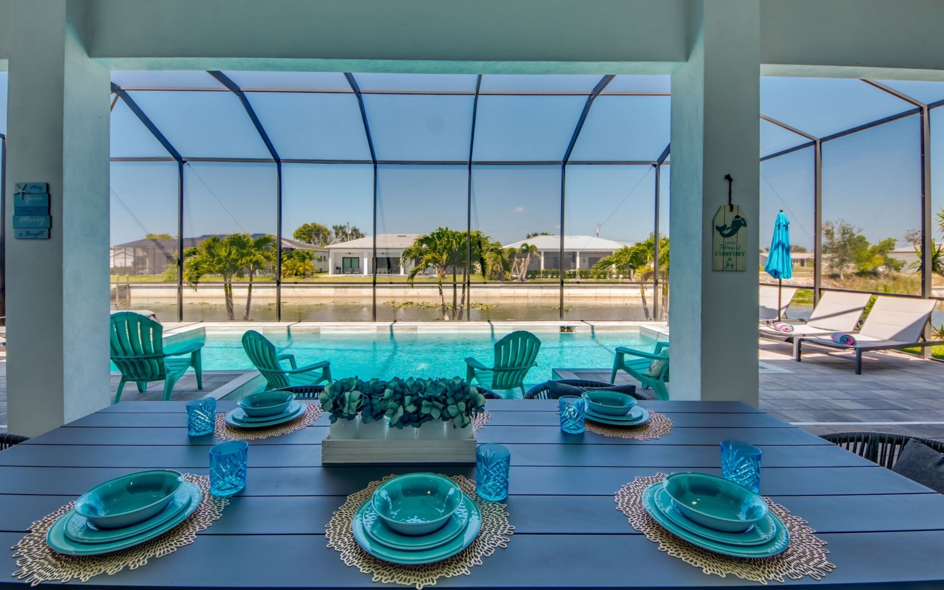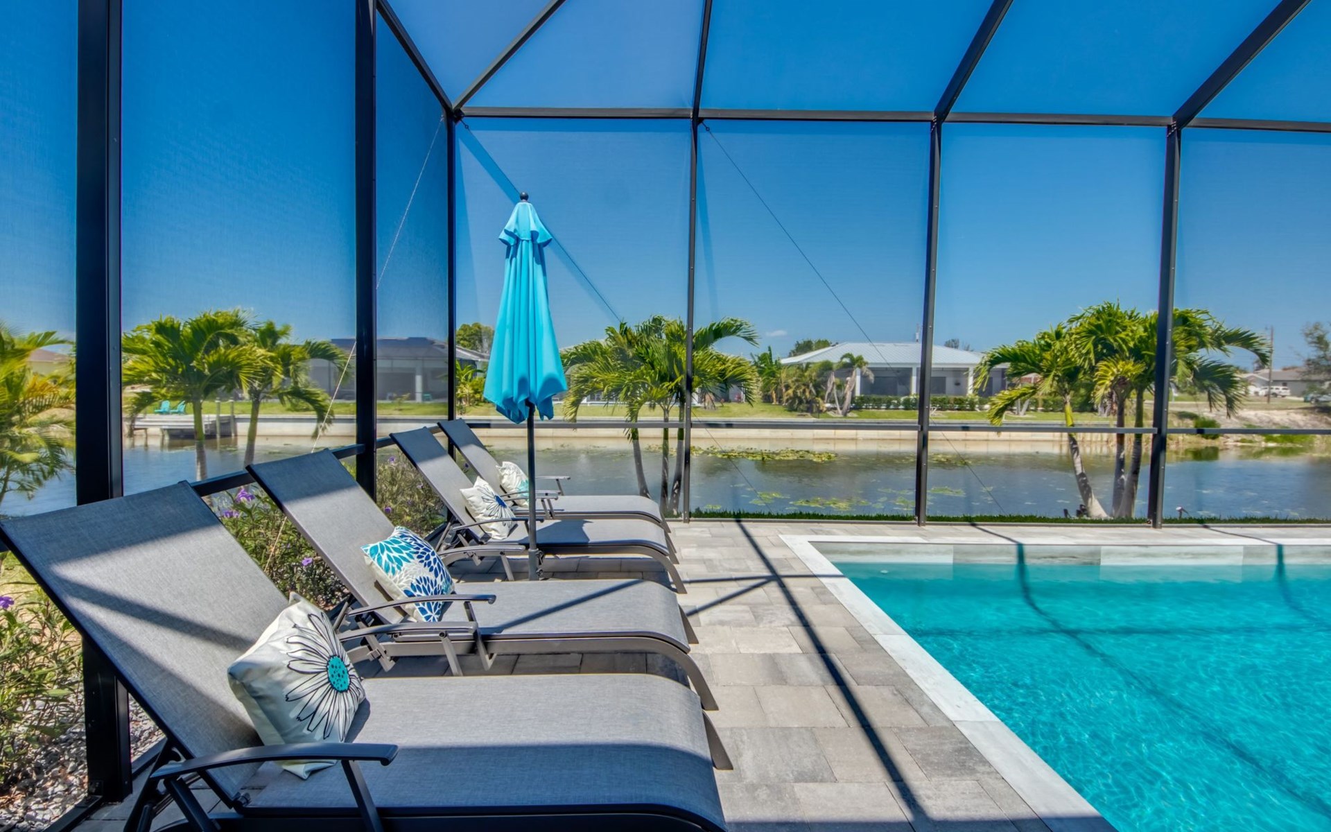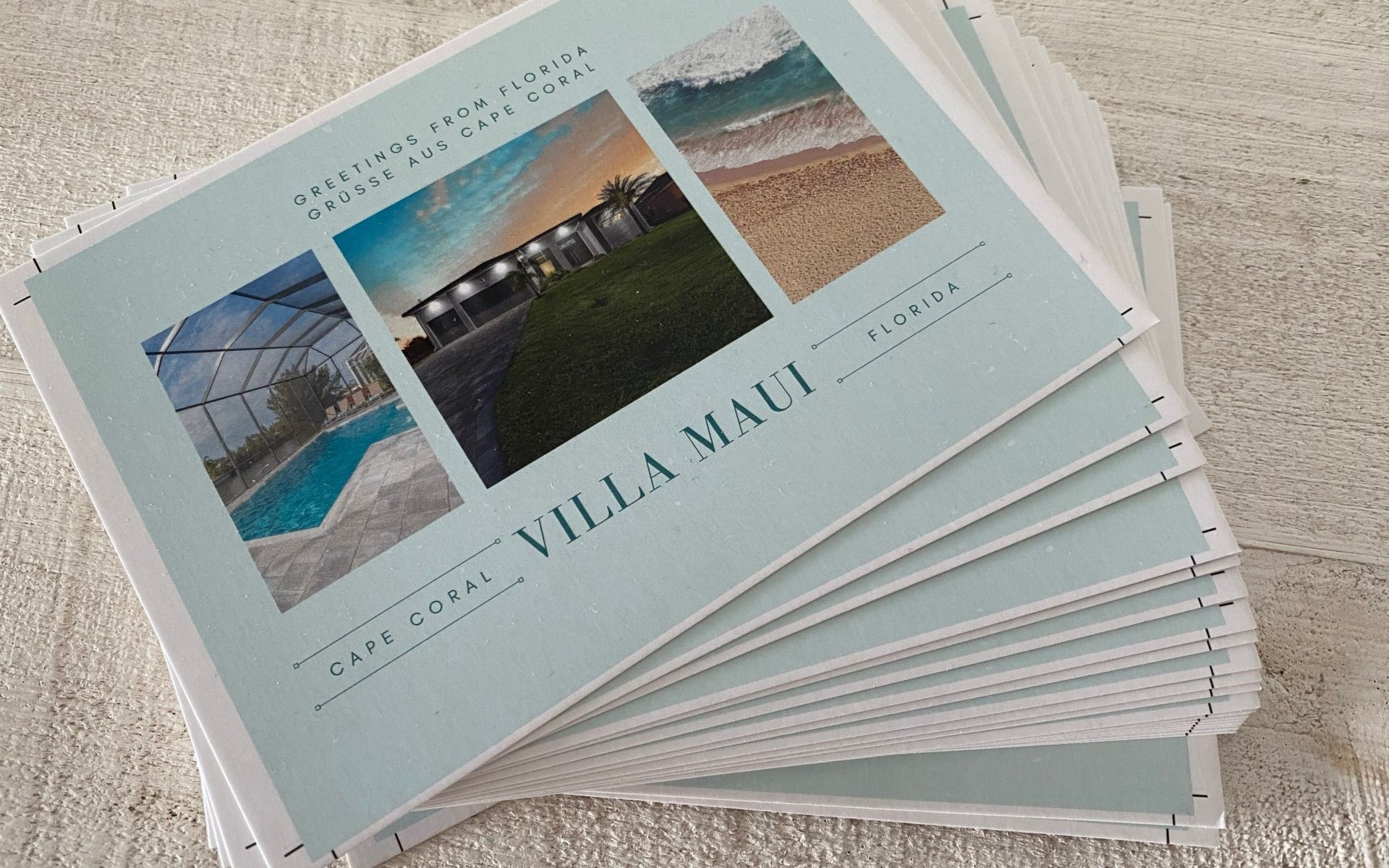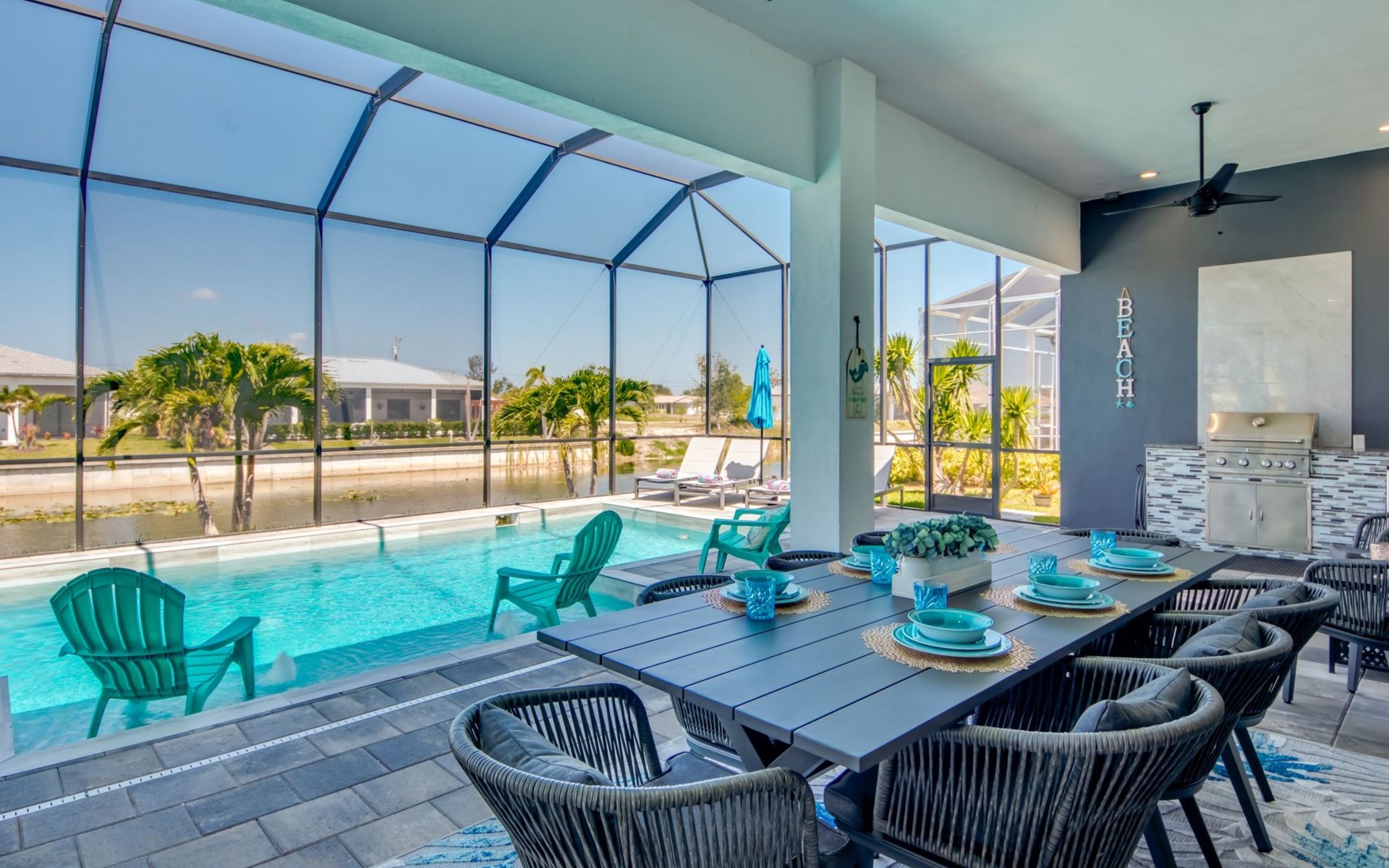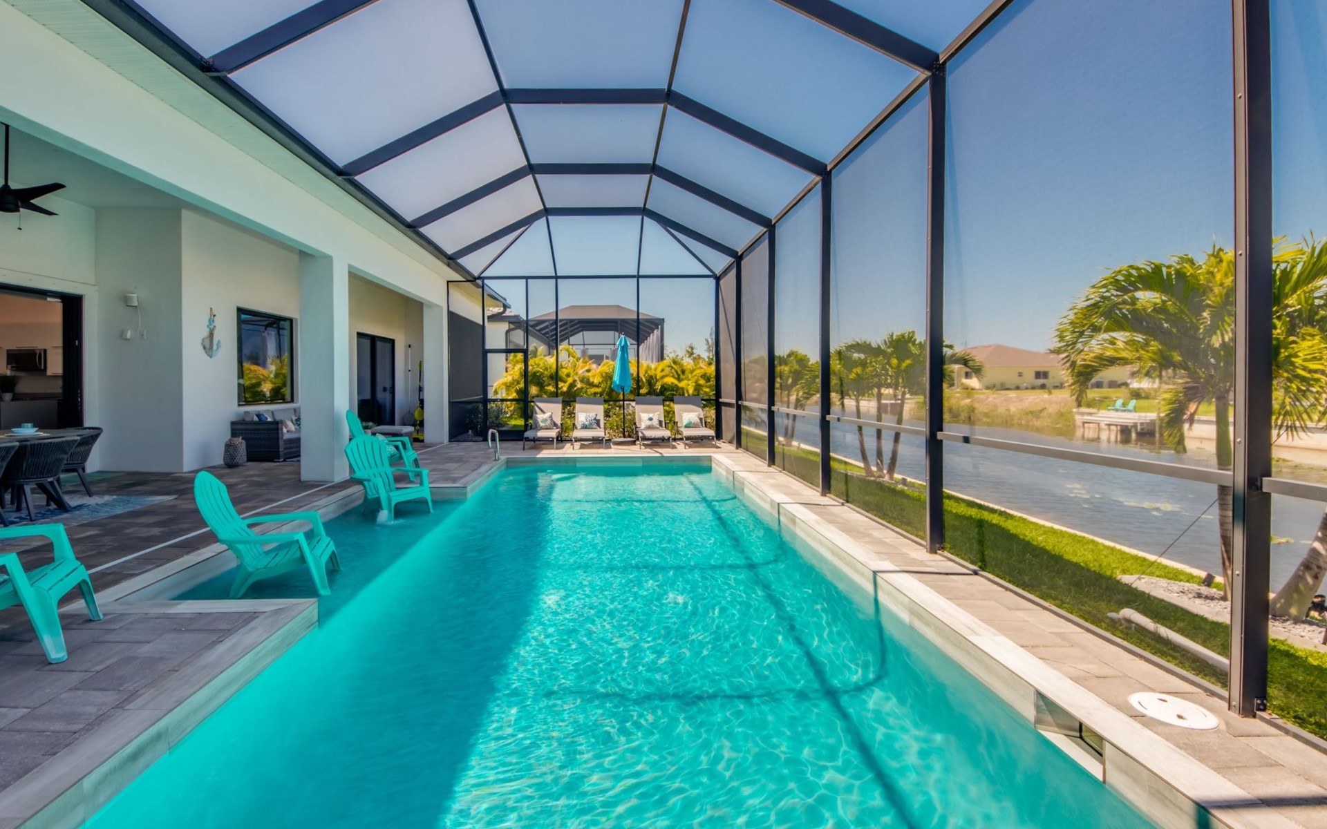 The Villa Maui with heated private pool in the holiday resort of Cape Coral on the west coast of Florida invites you to enjoy a holiday with state-of-the-art facilities and pure luxury in an excellent location with many excursion and shopping opportunities nearby.the Villa Maui was only built in 2019 in a modern style. It is located in a quiet area directly on a south-west facing canal, where you can enjoy the sunset with a view over the canal and experience a wonderful holiday on the Gulf Coast of Florida. Experience the best comfort for your relaxing holiday.Villa Maui is on one level and is approx. 204m² in size.The large, open-plan living room is located in the centre of the house with the open-plan kitchen and spacious dining area. The high ceilings and large windows give the rooms a spacious and bright feel. An oversized fan hangs from the ceiling in the living room.In the living room you will find a large lounge area and a large Smart TV as well as a fireplace.In the open, fully equipped kitchen you will find, among other things:- microwave- oven- French door fridge with freezer compartment and ice cube maker- Food processor- Egg cooker- Nespresso Vertuo coffee machine- Keurig coffee machine- Filter coffee machine- Milk frother- Pots, pans, crockery, cutlery, glasses etc.- Dishwasher- Kettle- Children's crockery and cutleryThe dining area easily seats up to 7-8 people.The windows in the living room and dining area can be blacked out. This ensures privacy, sun protection and privacy at all times.The so-called MASTER AREA is located in the right-hand area.In the master bedroom you have a king-size bed, smart TV, fan, direct pool access and access to the master bathroom. The doors in the master bedroom have electric darkening and an alarm that can be activated if necessary (children).In the master bathroom with natural light, you can shower comfortably in the walk-in rain shower and take a cosy bath in the free-standing bathtub. 2 washbasins, drawers, make-up mirror, hairdryer, towels, bath towels and a separate toilet complete the offer.There are 2 guest rooms and the guest bathroom on the left-hand side of the house.Guest room 1:- large double bed- Access to the pool area- Electric darkening of the doors- Alarm on the doors if required- Smart TV- built-in wardrobe- fanGuest room 2:- large double bed- window- fan- Smart TV- built-in wardrobeGuest bathroom:- Toilet- Walk-in shower with rain shower- Hand towels- Bath towels- Washbasin- Storage facilities- Hairdryer- make-up mirrorOffice/ 3rd guest room- Pull-out sofa- Writing desk- chair- Fan- Blackout blinds on the windowsOf course, we also have something for our younger guests:- free baby cot- baby monitor- high chair- children's cutleryThe Loundry contains the following:- Washing machine- tumble dryer- Ironing board and iron- Hoover- Shopping baskets and bagsThe house has central air conditioning.The pool area is easily accessible from the living room. Experience a breathtaking view over the wide freshwater canal. The plot has beautiful palm trees and we have planted a palm hedge to the neighbouring properties.The heated pool is over 9 metres long and invites you to splash around and relax. The pool area is completely enclosed by a screen. This keeps the mosquitoes away.There are plenty of new sun loungers, cushions and parasols around the pool. A weekly pool service ensures good water quality.A new outdoor kitchen with barbecue, fridge and shelves makes for great barbecue evenings by the pool. Enjoy marvellous sunsets with a view over the canal. Sun worshippers will get their money's worth thanks to the good south-west orientation.There is also a lounge area. A large dining area for up to 10 people and ceiling fans on the terrace round off the offer.New: we have had hurricane shutters installed on the terrace. The shutters not only protect against the storm, but our guests can also adjust them electrically to protect them from the sun, rain and wind on the terrace. Enjoy your holiday to the full.New: TV on the terrace, watch TV in the pool!Bath towels, towels and bed linen are included in the price. Beach chairs and umbrellas for your beach visit can be used free of charge.You can park your car safely in the garage.Please note that security cameras are installed in front of the house at the garage and entrance for your safety. It is not permitted to tamper with the electrics, Wi-Fi router or TV sets!-You can easily access the pool area from the living room. Experience a breathtaking view over the wide fresh water channel. The plot has beautiful palm trees and we have planted a palm hedge to the neighbouring properties.The heated pool is over 9 metres long and invites you to splash around and relax. The pool area is completely enclosed by a screen. This keeps the mosquitoes away.There are plenty of new sun loungers, cushions and parasols around the pool. A weekly pool service ensures good water quality.A new outdoor kitchen with barbecue, fridge and shelves makes for great barbecue evenings by the pool. Enjoy marvellous sunsets with a view over the canal. Sun worshippers will get their money's worth thanks to the good south-west orientation.There is also a lounge area. A large dining area for up to 10 people and ceiling fans on the terrace round off the offer.New: we have had hurricane shutters installed on the terrace. The shutters not only protect against the storm, but our guests can also adjust them electrically to protect them from the sun, rain and wind on the terrace. Enjoy your holiday to the full.Bath towels, towels and bed linen are included in the price. Beach chairs and umbrellas for your beach visit can be used free of charge.The screen protects you from mosquitoes on the terrace.Sunshades, sunbeds and bath towels are available for free use in the house.Various toys and air mattresses may be available on site and a lounge area has been integrated.The front garden was also embellished in October 2021 with new plants an