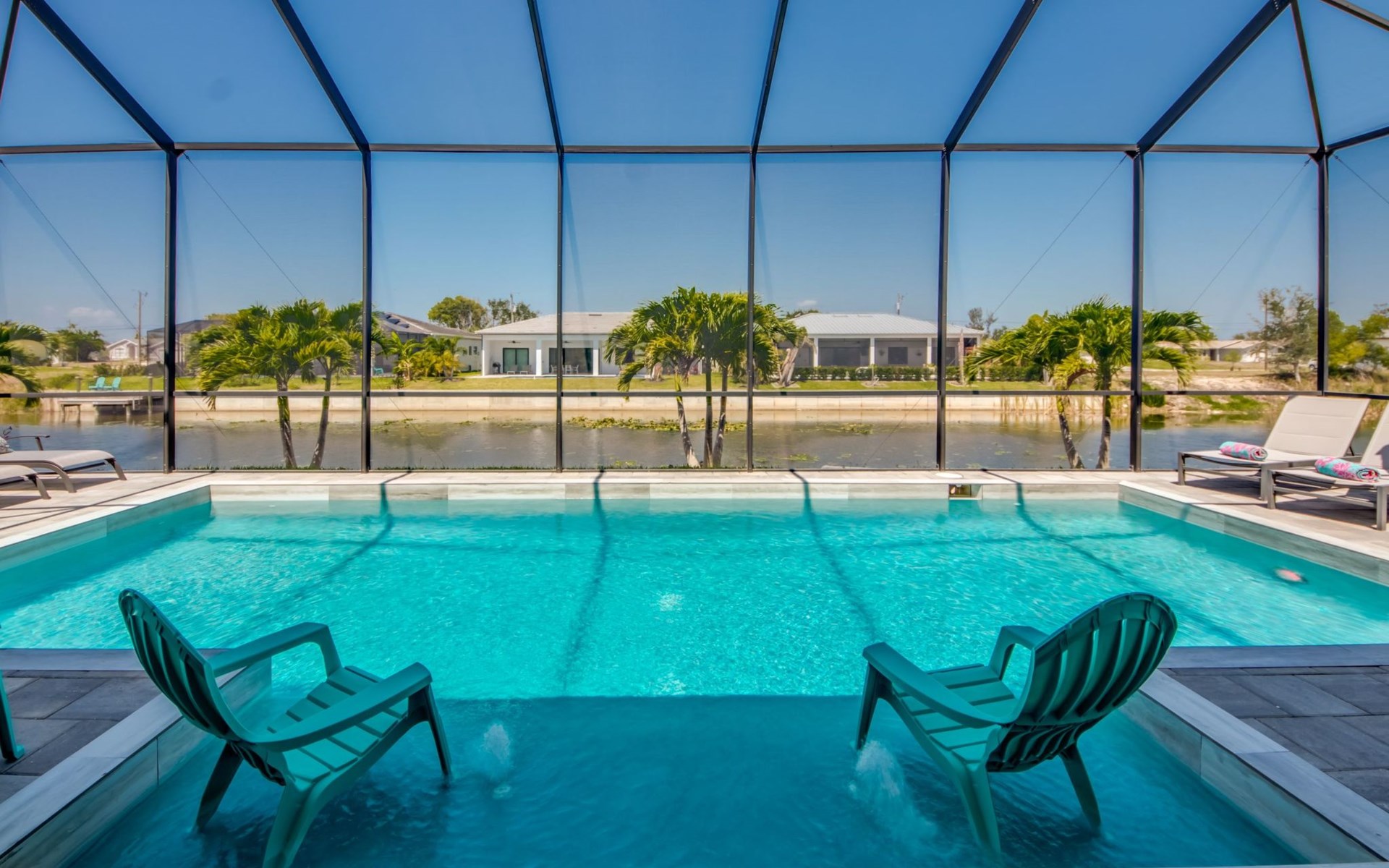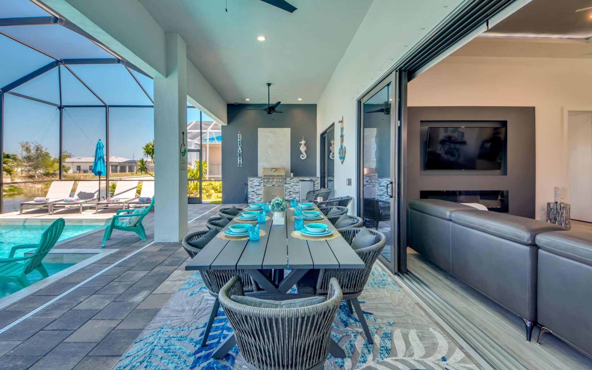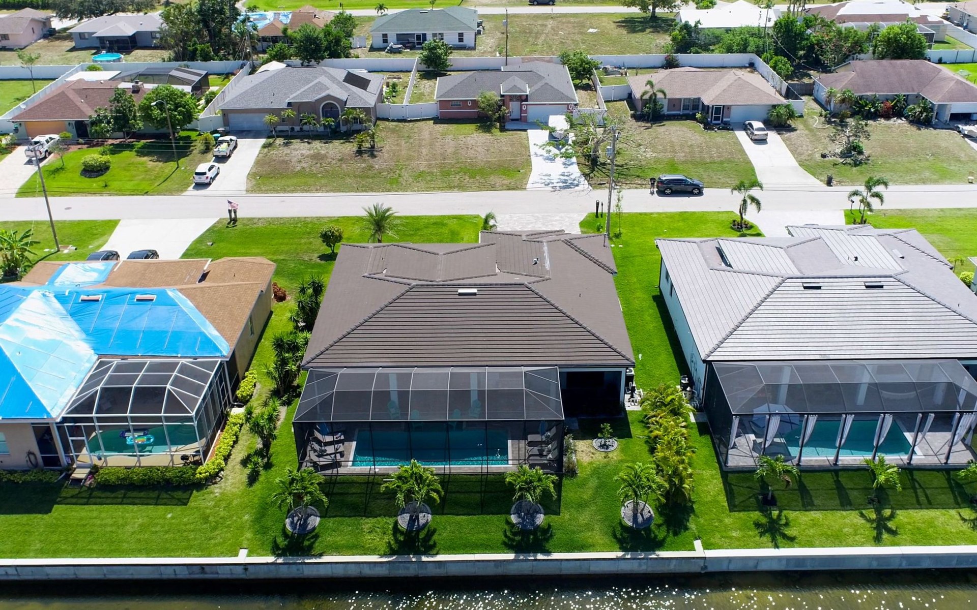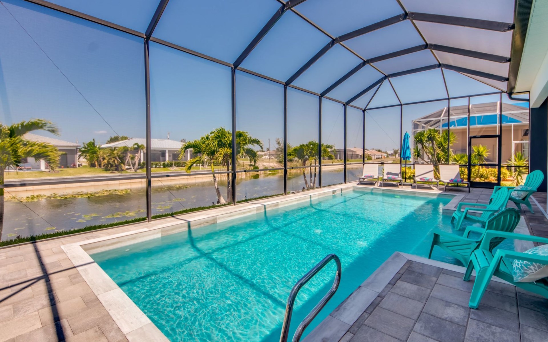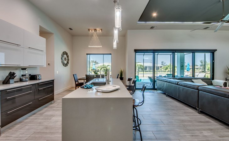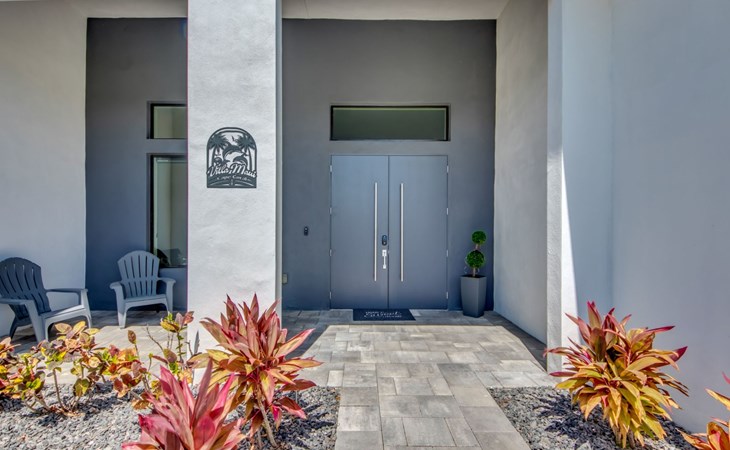 The Villa Maui with heated private pool in the holiday resort of Cape Coral on the west coast of Florida invites you to enjoy a holiday with state-of-the-art facilities and pure luxury in an excellent location with many excursion and shopping opportunities nearby.the Villa Maui was only built in 2019 in a modern style. It is located in a quiet area directly on a south-west facing canal, where you can enjoy the sunset with a view over the canal and experience a wonderful holiday on the Gulf Coast of Florida. Experience the best comfort for your relaxing holiday.Villa Maui is on one level and is approx. 204m² in size.The large, open-plan living room is located in the centre of the house with the open-plan kitchen and spacious dining area. The high ceilings and large windows give the rooms a spacious and bright feel. An oversized fan hangs from the ceiling in the living room.In the living room you will find a large lounge area and a large Smart TV as well as a fireplace.In the open, fully equipped kitchen you will find, among other things:- microwave- oven- French door fridge with freezer compartment and ice cube maker- Food processor- Egg cooker- Nespresso Vertuo coffee machine- Keurig coffee machine- Filter coffee machine- Milk frother- Pots, pans, crockery, cutlery, glasses etc.- Dishwasher- Kettle- Children's crockery and cutleryThe dining area easily seats up to 7-8 people.The windows in the living room and dining area can be blacked out. This ensures privacy, sun protection and privacy at all times.The so-called MASTER AREA is located in the right-hand area.In the master bedroom you have a king-size bed, smart TV, fan, direct pool access and access to the master bathroom. The doors in the master bedroom have electric darkening and an alarm that can be activated if necessary (children).In the master bathroom with natural light, you can shower comfortably in the walk-in rain shower and take a cosy bath in the free-standing bathtub. 2 washbasins, drawers, make-up mirror, hairdryer, towels, bath towels and a separate toilet complete the offer.There are 2 guest rooms and the guest bathroom on the left-hand side of the house.Guest room 1:- large double bed- Access to the pool area- Electric darkening of the doors- Alarm on the doors if required- Smart TV- built-in wardrobe- fanGuest room 2:- large double bed- window- fan- Smart TV- built-in wardrobeGuest bathroom:- Toilet- Walk-in shower with rain shower- Hand towels- Bath towels- Washbasin- Storage facilities- Hairdryer- make-up mirrorOffice/ 3rd guest room- Pull-out sofa- Writing desk- chair- Fan- Blackout blinds on the windowsOf course, we also have something for our younger guests:- free baby cot- baby monitor- high chair- children's cutleryThe Loundry contains the following:- Washing machine- tumble dryer- Ironing board and iron- Hoover- Shopping baskets and bagsThe house has central air conditioning.The pool area is easily accessible from the living room. Experience a breathtaking view over the wide freshwater canal. The plot has beautiful palm trees and we have planted a palm hedge to the neighbouring properties.The heated pool is over 9 metres long and invites you to splash around and relax. The pool area is completely enclosed by a screen. This keeps the mosquitoes away.There are plenty of new sun loungers, cushions and parasols around the pool. A weekly pool service ensures good water quality.A new outdoor kitchen with barbecue, fridge and shelves makes for great barbecue evenings by the pool. Enjoy marvellous sunsets with a view over the canal. Sun worshippers will get their money's worth thanks to the good south-west orientation.There is also a lounge area. A large dining area for up to 10 people and ceiling fans on the terrace round off the offer.New: we have had hurricane shutters installed on the terrace. The shutters not only protect against the storm, but our guests can also adjust them electrically to protect them from the sun, rain and wind on the terrace. Enjoy your holiday to the full.New: TV on the terrace, watch TV in the pool!Bath towels, towels and bed linen are included in the price. Beach chairs and umbrellas for your beach visit can be used free of charge.You can park your car safely in the garage.Please note that security cameras are installed in front of the house at the garage and entrance for your safety. It is not permitted to tamper with the electrics, Wi-Fi router or TV sets!-You can easily access the pool area from the living room. Experience a breathtaking view over the wide fresh water channel. The plot has beautiful palm trees and we have planted a palm hedge to the neighbouring properties.The heated pool is over 9 metres long and invites you to splash around and relax. The pool area is completely enclosed by a screen. This keeps the mosquitoes away.There are plenty of new sun loungers, cushions and parasols around the pool. A weekly pool service ensures good water quality.A new outdoor kitchen with barbecue, fridge and shelves makes for great barbecue evenings by the pool. Enjoy marvellous sunsets with a view over the canal. Sun worshippers will get their money's worth thanks to the good south-west orientation.There is also a lounge area. A large dining area for up to 10 people and ceiling fans on the terrace round off the offer.New: we have had hurricane shutters installed on the terrace. The shutters not only protect against the storm, but our guests can also adjust them electrically to protect them from the sun, rain and wind on the terrace. Enjoy your holiday to the full.Bath towels, towels and bed linen are included in the price. Beach chairs and umbrellas for your beach visit can be used free of charge.The screen protects you from mosquitoes on the terrace.Sunshades, sunbeds and bath towels are available for free use in the house.Various toys and air mattresses may be available on site and a lounge area has been integrated.The front garden was also embellished in October 2021 with new plants an