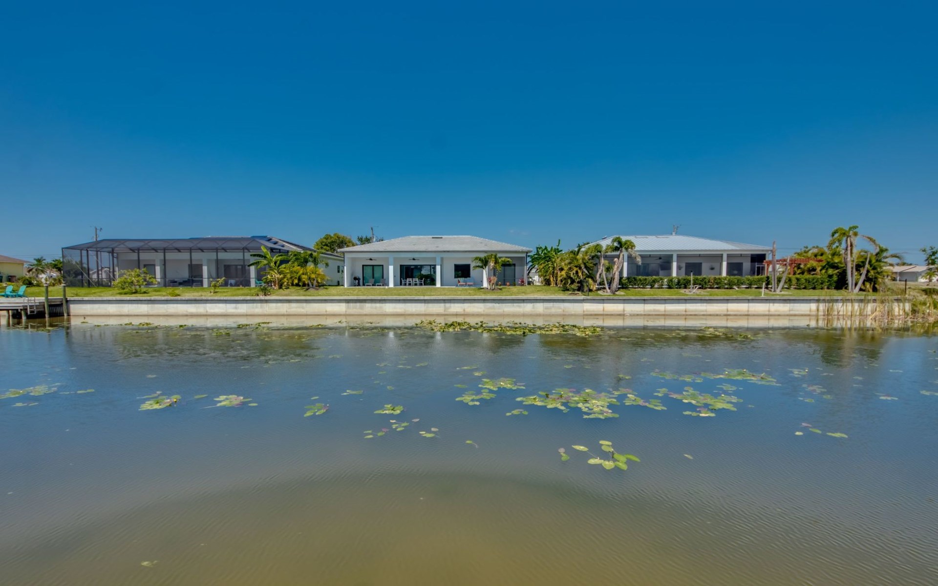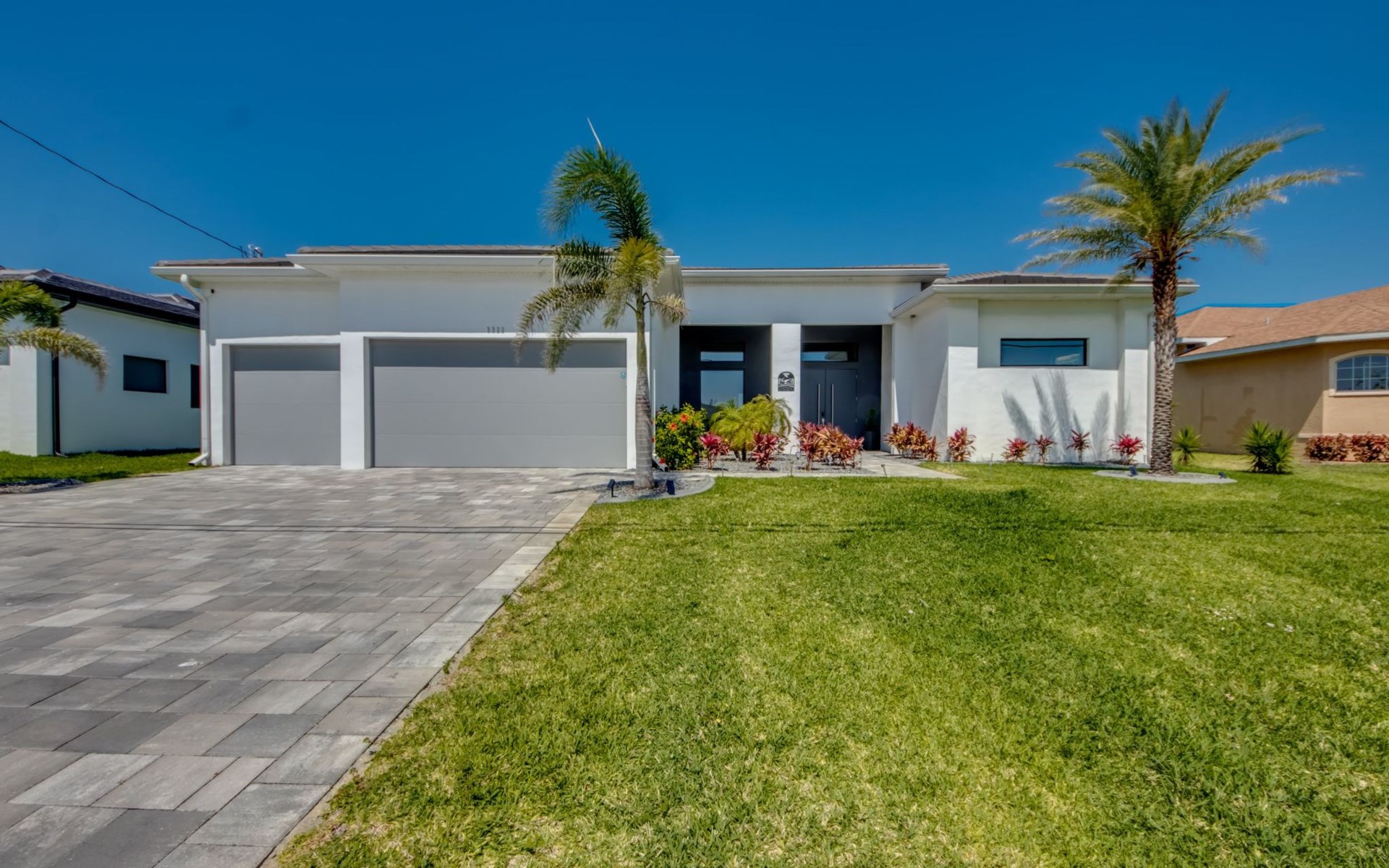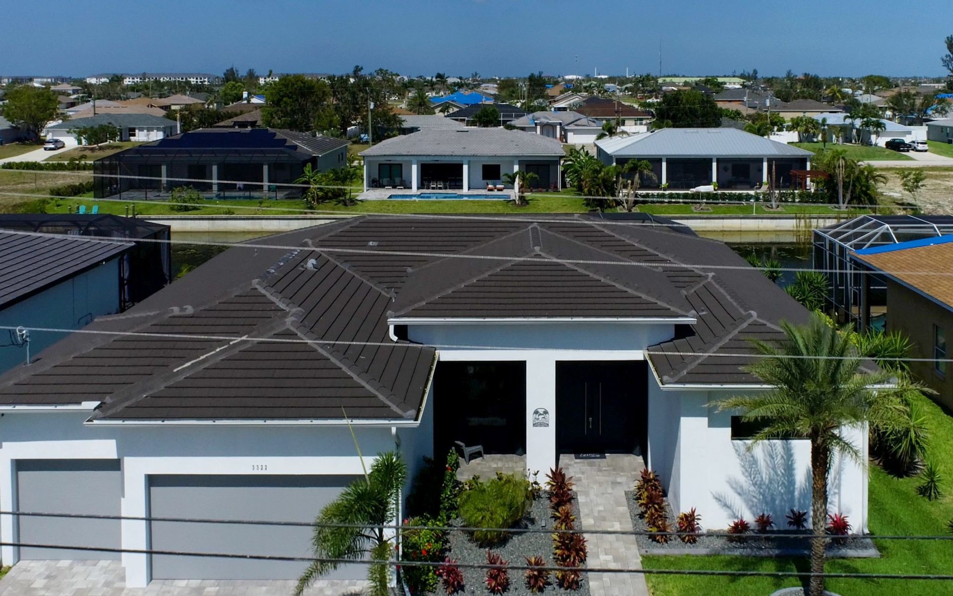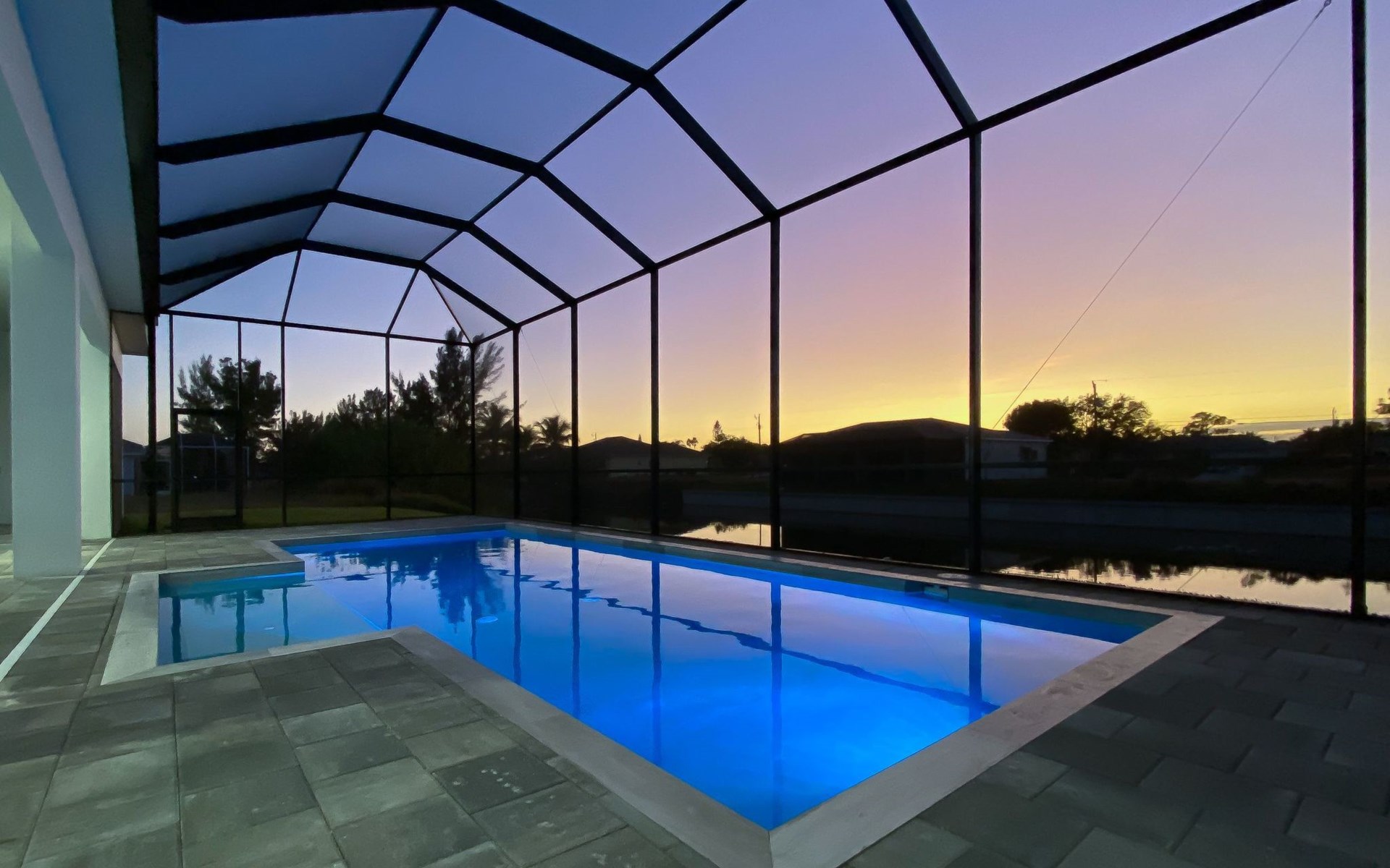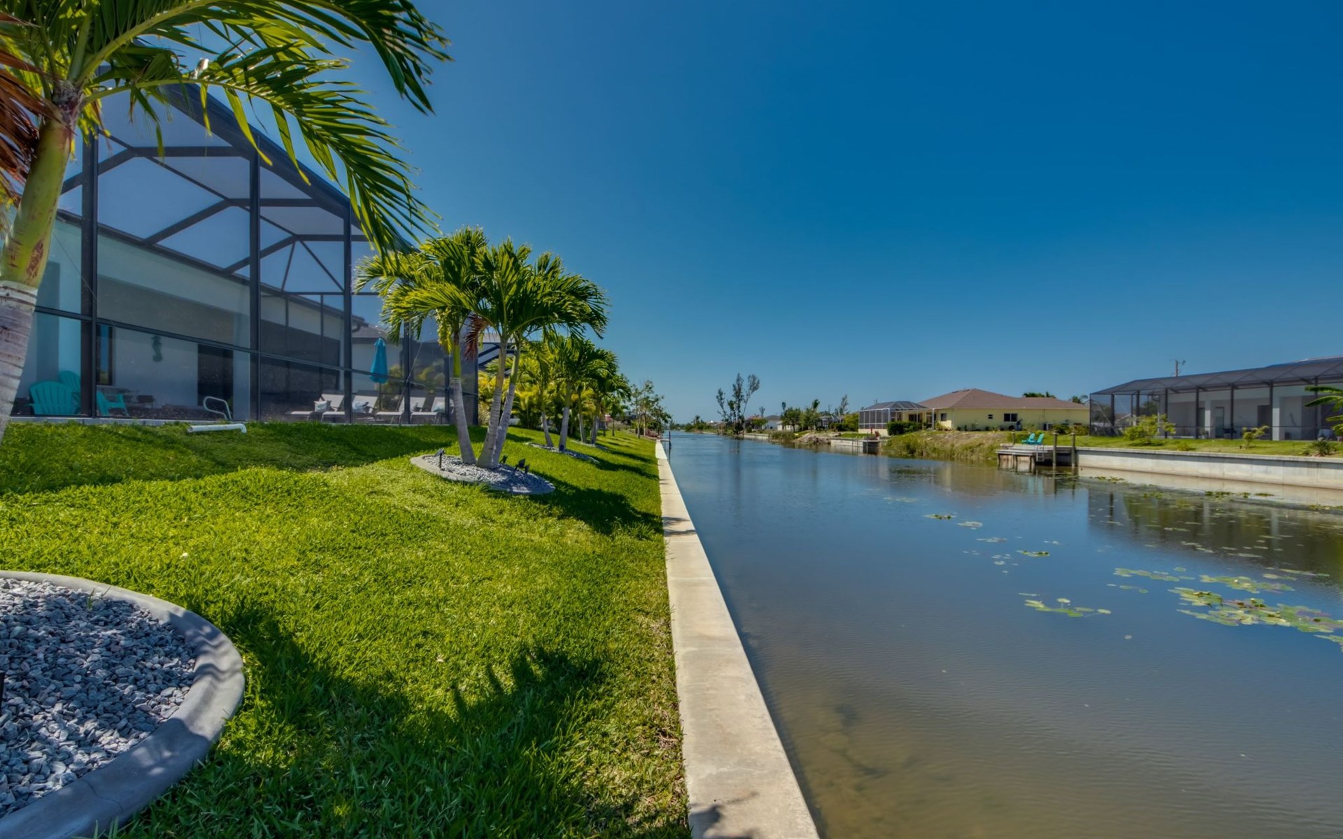 The Villa Maui with heated private pool in the holiday resort of Cape Coral on the west coast of Florida invites you to enjoy a holiday with state-of-the-art facilities and pure luxury in an excellent location with many excursion and shopping opportunities nearby.the Villa Maui was only built in 2019 in a modern style. It is located in a quiet area directly on a south-west facing canal, where you can enjoy the sunset with a view over the canal and experience a wonderful holiday on the Gulf Coast of Florida. Experience the best comfort for your relaxing holiday.Villa Maui is on one level and is approx. 204m² in size.The large, open-plan living room is located in the centre of the house with the open-plan kitchen and spacious dining area. The high ceilings and large windows give the rooms a spacious and bright feel. An oversized fan hangs from the ceiling in the living room.In the living room you will find a large lounge area and a large Smart TV as well as a fireplace.In the open, fully equipped kitchen you will find, among other things:- microwave- oven- French door fridge with freezer compartment and ice cube maker- Food processor- Egg cooker- Nespresso Vertuo coffee machine- Keurig coffee machine- Filter coffee machine- Milk frother- Pots, pans, crockery, cutlery, glasses etc.- Dishwasher- Kettle- Children's crockery and cutleryThe dining area easily seats up to 7-8 people.The windows in the living room and dining area can be blacked out. This ensures privacy, sun protection and privacy at all times.The so-called MASTER AREA is located in the right-hand area.In the master bedroom you have a king-size bed, smart TV, fan, direct pool access and access to the master bathroom. The doors in the master bedroom have electric darkening and an alarm that can be activated if necessary (children).In the master bathroom with natural light, you can shower comfortably in the walk-in rain shower and take a cosy bath in the free-standing bathtub. 2 washbasins, drawers, make-up mirror, hairdryer, towels, bath towels and a separate toilet complete the offer.There are 2 guest rooms and the guest bathroom on the left-hand side of the house.Guest room 1:- large double bed- Access to the pool area- Electric darkening of the doors- Alarm on the doors if required- Smart TV- built-in wardrobe- fanGuest room 2:- large double bed- window- fan- Smart TV- built-in wardrobeGuest bathroom:- Toilet- Walk-in shower with rain shower- Hand towels- Bath towels- Washbasin- Storage facilities- Hairdryer- make-up mirrorOffice/ 3rd guest room- Pull-out sofa- Writing desk- chair- Fan- Blackout blinds on the windowsOf course, we also have something for our younger guests:- free baby cot- baby monitor- high chair- children's cutleryThe Loundry contains the following:- Washing machine- tumble dryer- Ironing board and iron- Hoover- Shopping baskets and bagsThe house has central air conditioning.The pool area is easily accessible from the living room. Experience a breathtaking view over the wide freshwater canal. The plot has beautiful palm trees and we have planted a palm hedge to the neighbouring properties.The heated pool is over 9 metres long and invites you to splash around and relax. The pool area is completely enclosed by a screen. This keeps the mosquitoes away.There are plenty of new sun loungers, cushions and parasols around the pool. A weekly pool service ensures good water quality.A new outdoor kitchen with barbecue, fridge and shelves makes for great barbecue evenings by the pool. Enjoy marvellous sunsets with a view over the canal. Sun worshippers will get their money's worth thanks to the good south-west orientation.There is also a lounge area. A large dining area for up to 10 people and ceiling fans on the terrace round off the offer.New: we have had hurricane shutters installed on the terrace. The shutters not only protect against the storm, but our guests can also adjust them electrically to protect them from the sun, rain and wind on the terrace. Enjoy your holiday to the full.New: TV on the terrace, watch TV in the pool!Bath towels, towels and bed linen are included in the price. Beach chairs and umbrellas for your beach visit can be used free of charge.You can park your car safely in the garage.Please note that security cameras are installed in front of the house at the garage and entrance for your safety. It is not permitted to tamper with the electrics, Wi-Fi router or TV sets!-You can easily access the pool area from the living room. Experience a breathtaking view over the wide fresh water channel. The plot has beautiful palm trees and we have planted a palm hedge to the neighbouring properties.The heated pool is over 9 metres long and invites you to splash around and relax. The pool area is completely enclosed by a screen. This keeps the mosquitoes away.There are plenty of new sun loungers, cushions and parasols around the pool. A weekly pool service ensures good water quality.A new outdoor kitchen with barbecue, fridge and shelves makes for great barbecue evenings by the pool. Enjoy marvellous sunsets with a view over the canal. Sun worshippers will get their money's worth thanks to the good south-west orientation.There is also a lounge area. A large dining area for up to 10 people and ceiling fans on the terrace round off the offer.New: we have had hurricane shutters installed on the terrace. The shutters not only protect against the storm, but our guests can also adjust them electrically to protect them from the sun, rain and wind on the terrace. Enjoy your holiday to the full.Bath towels, towels and bed linen are included in the price. Beach chairs and umbrellas for your beach visit can be used free of charge.The screen protects you from mosquitoes on the terrace.Sunshades, sunbeds and bath towels are available for free use in the house.Various toys and air mattresses may be available on site and a lounge area has been integrated.The front garden was also embellished in October 2021 with new plants an